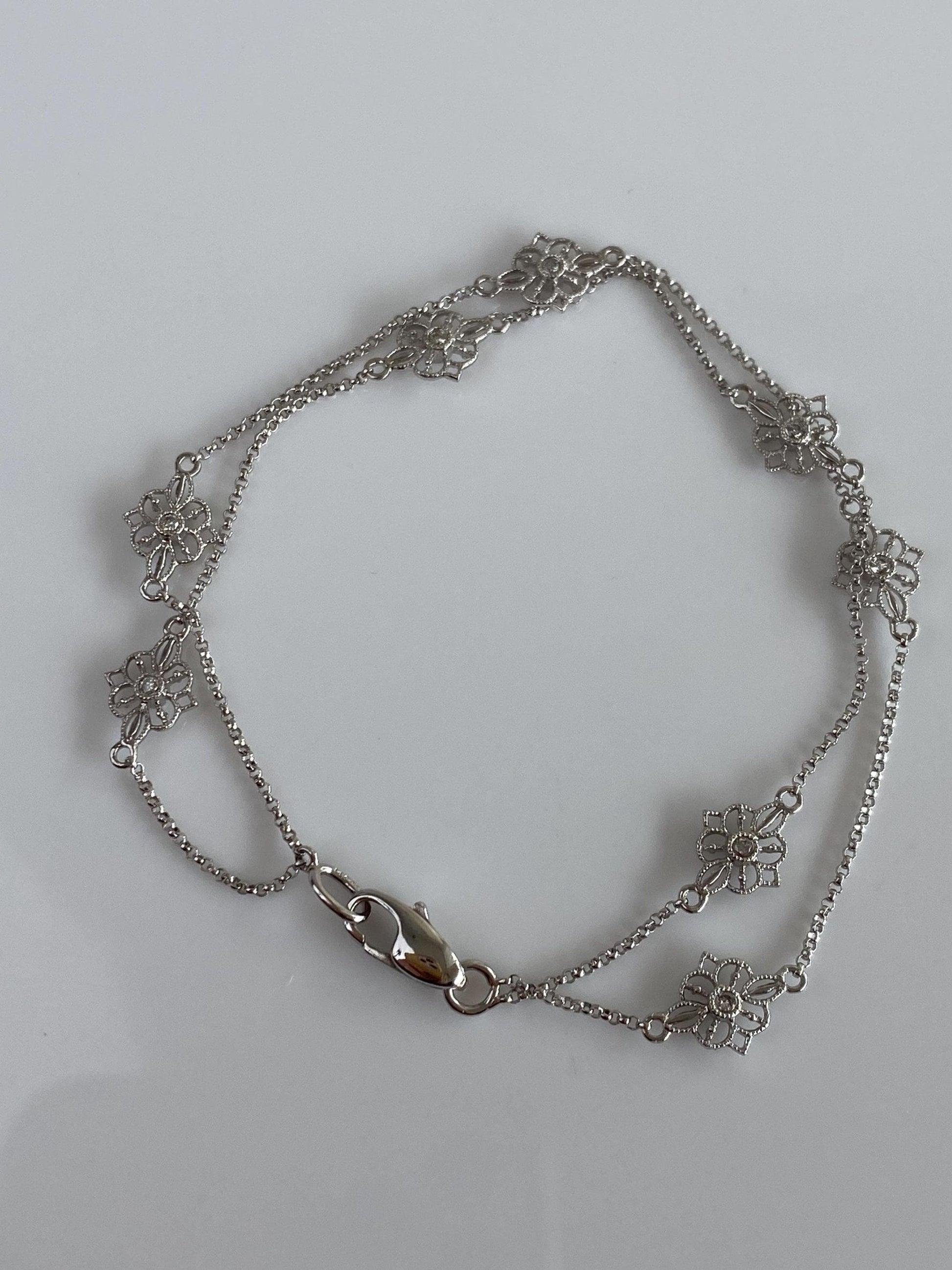 Vintage Solid 14k White Gold Diamond Flower Link Rolo Chain Double Strand Bracelet - 7.25 inches