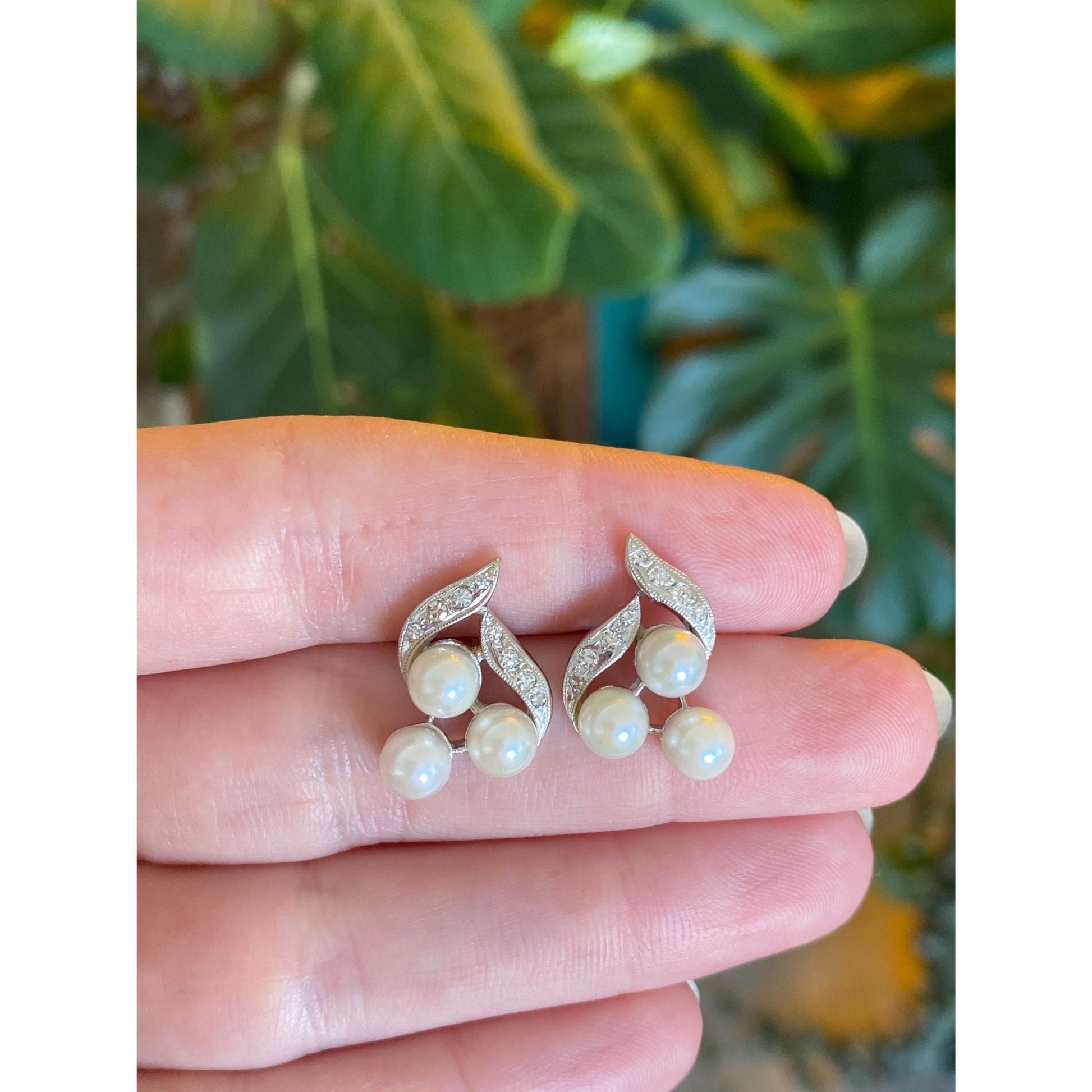 Vintage Solid 14k White Gold Diamond Pearl Stud Earrings