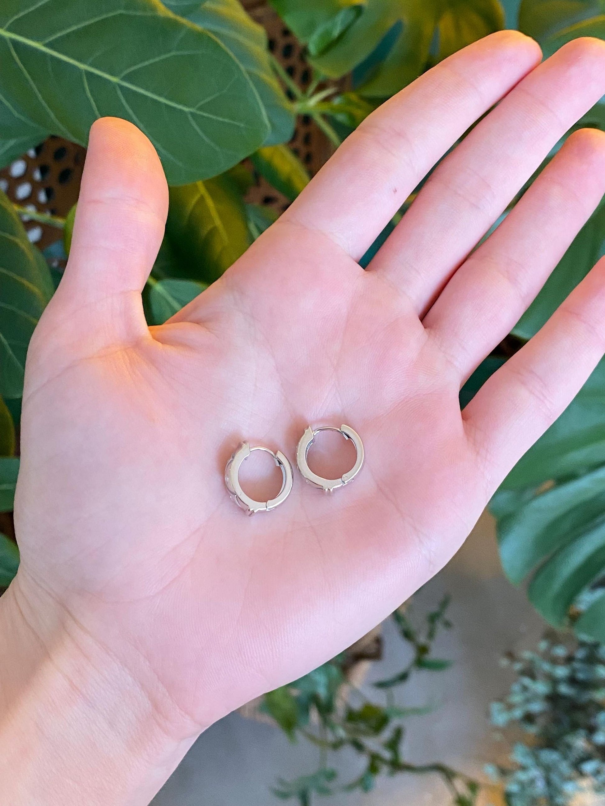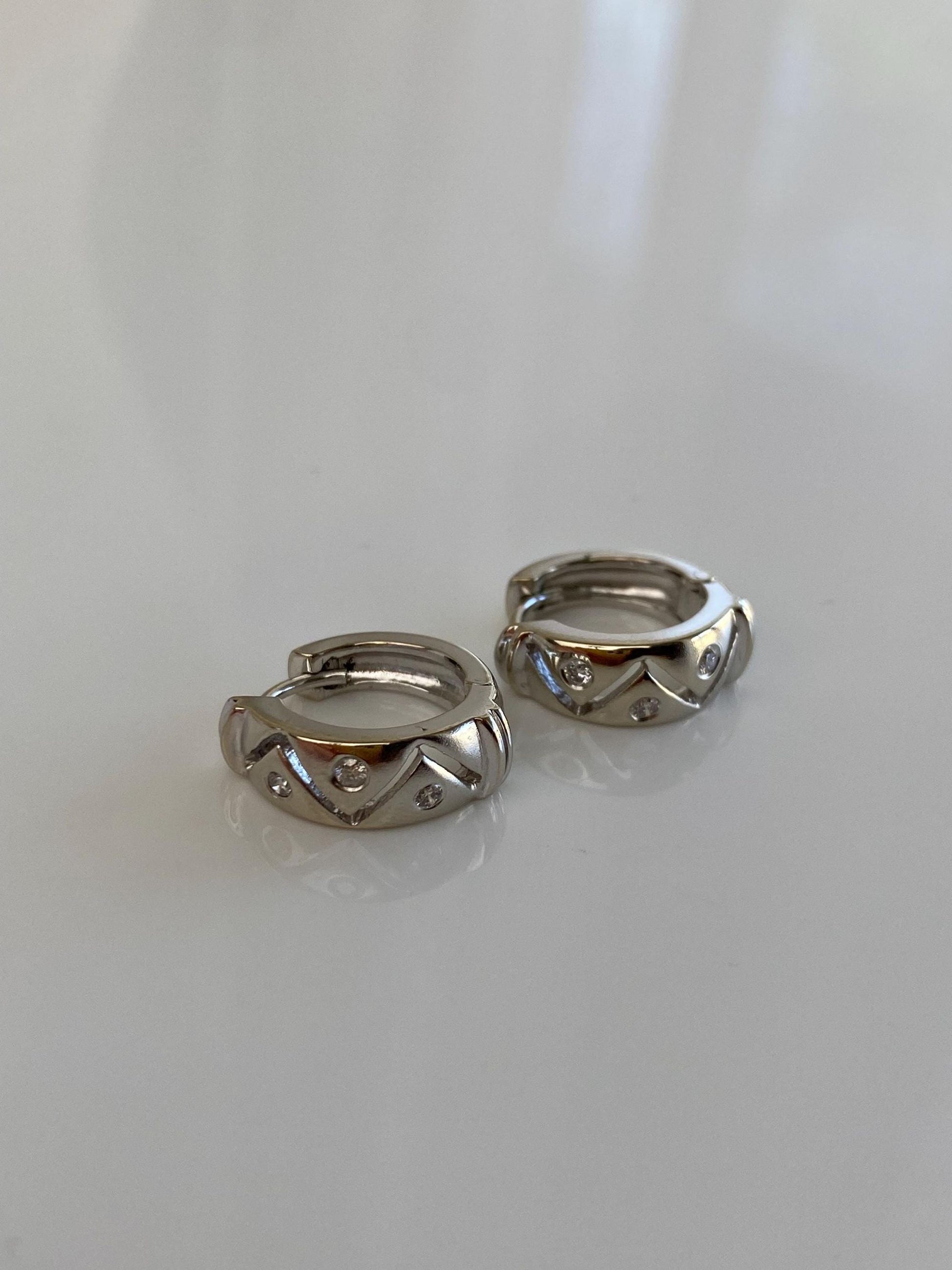 Vintage Solid 14k White Gold Diamond Zig Zag Hoop Earrings
