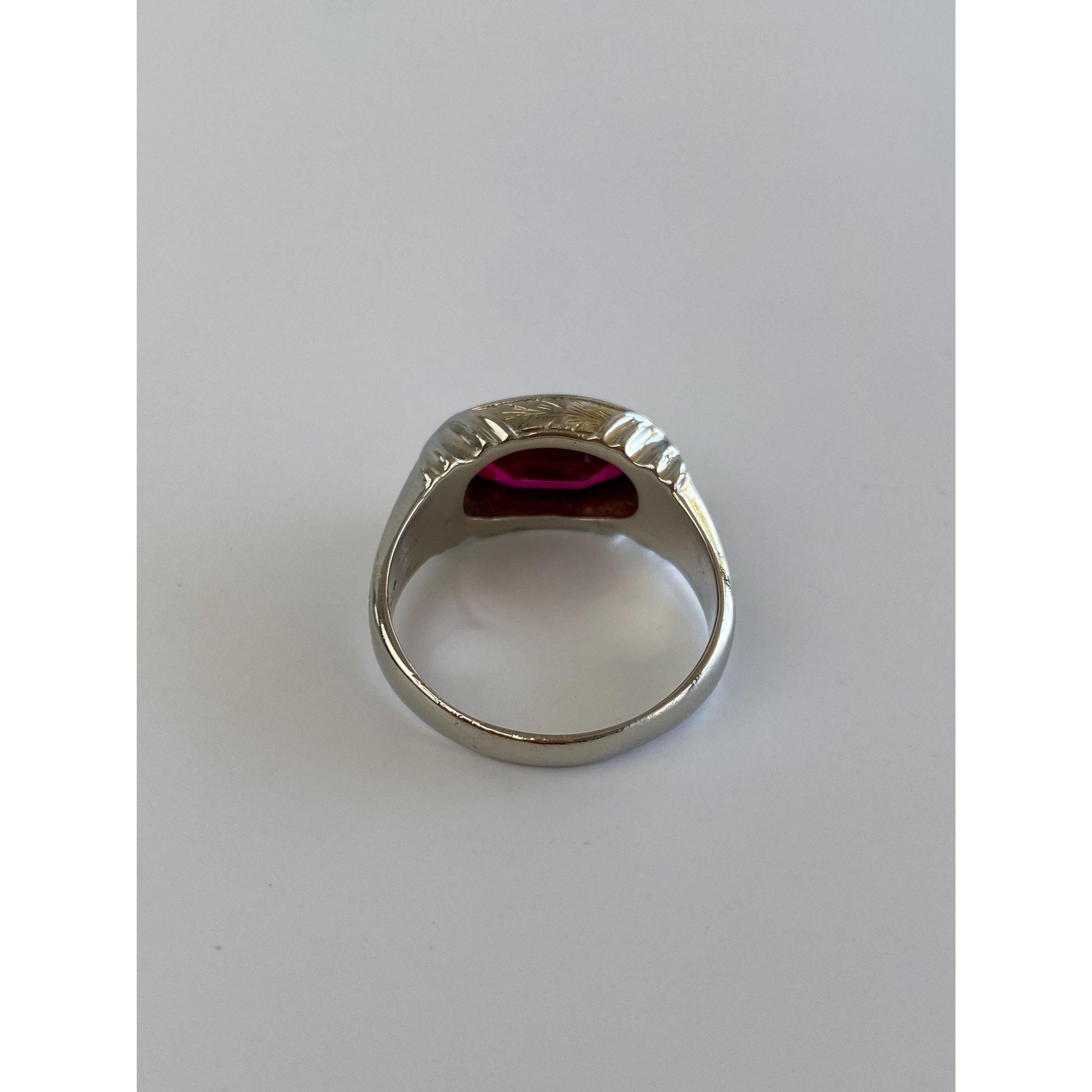 Vintage Solid 14k White Gold Pink Sapphire Engraved Signet Ring - Size 9.75