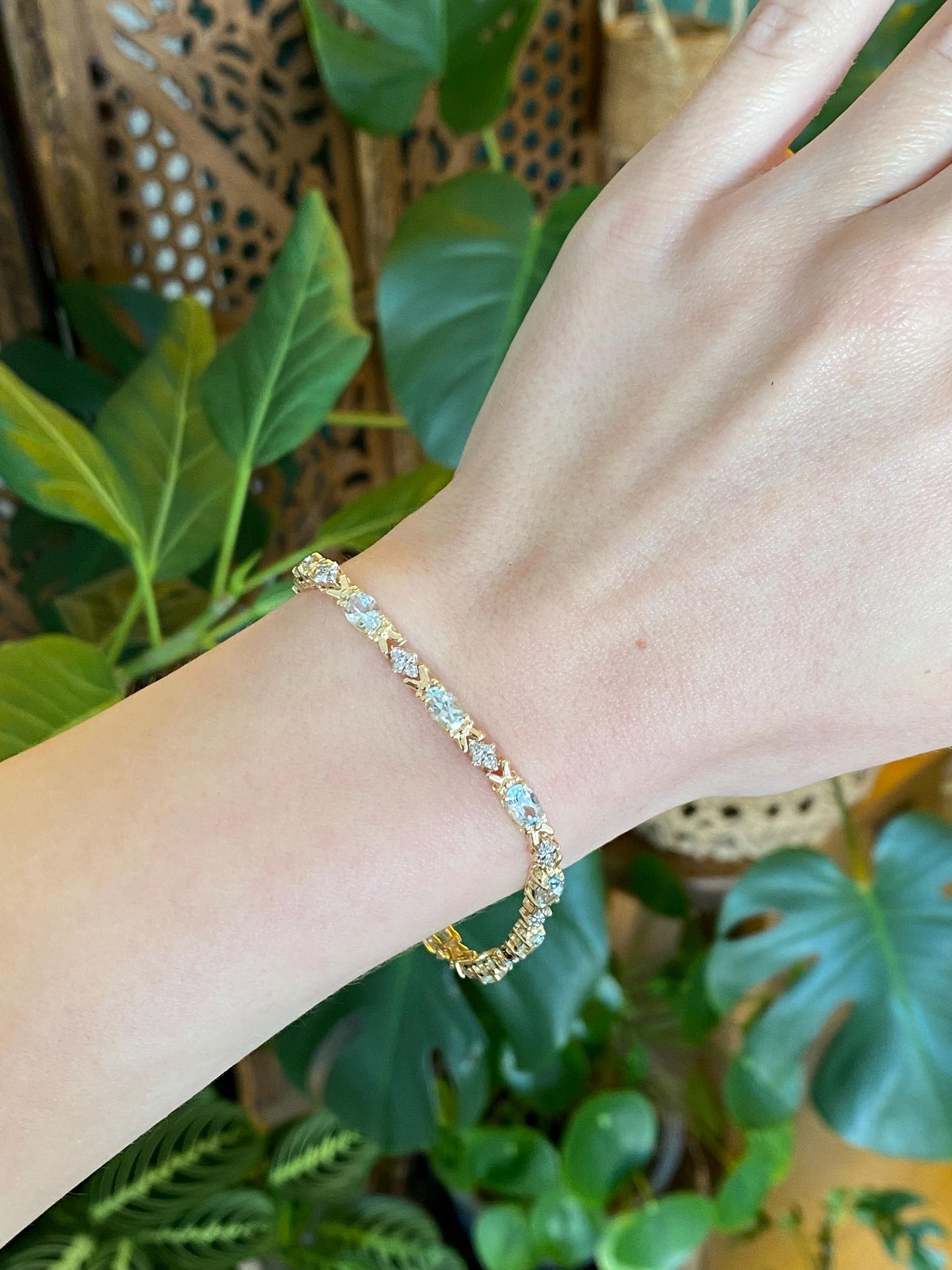 Vintage Solid 14k White & Yellow Gold Diamond Aquamarine Link Bracelet - 7.5 inches