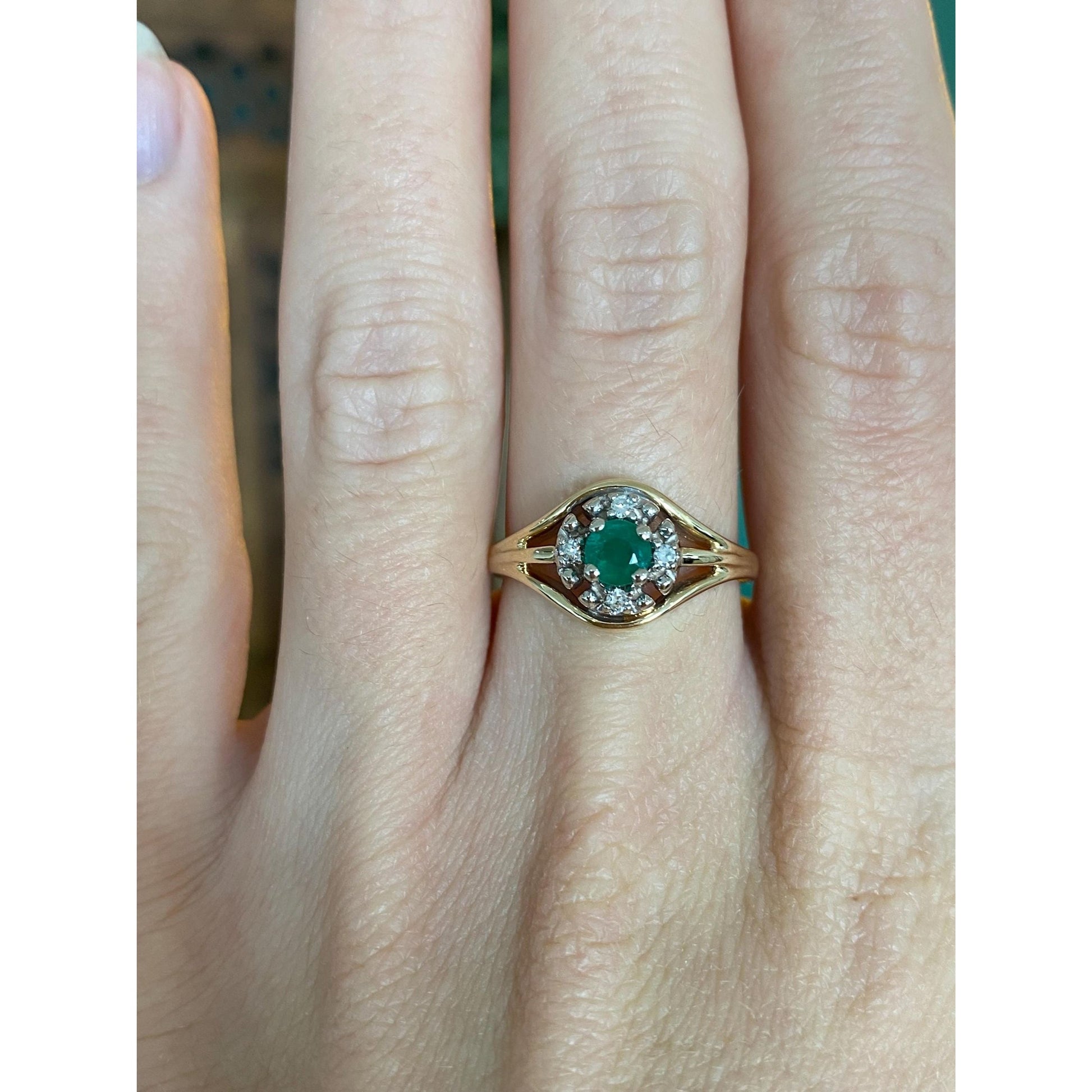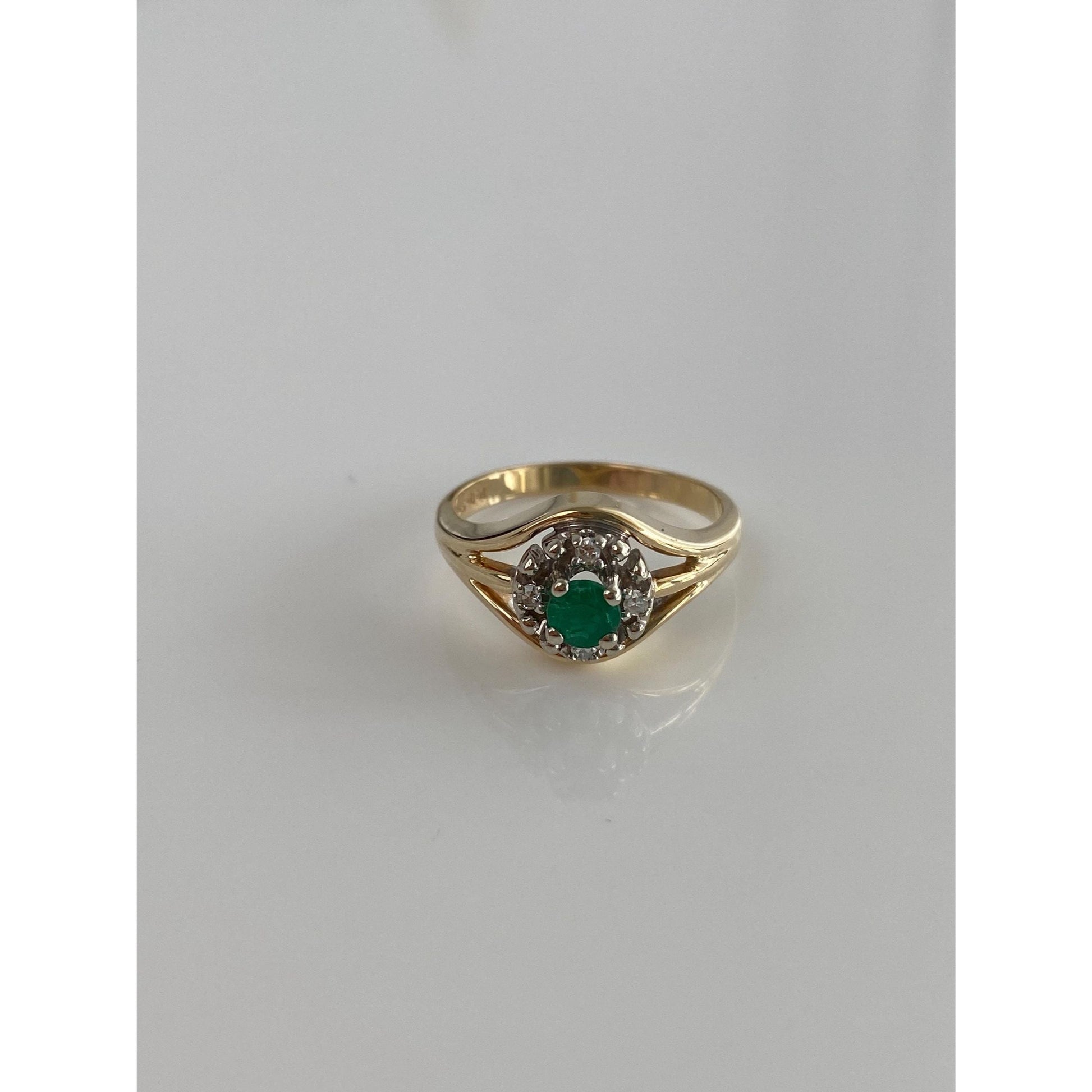 Vintage Solid 14k White & Yellow Gold Diamond Halo Emerald Ring - Size 7.25