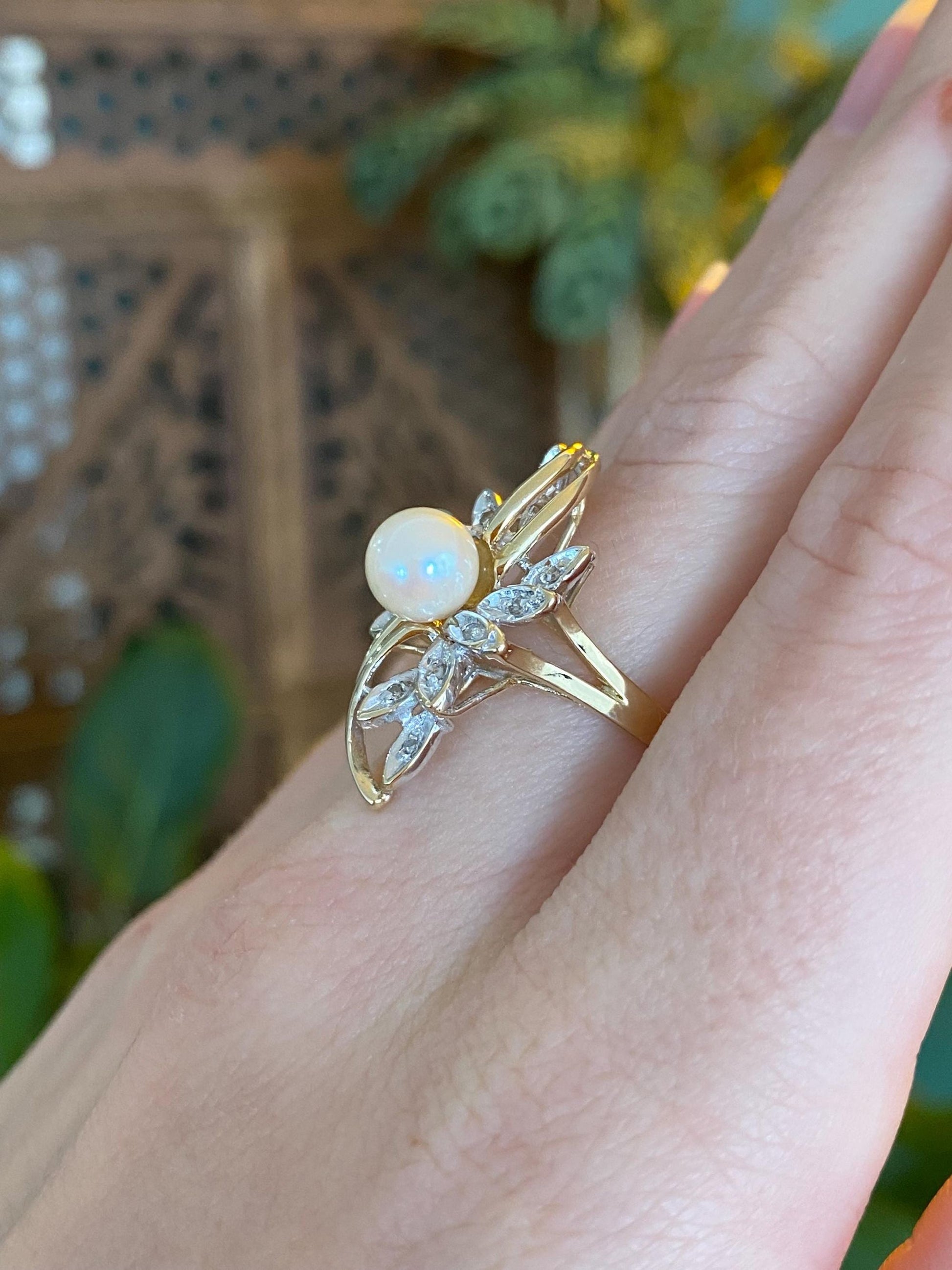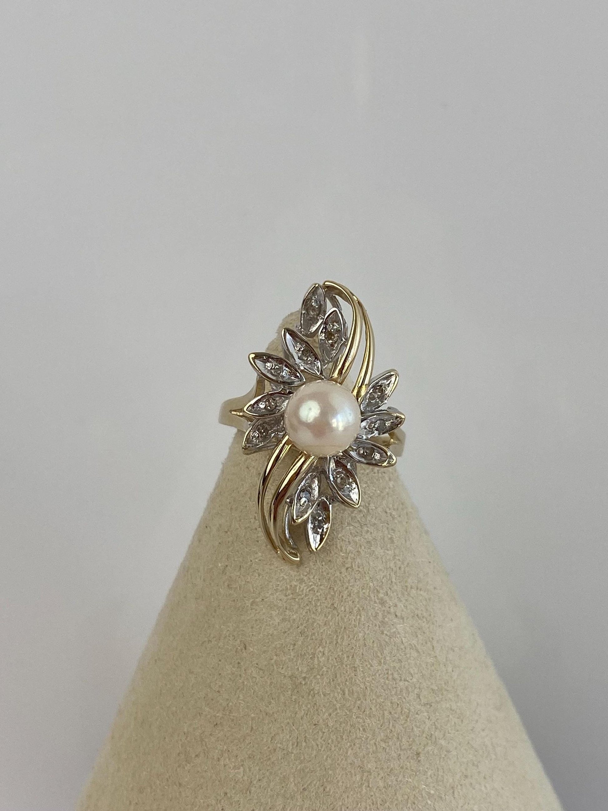 Vintage Solid 14k White & Yellow Gold Pearl Diamond Ring - Size 6.75