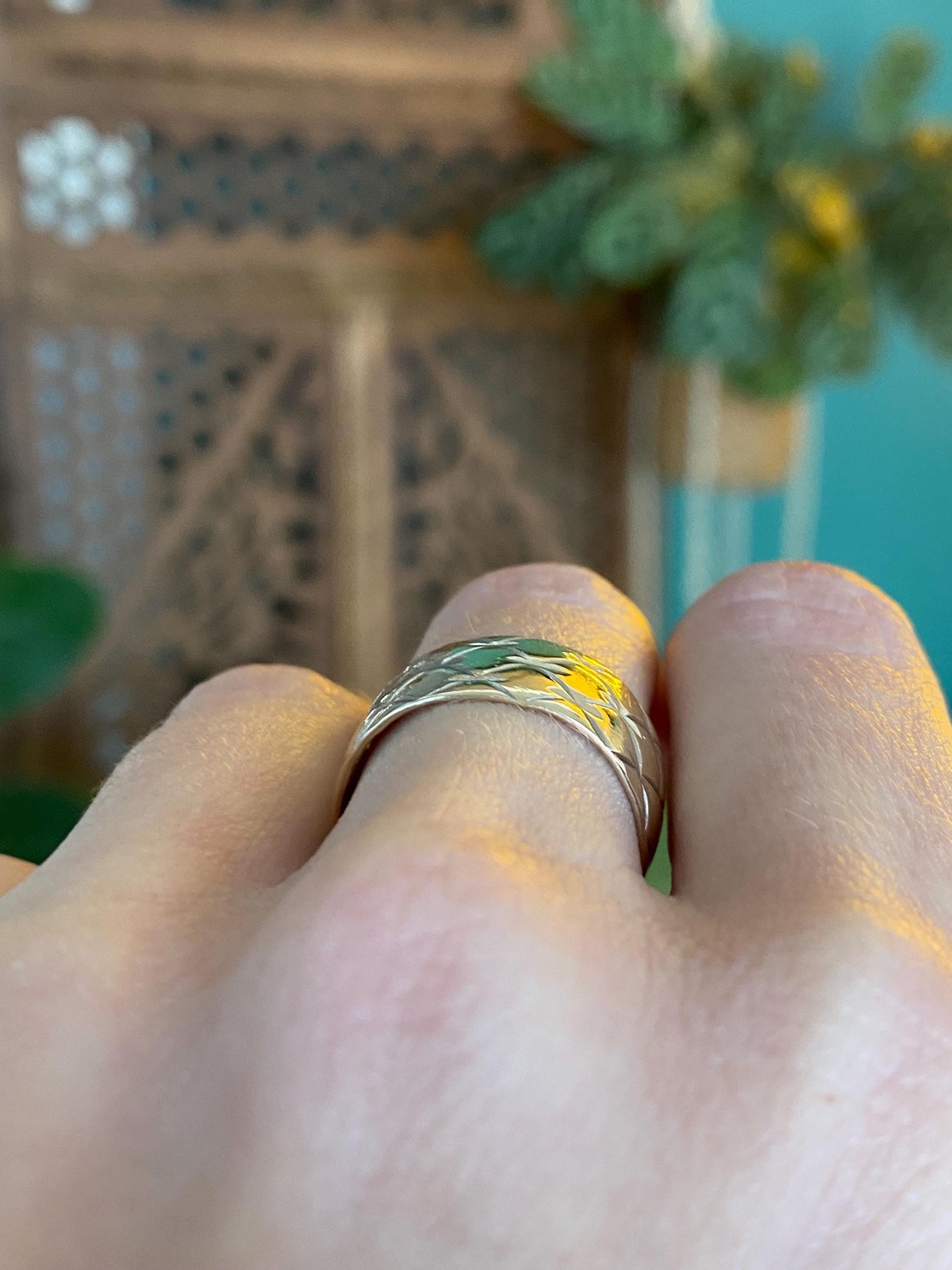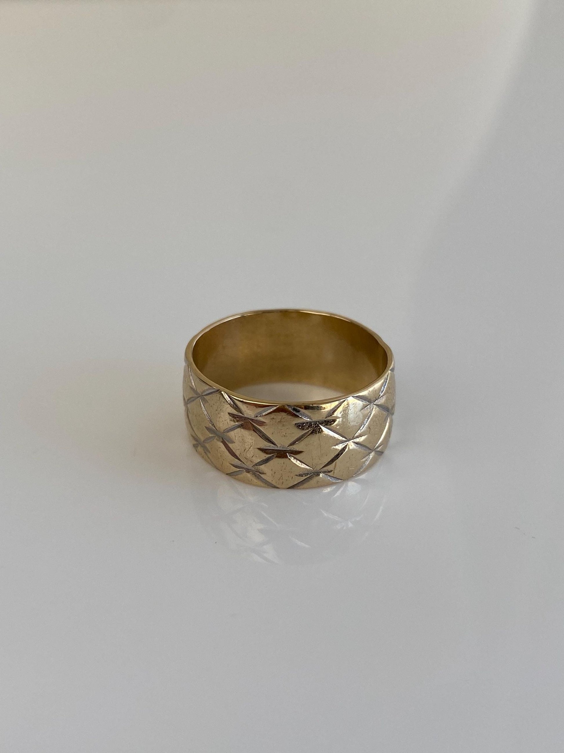 Vintage Solid 14k White & Yellow Gold Wide Quilted Texture Ring Band - Size 6.75