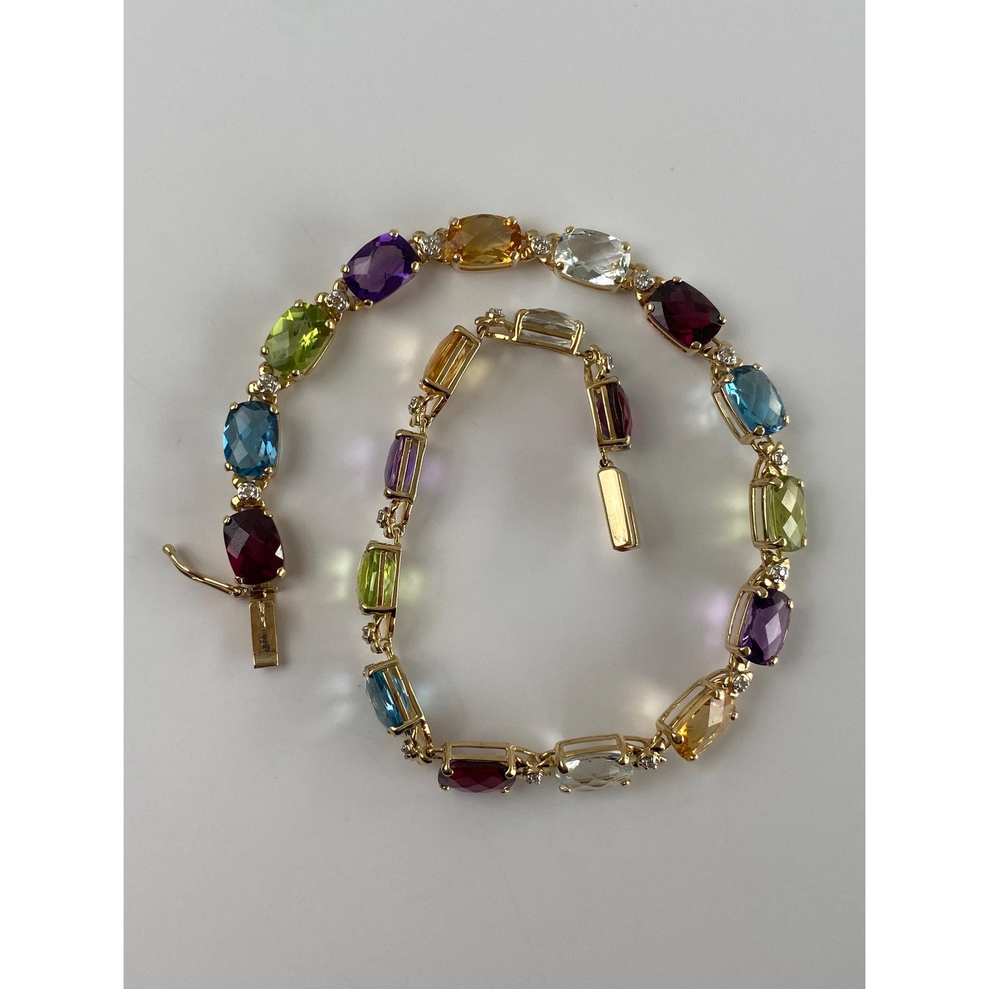 Vintage Solid 14k Yellow Gold Amethyst Diamond Citrine Topaz Garnet Peridot Quartz Link Bracelet - 8 inches