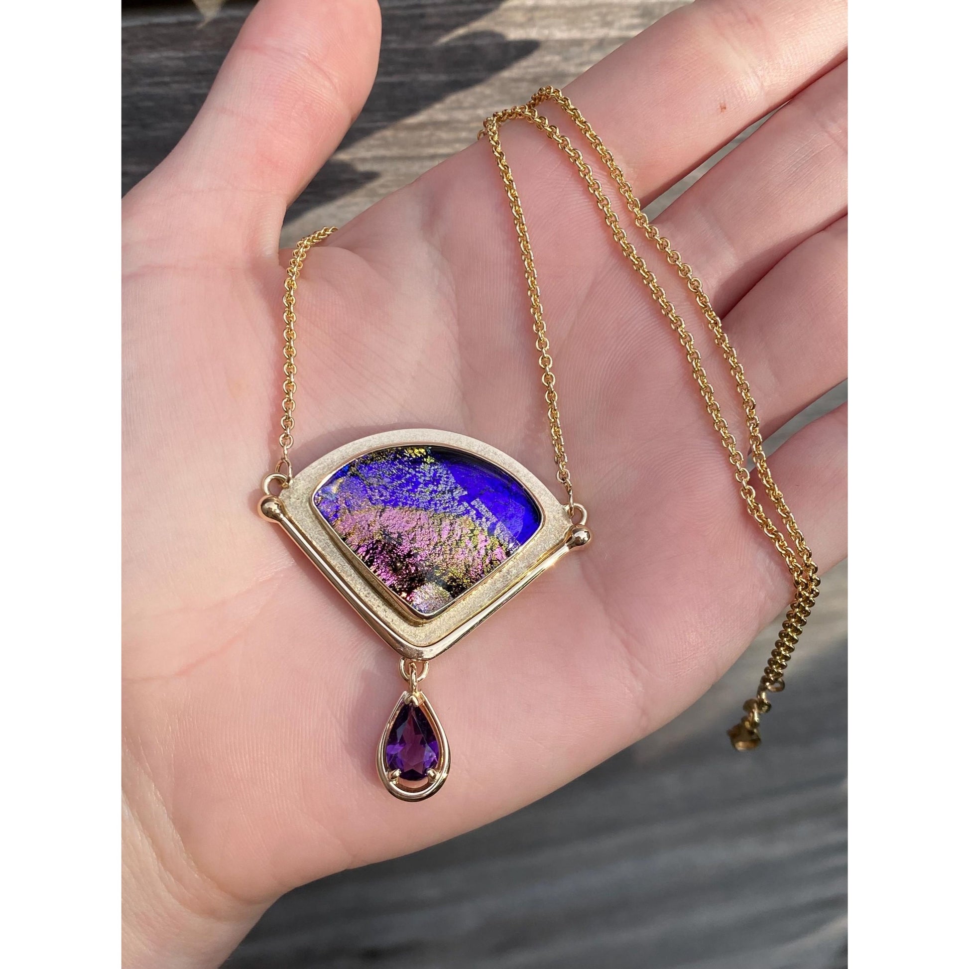 Vintage Solid 14k Yellow Gold Amethyst Dichroic Glass Rolo Chain Necklace - 17 inches