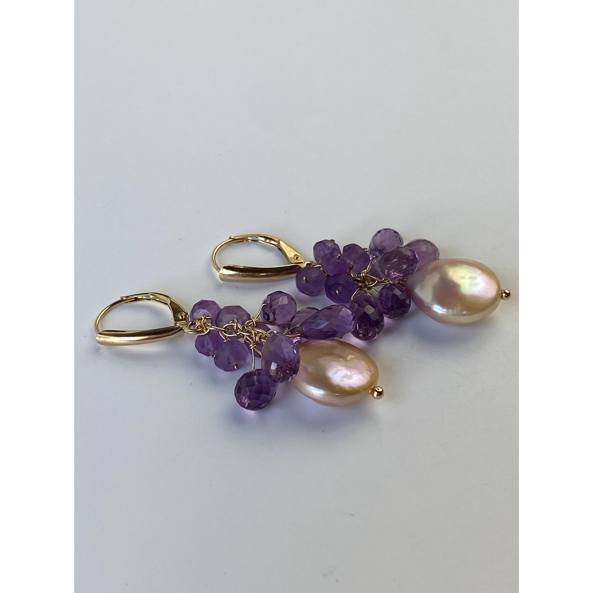 Vintage Solid 14k Yellow Gold Amethyst & Pearl Bead Dangle Earrings