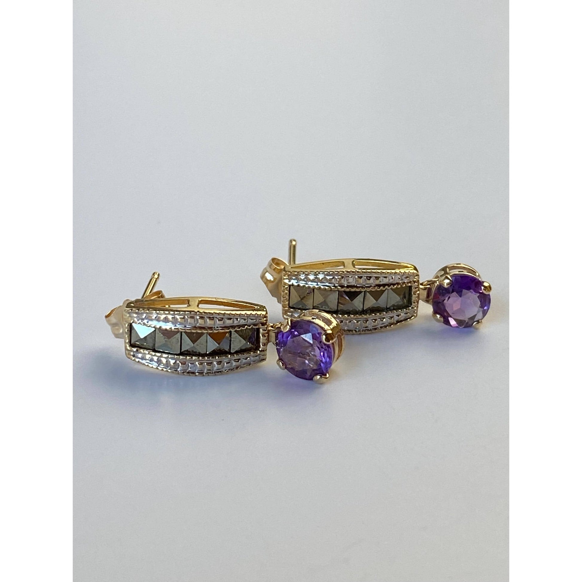Vintage Solid 14k Yellow Gold Amethyst Pyramid Texture Drop Earrings