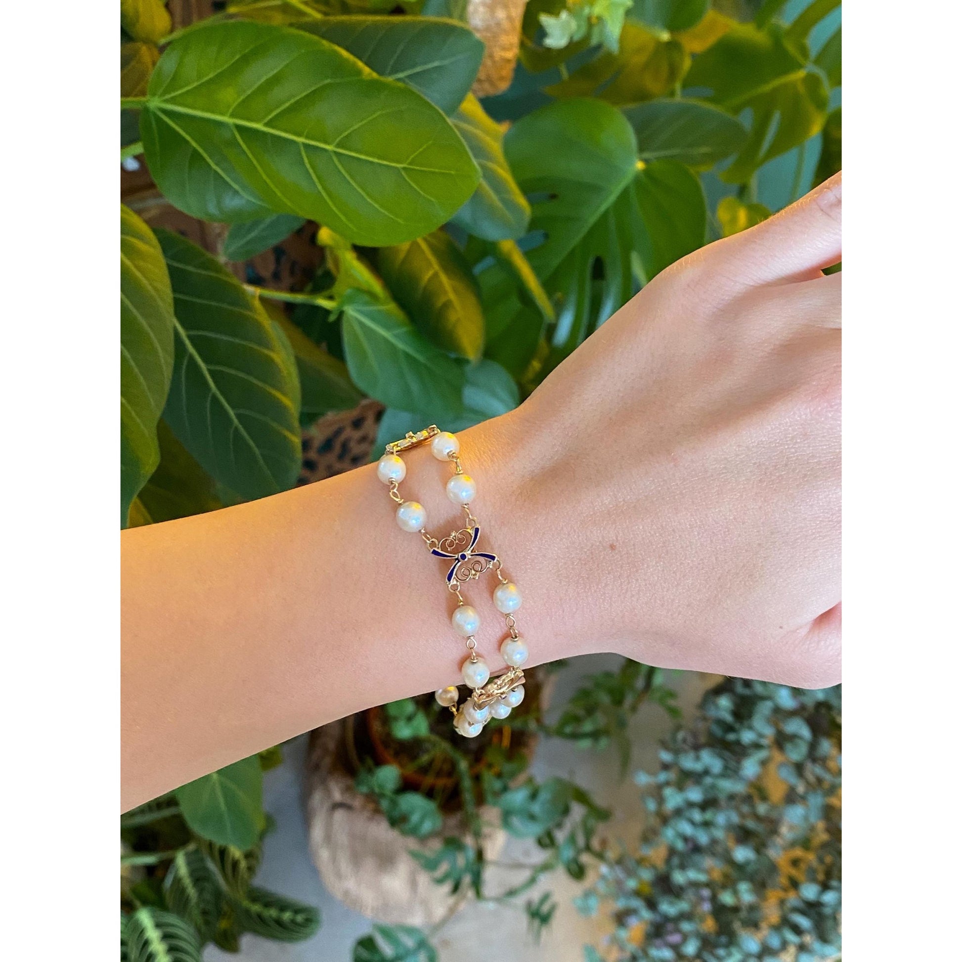 Vintage Solid 14k Yellow Gold Blue Enamel Pearls Link Bracelet - 7.75 inches