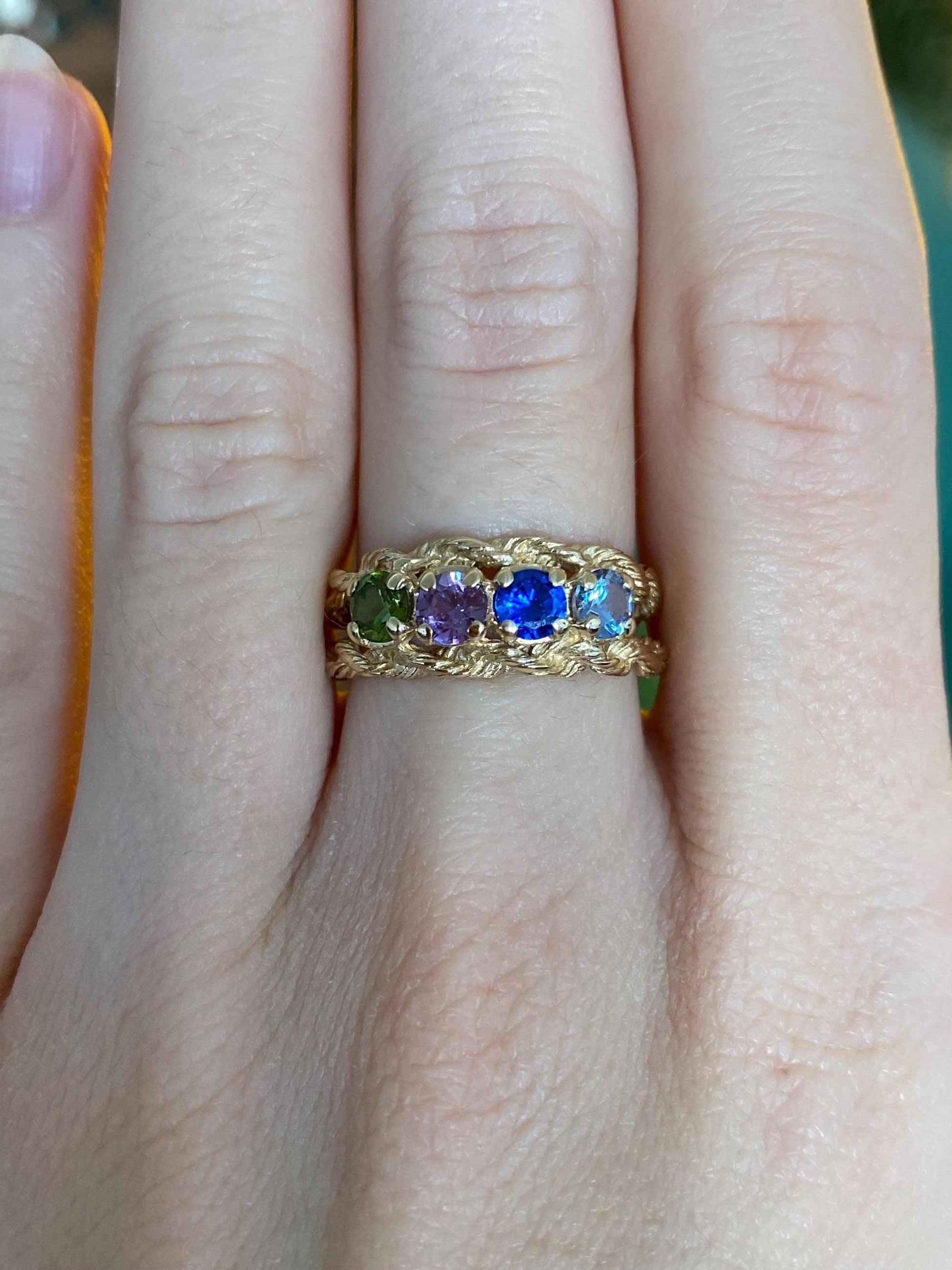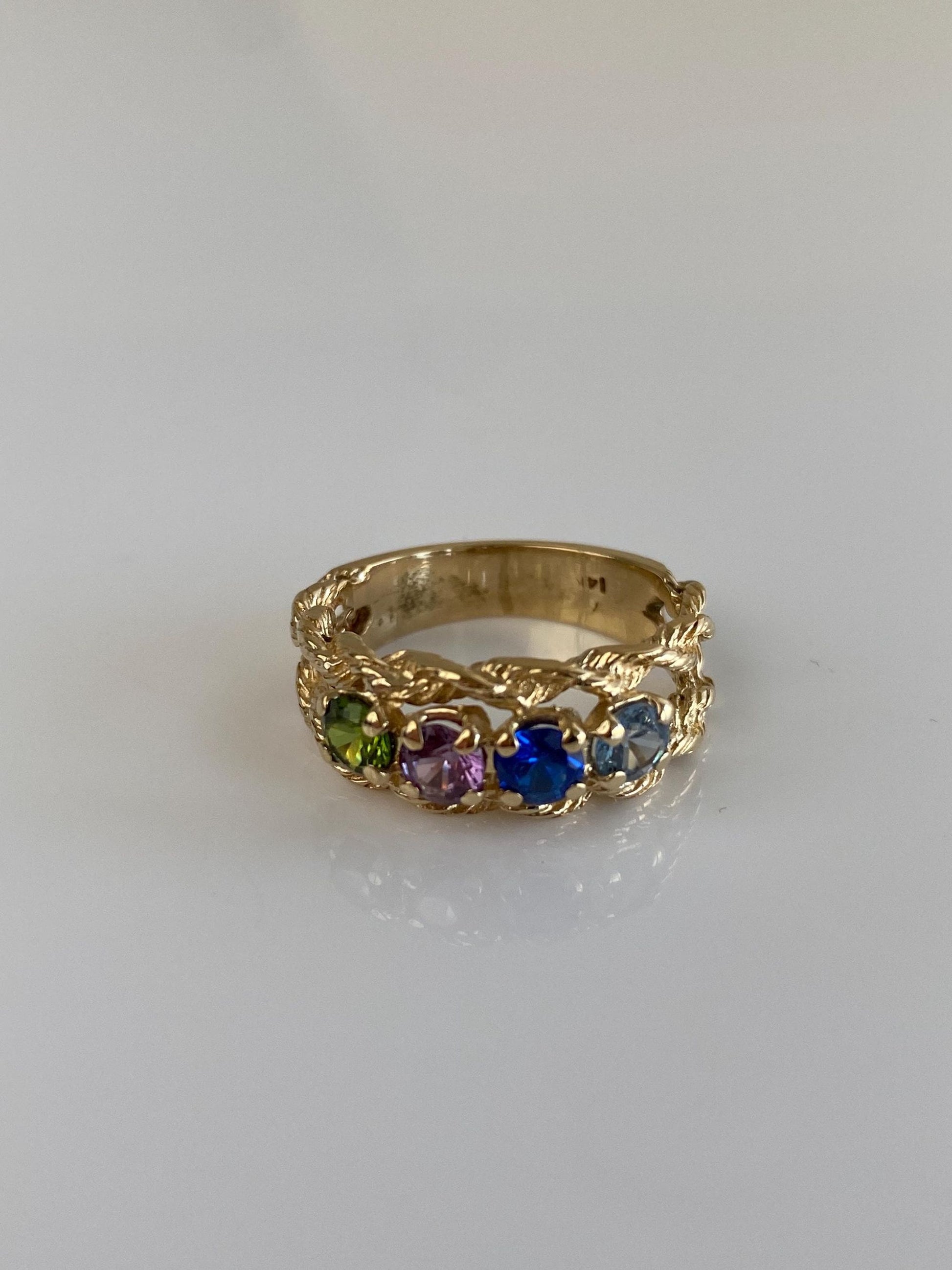 Vintage Solid 14k Yellow Gold Blue Spinel Aquamarine Purple Sapphire Peridot Row Ring Band - Size 6.5