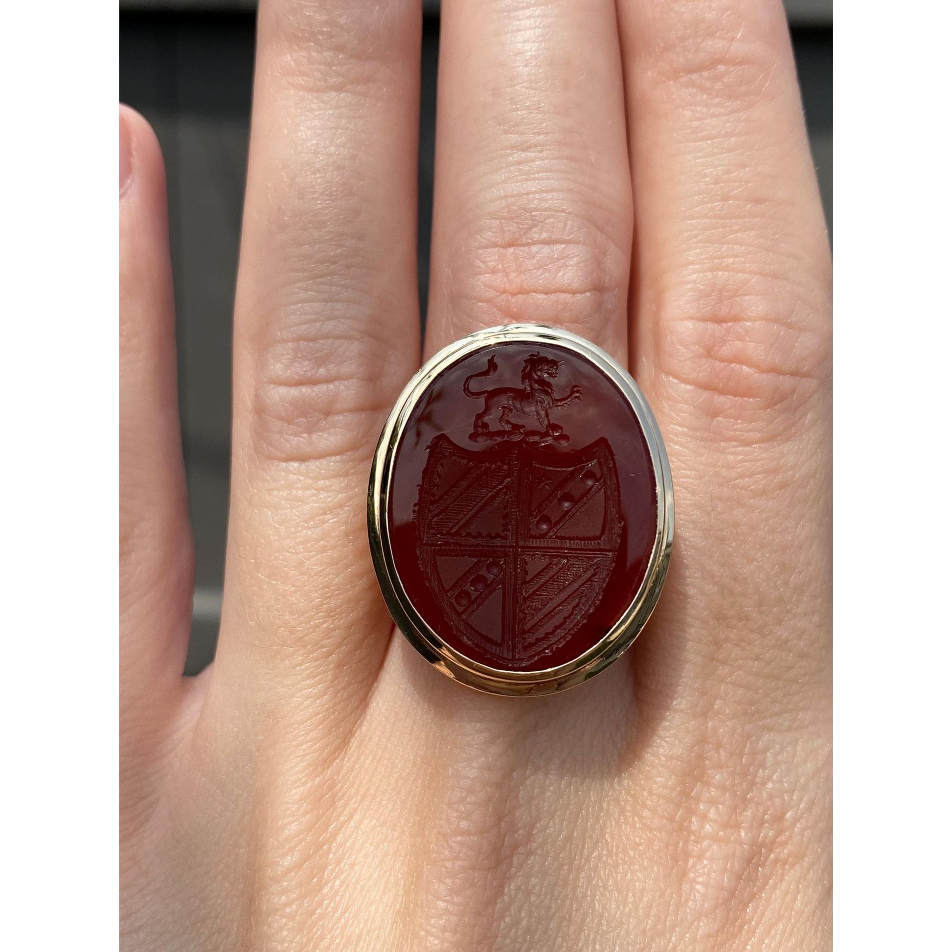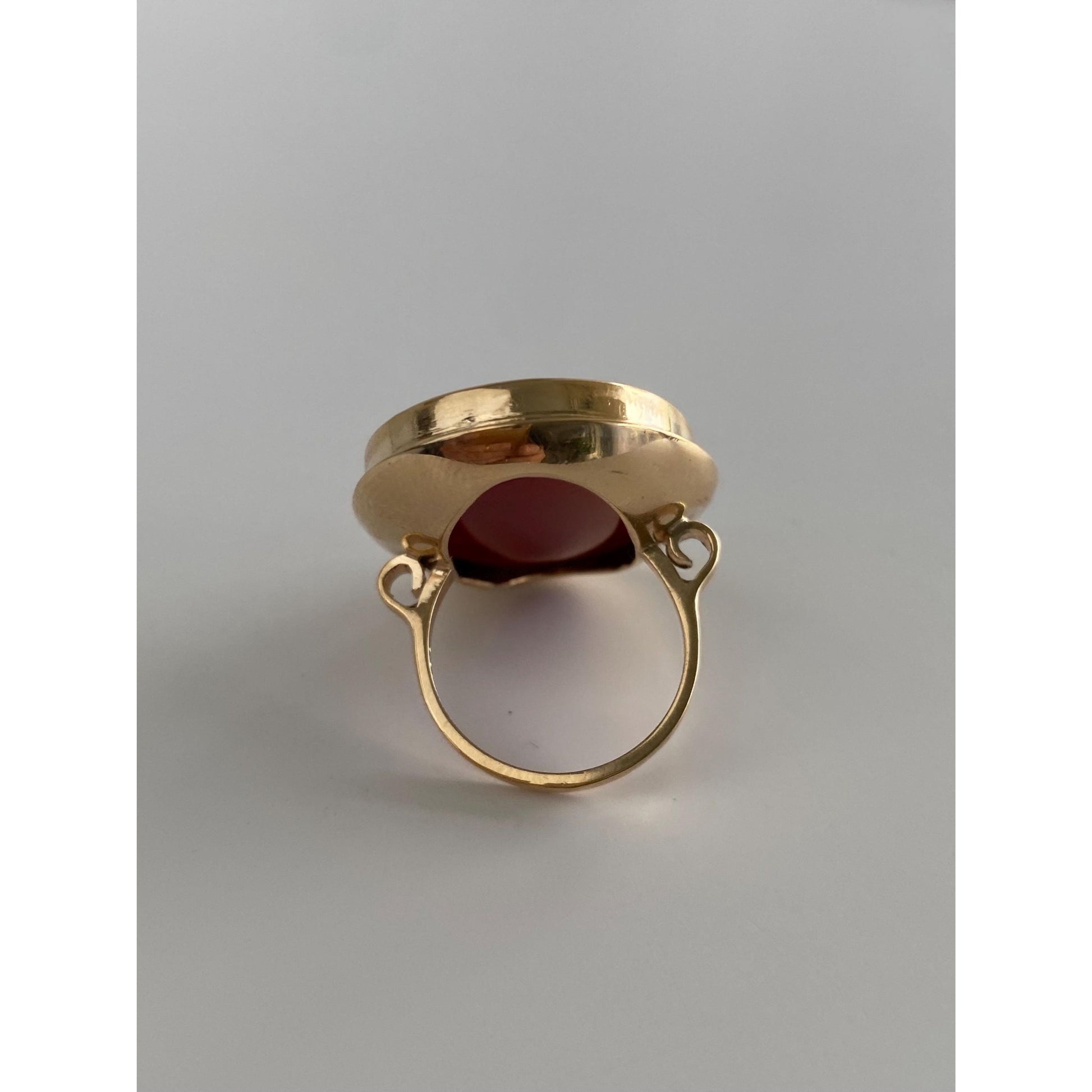 Vintage Solid 14k Yellow Gold Carnelian Carved Crest Lion Shield Ring - Size 5.5