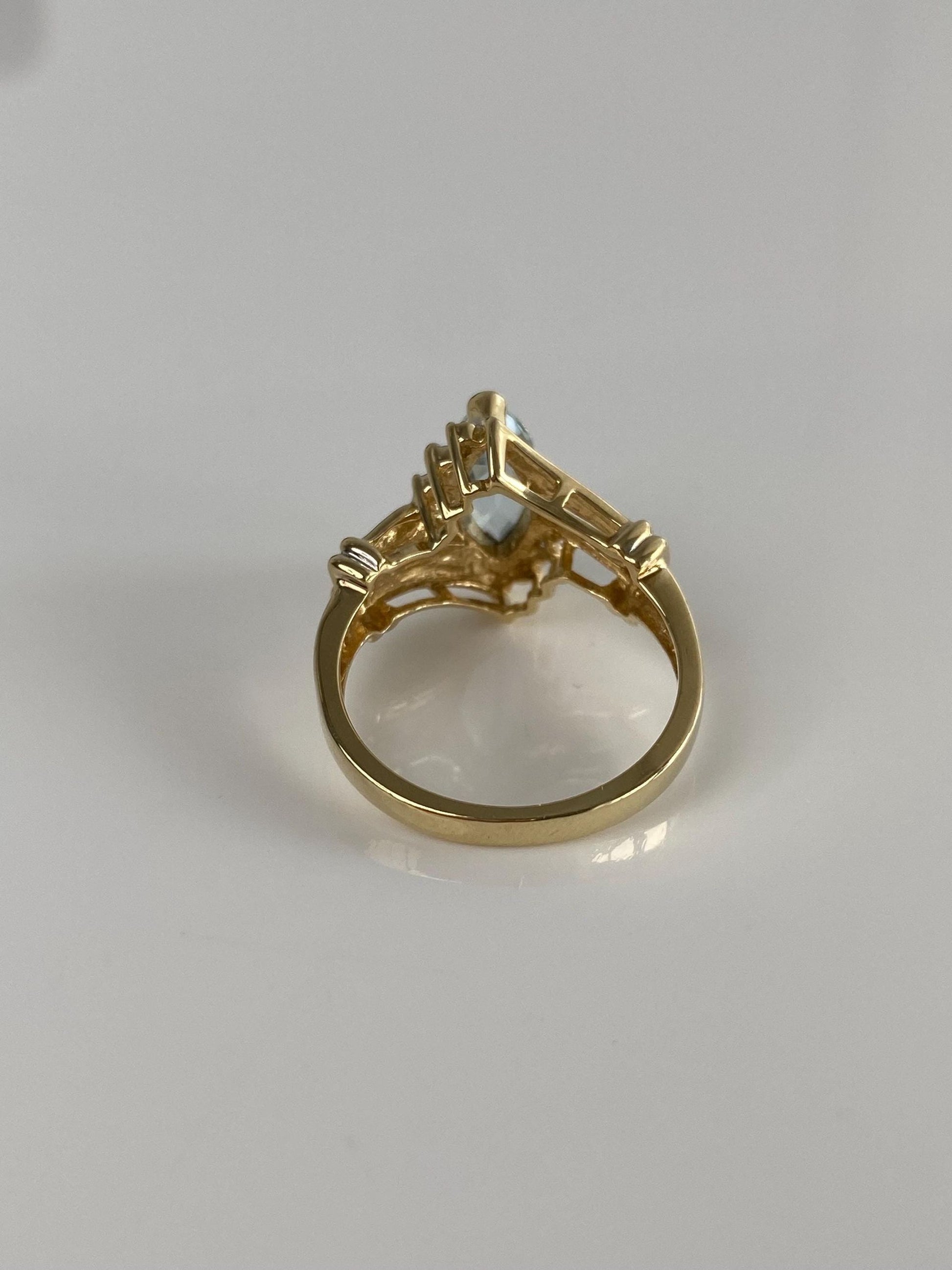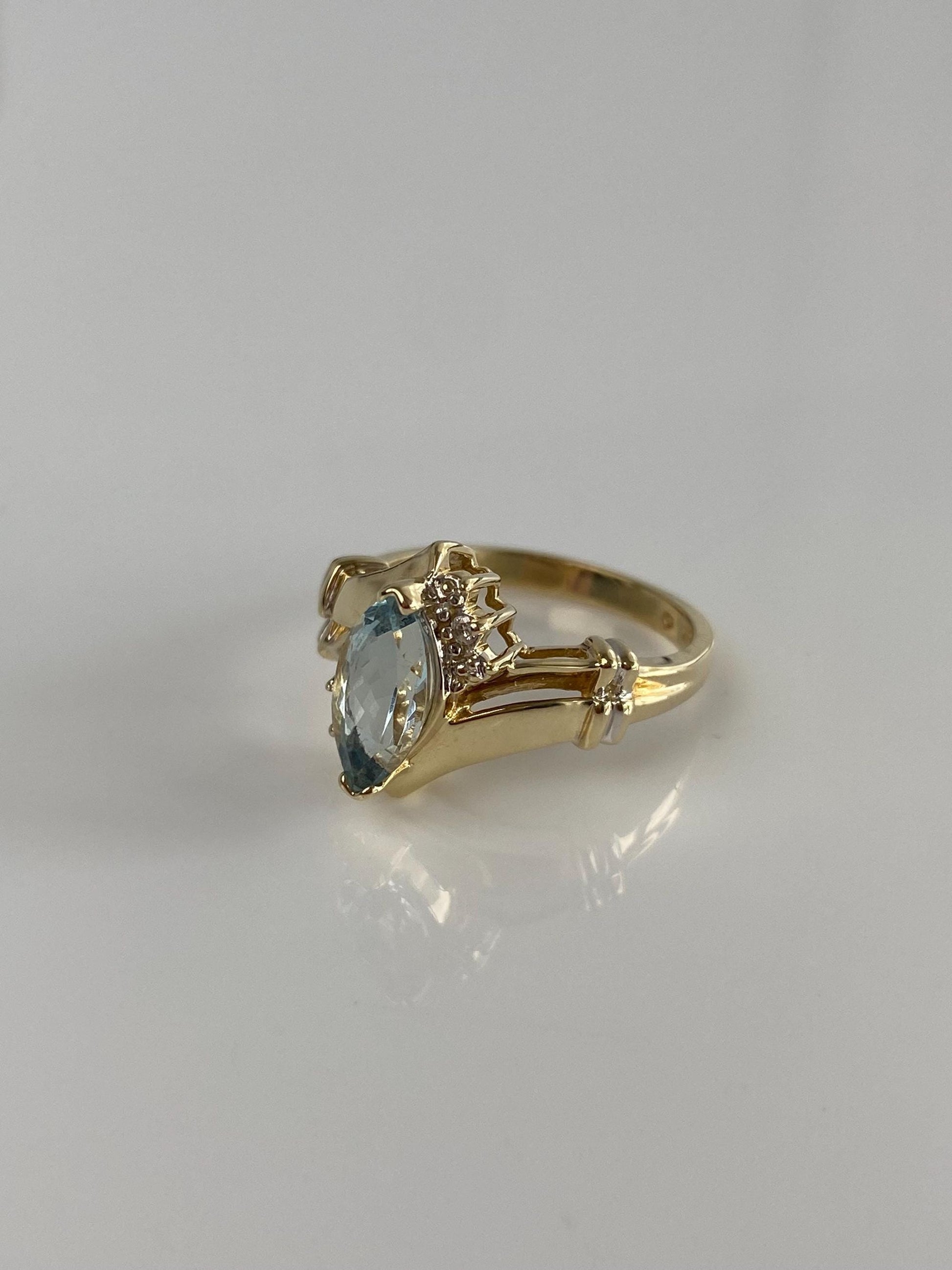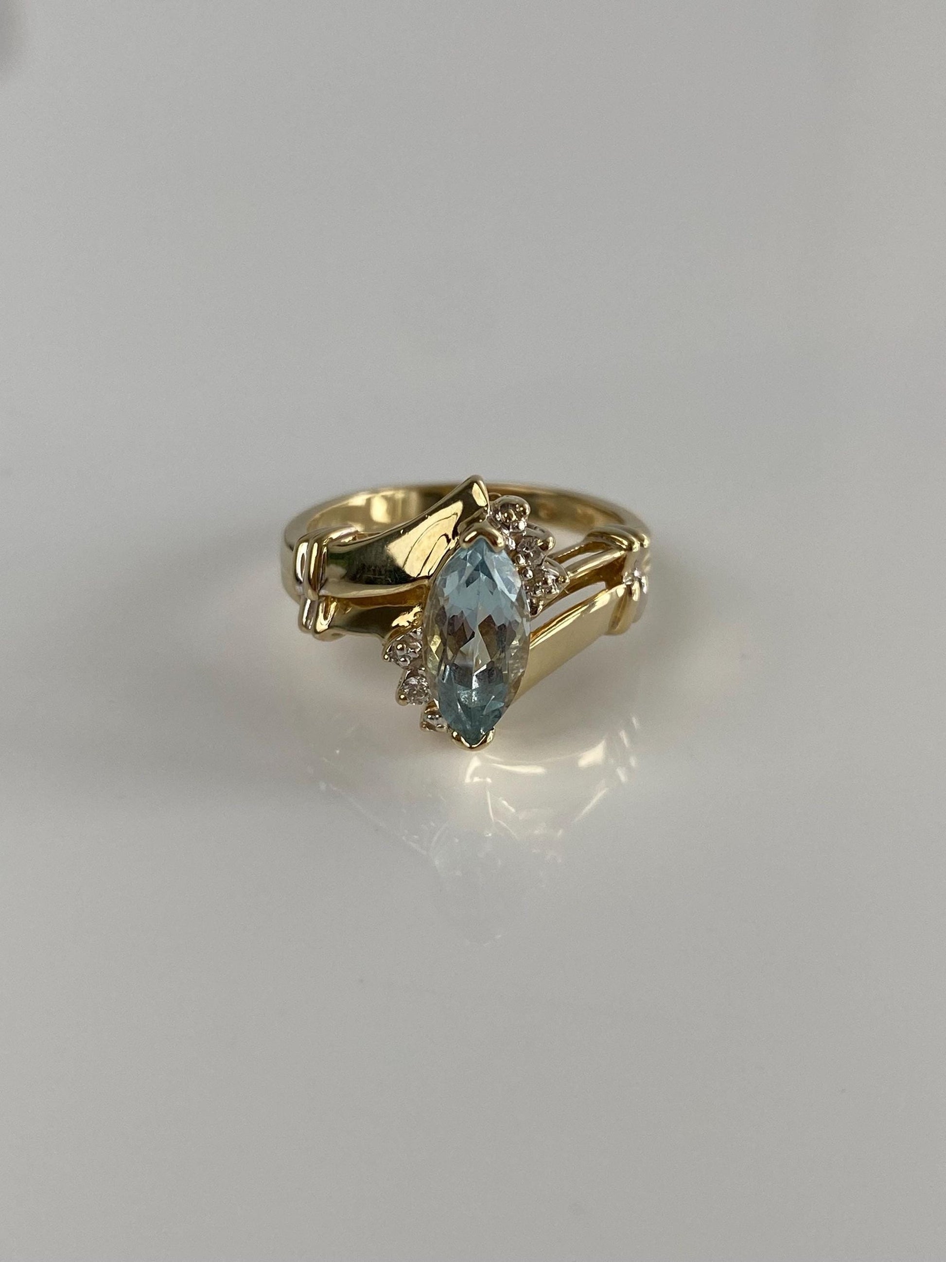 Vintage Solid 14k Yellow Gold Diamond Aquamarine Ring - Size 6.5