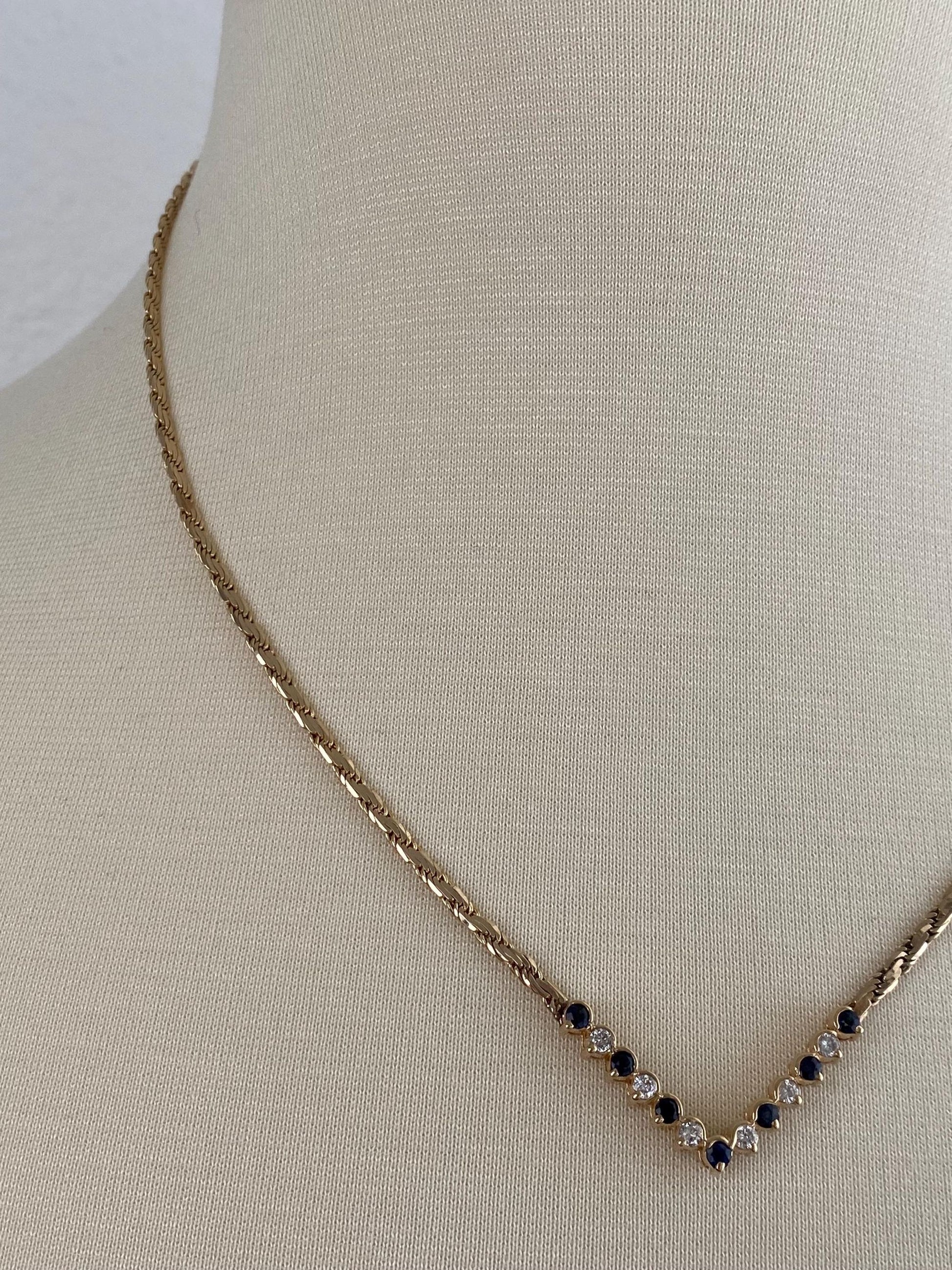 Vintage Solid 14k Yellow Gold Diamond Blue Sapphire Chevron Flat Rope Chain Necklace - 18.75 inches