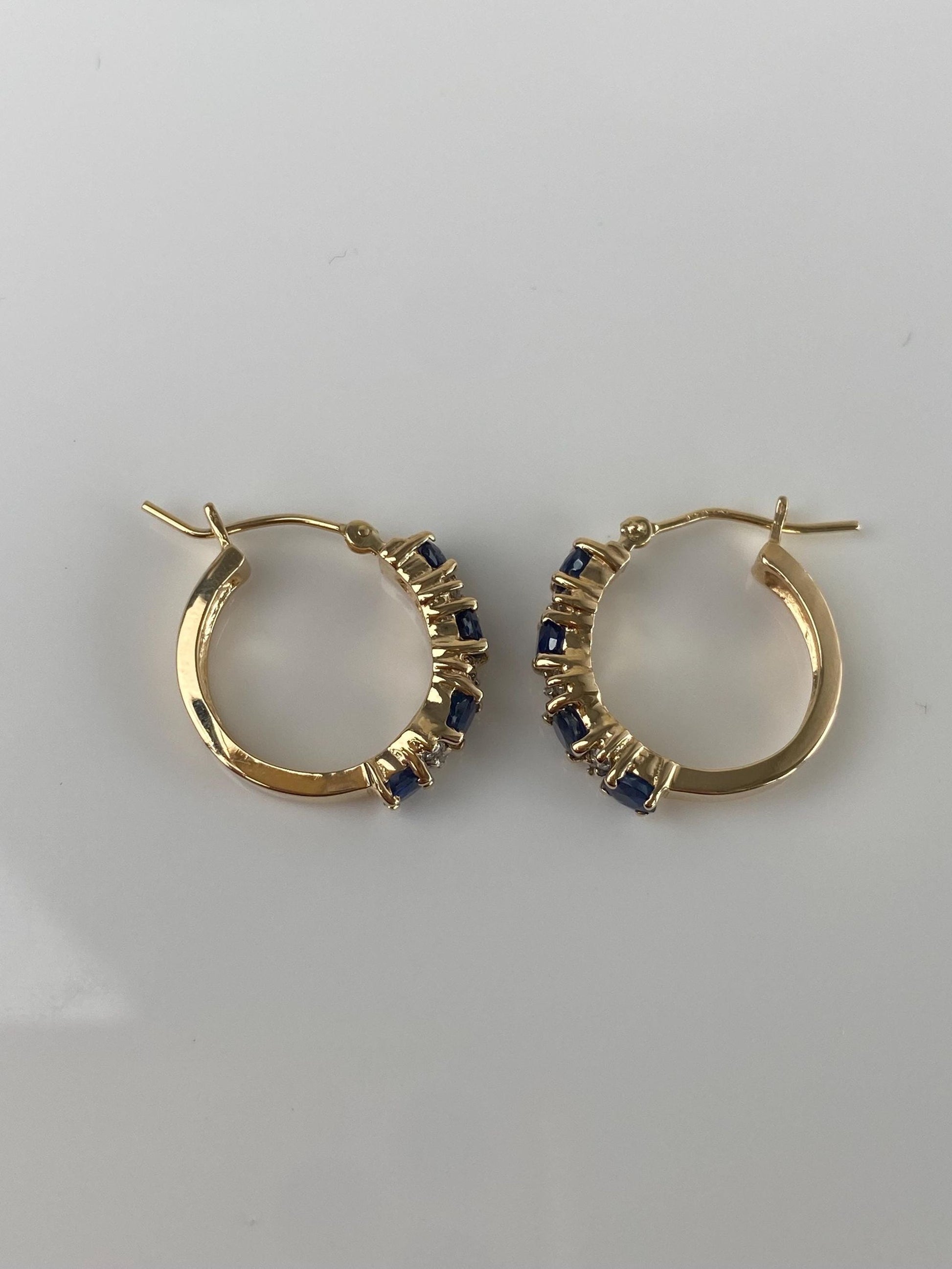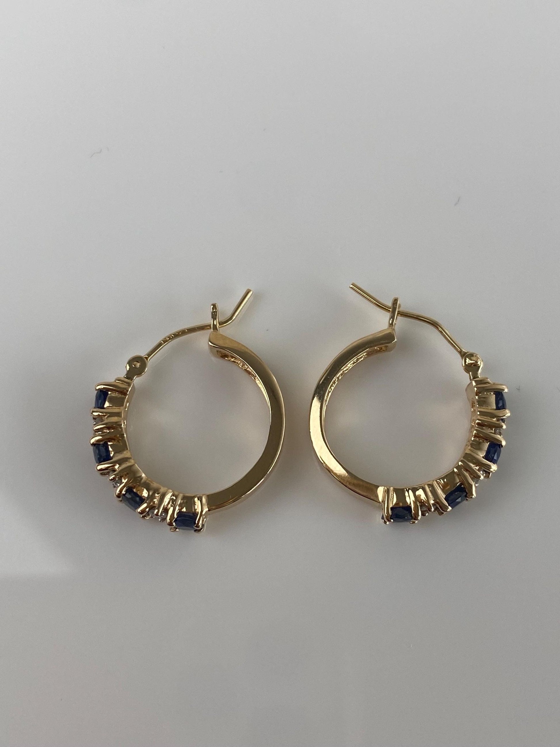 Vintage Solid 14k Yellow Gold Diamond Blue Sapphire Hoop Earrings