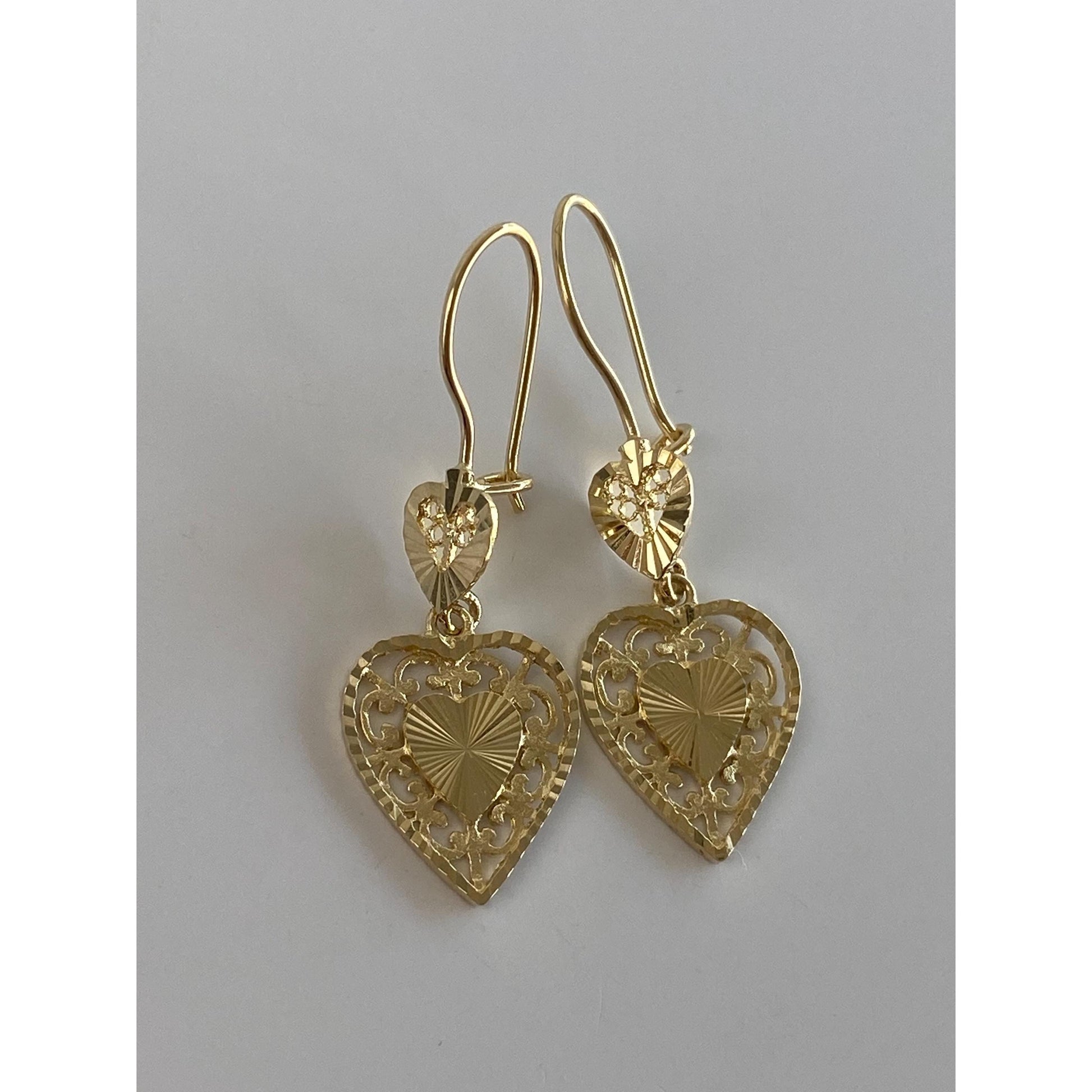 Vintage Solid 14k Yellow Gold Diamond Cut Heart Dangle Earrings