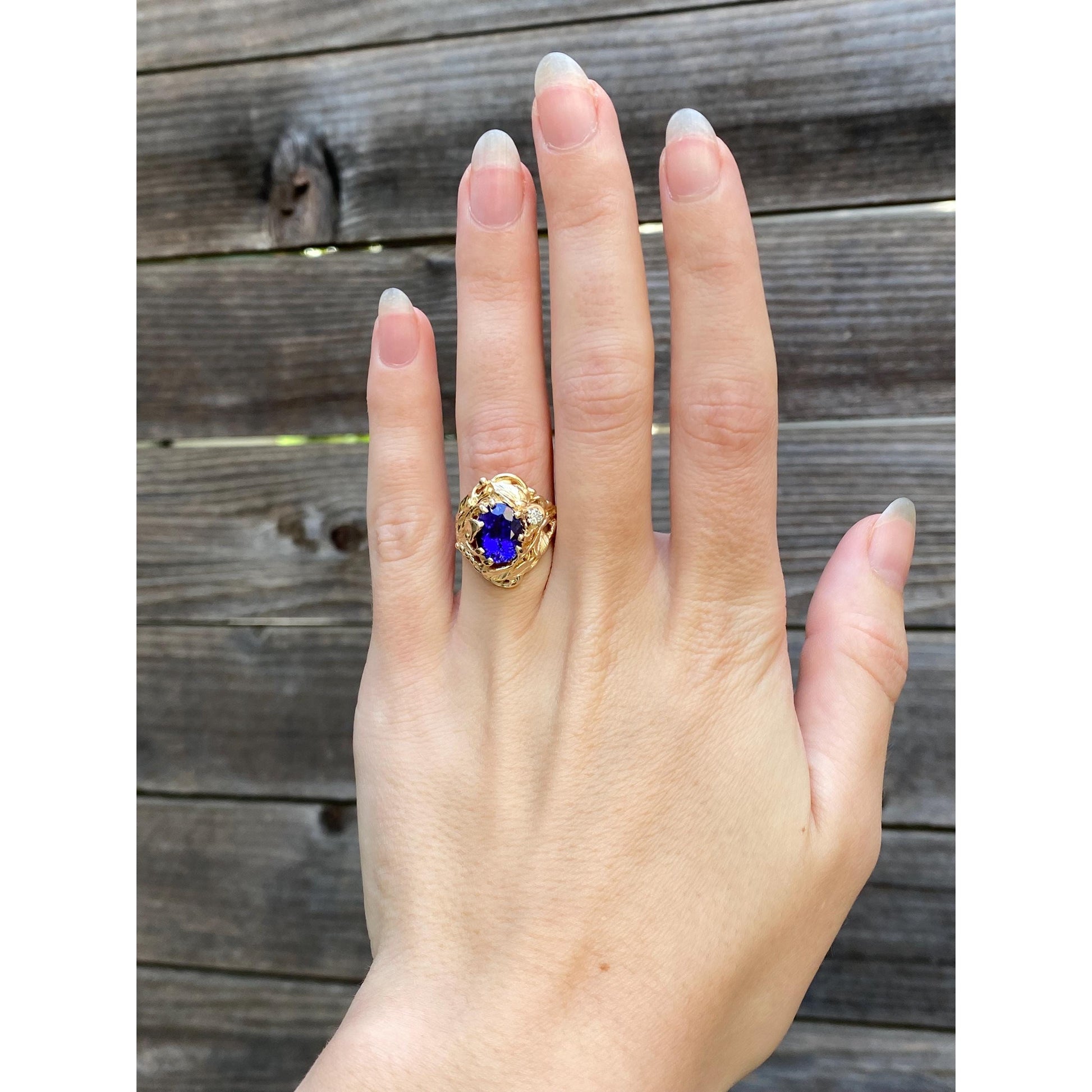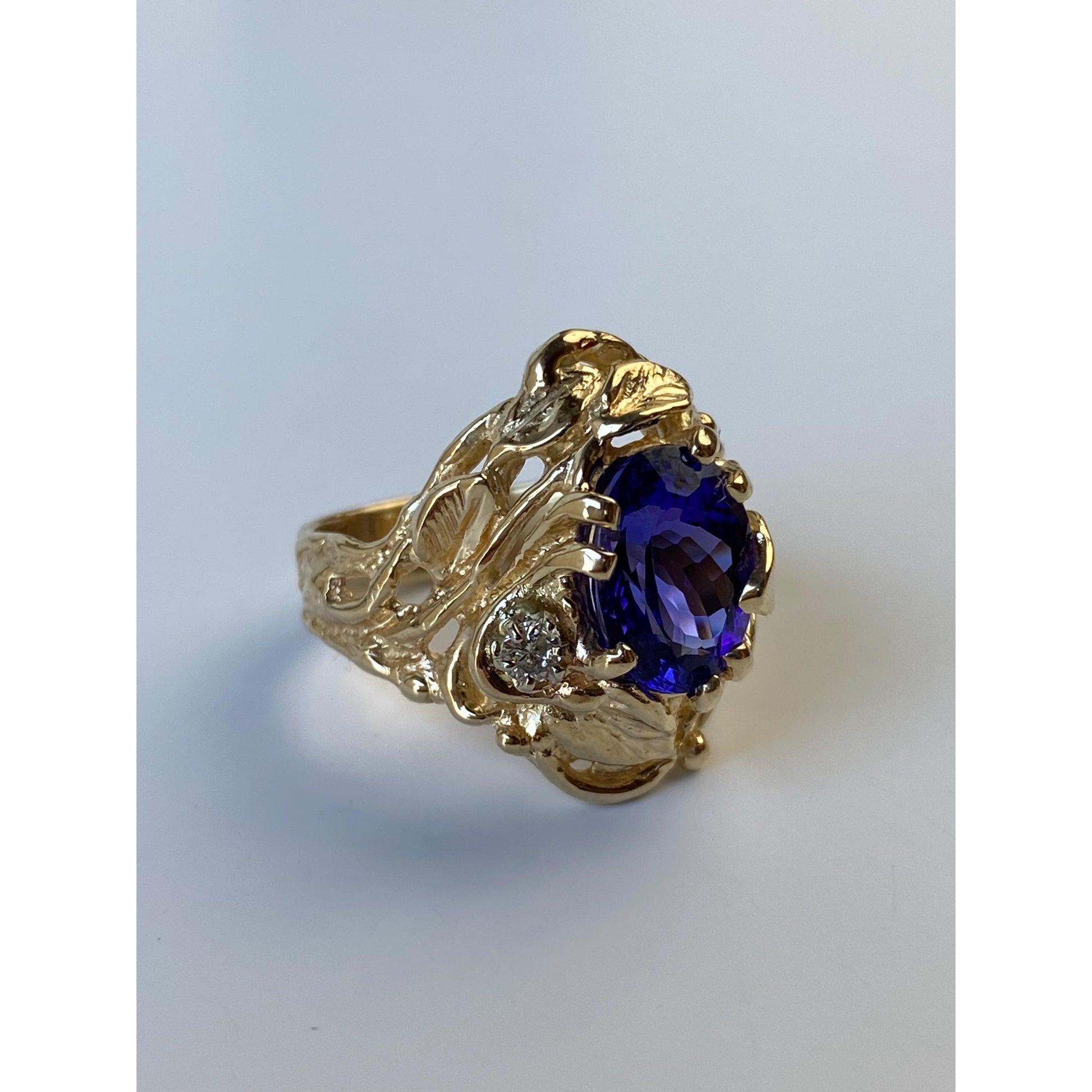 Vintage Solid 14k Yellow Gold Diamond Dark Blue Quartz Ring - Size 5.5