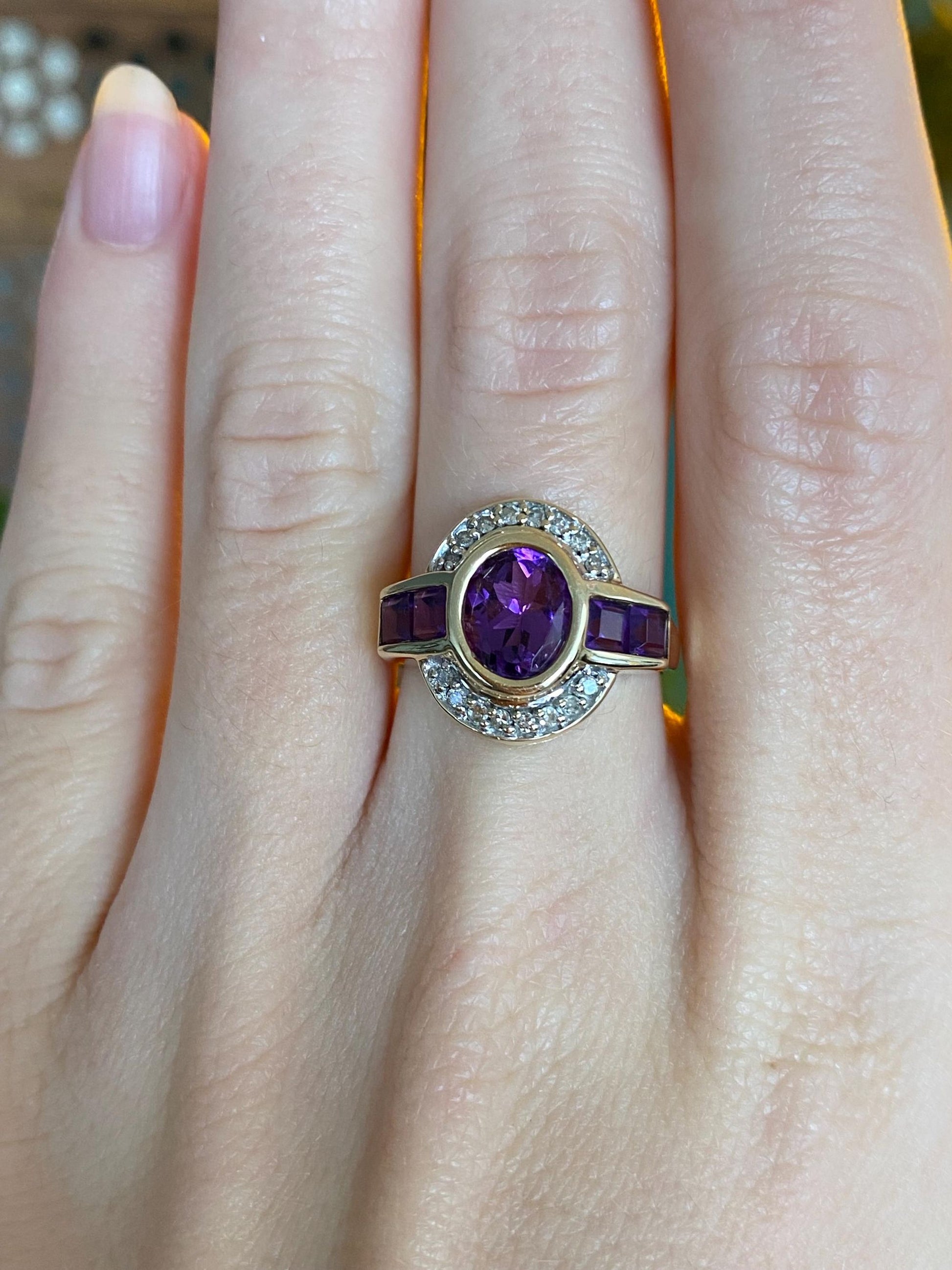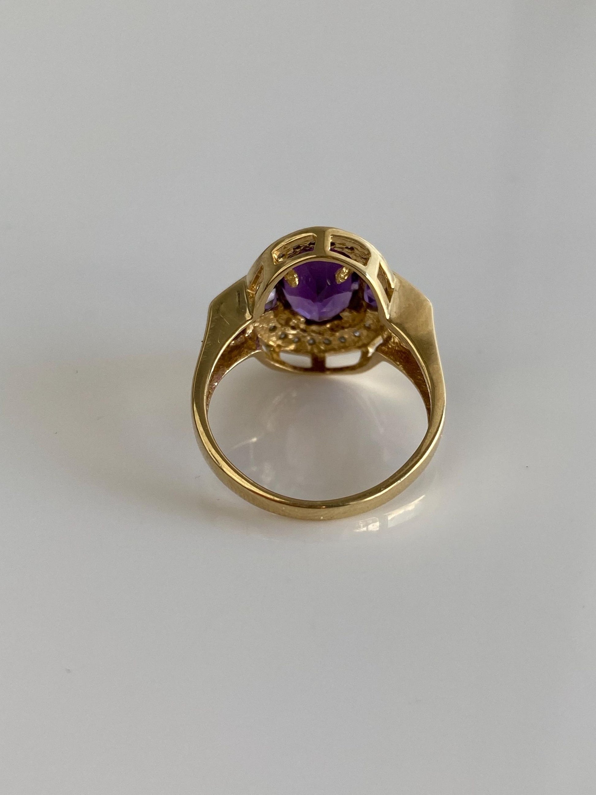 Vintage Solid 14k Yellow Gold Diamond Halo Amethyst Ring - Size 6.5