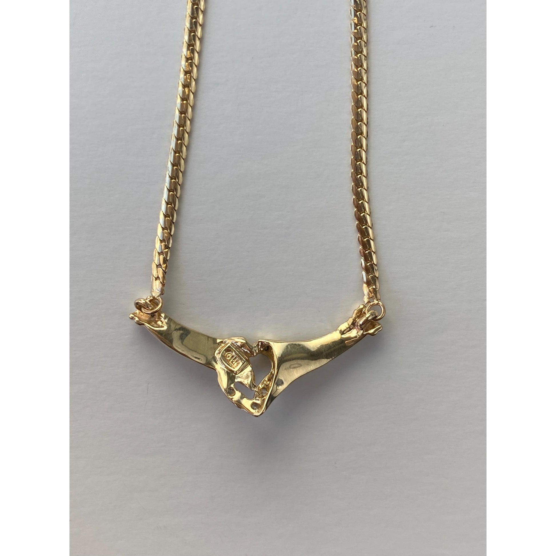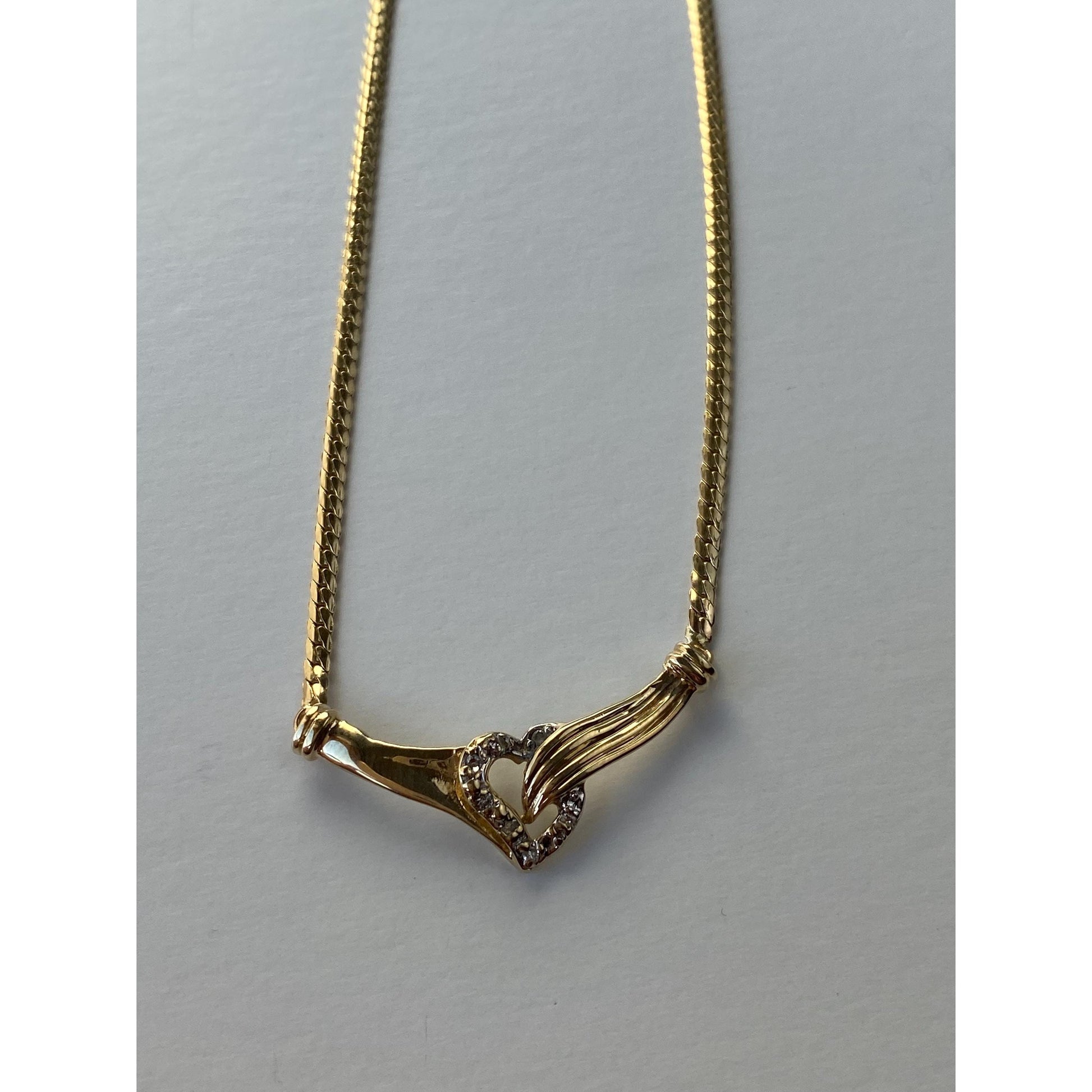 Vintage Solid 14k Yellow Gold Diamond Heart Hands Flat Chain Necklace - 16.75 inches