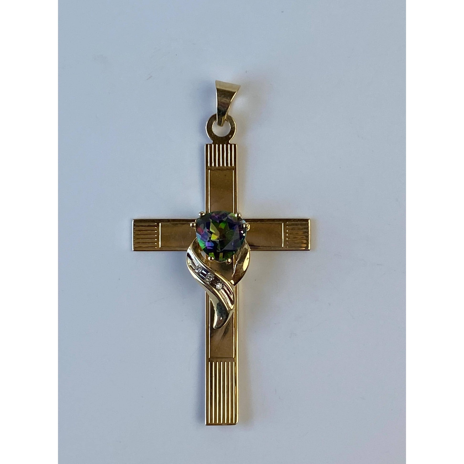 Vintage Solid 14k Yellow Gold Diamond Mystic Topaz Cross Charm