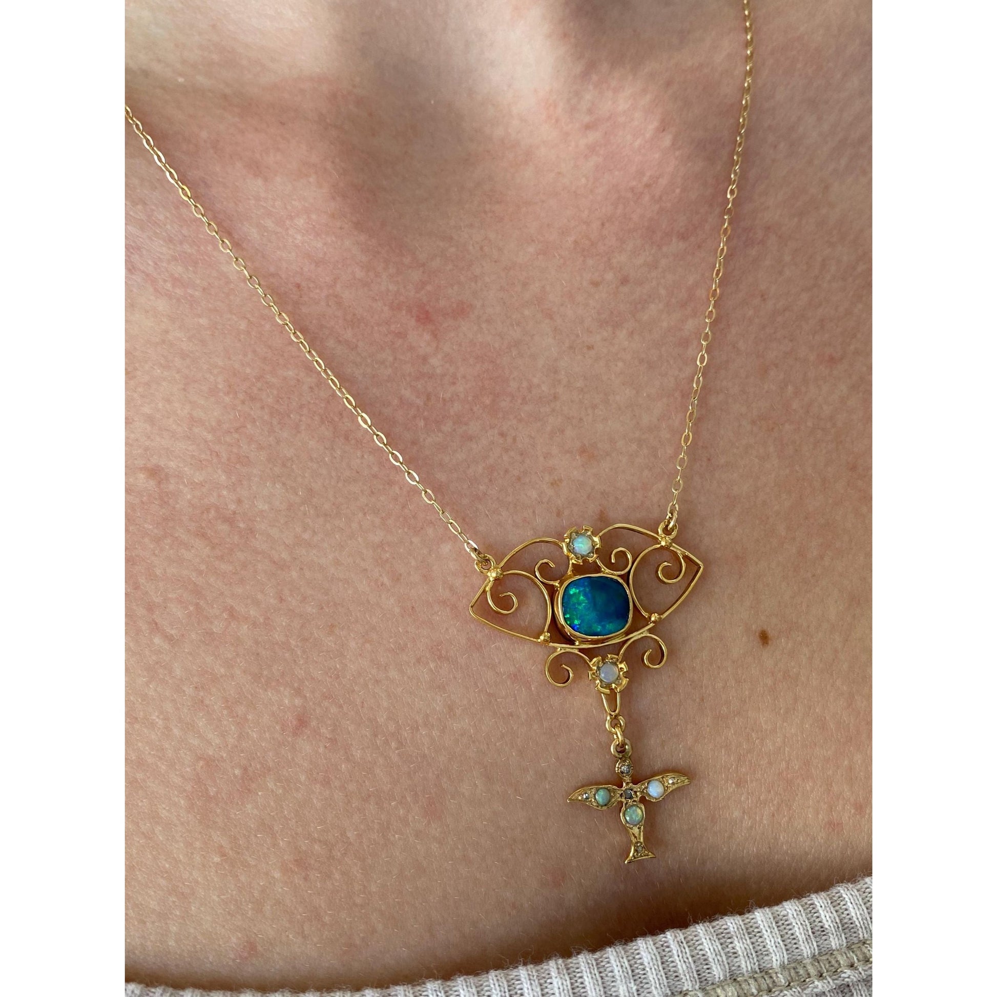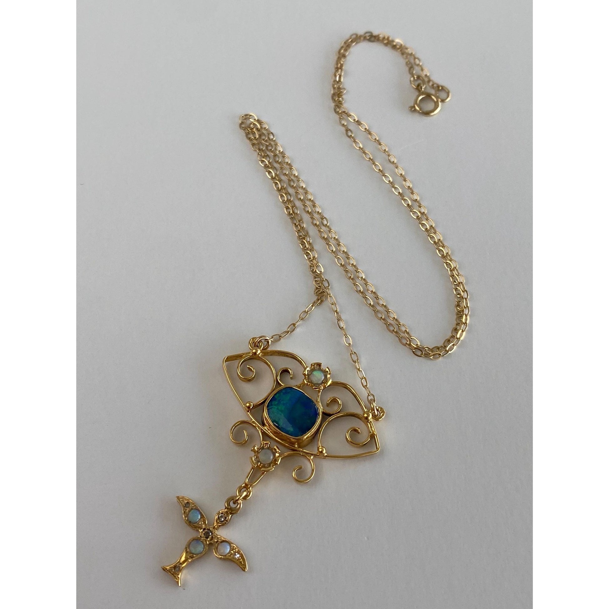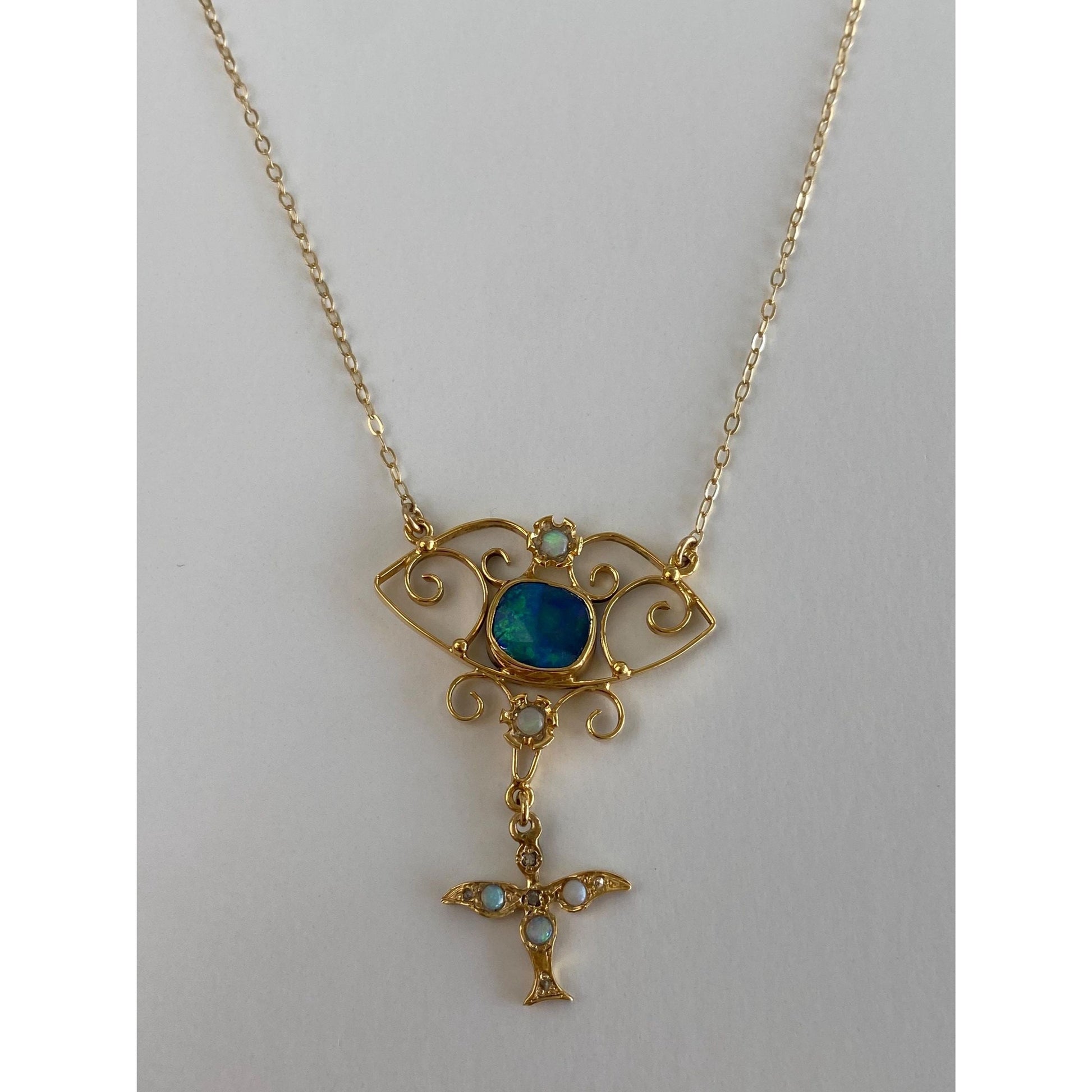 Vintage Solid 14k Yellow Gold Diamond Opal Cable Chain Necklace - 18.75 inches