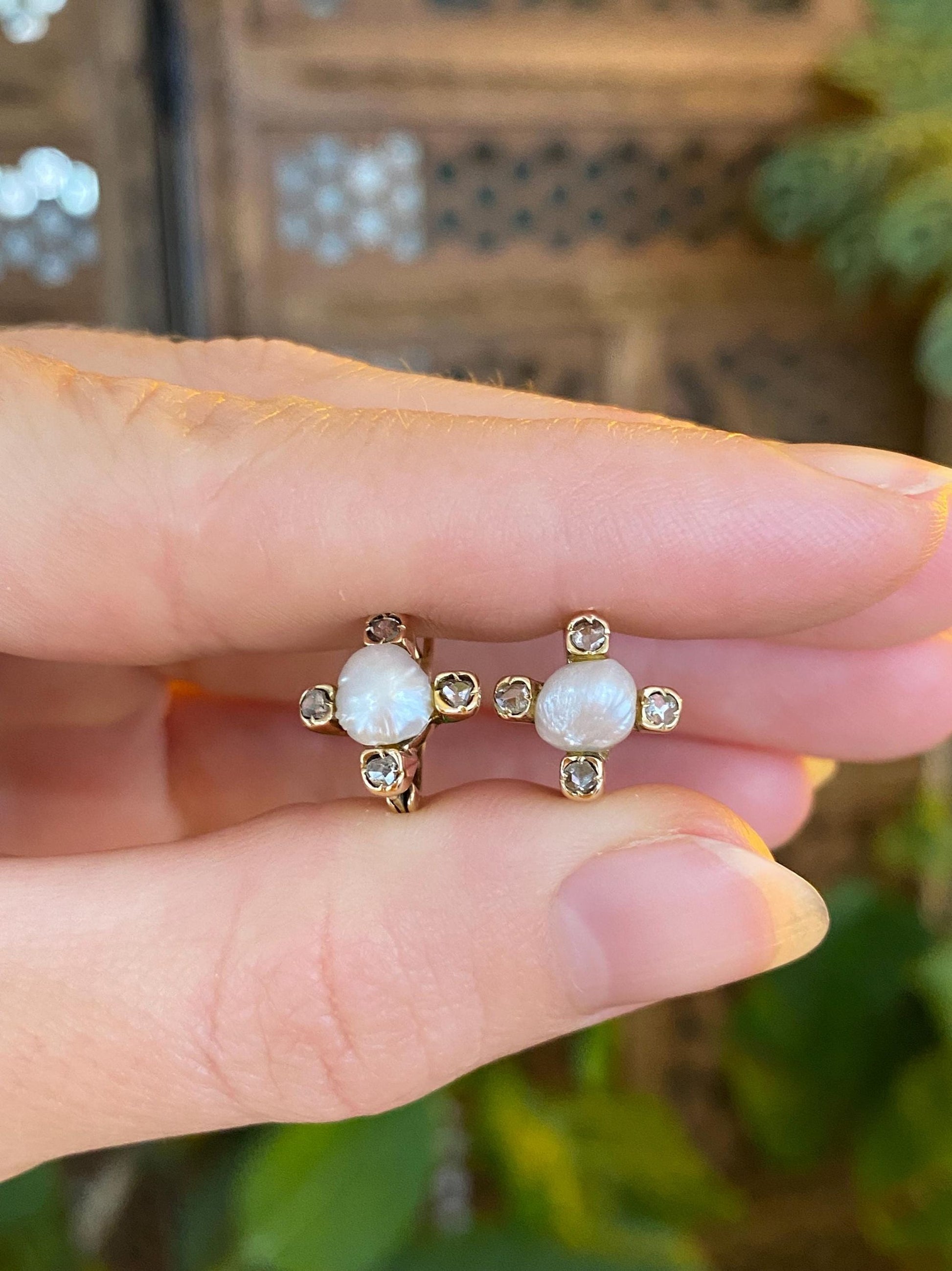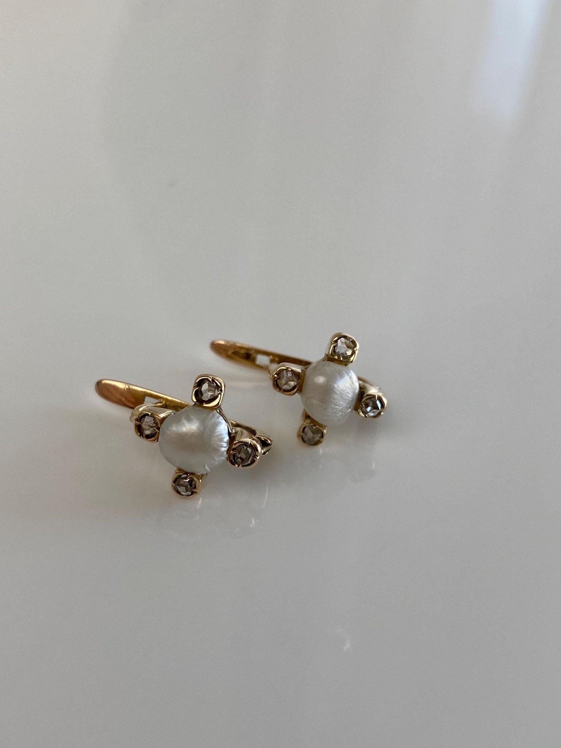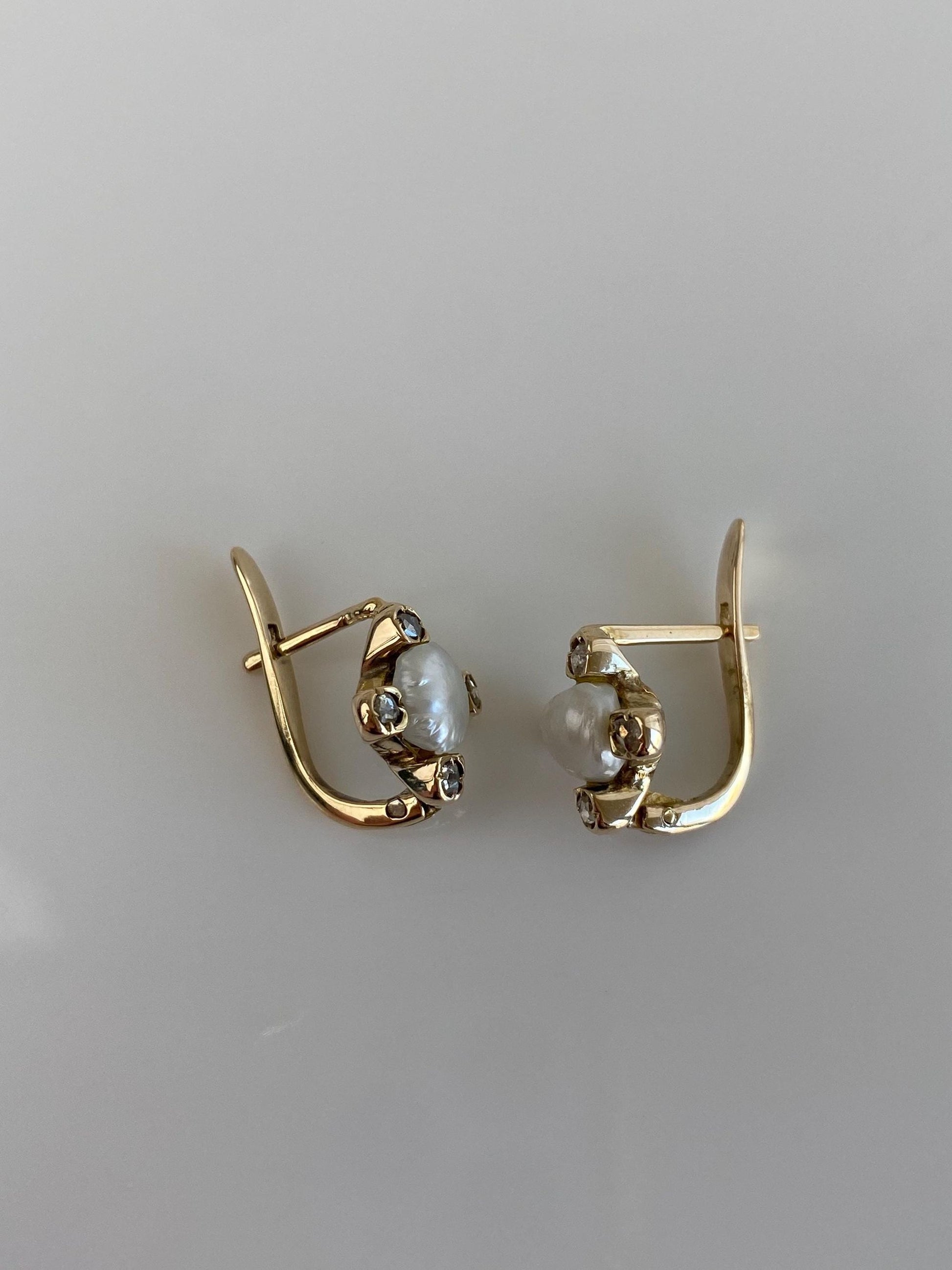 Vintage Solid 14k Yellow Gold Diamond Pearl Drop Earrings