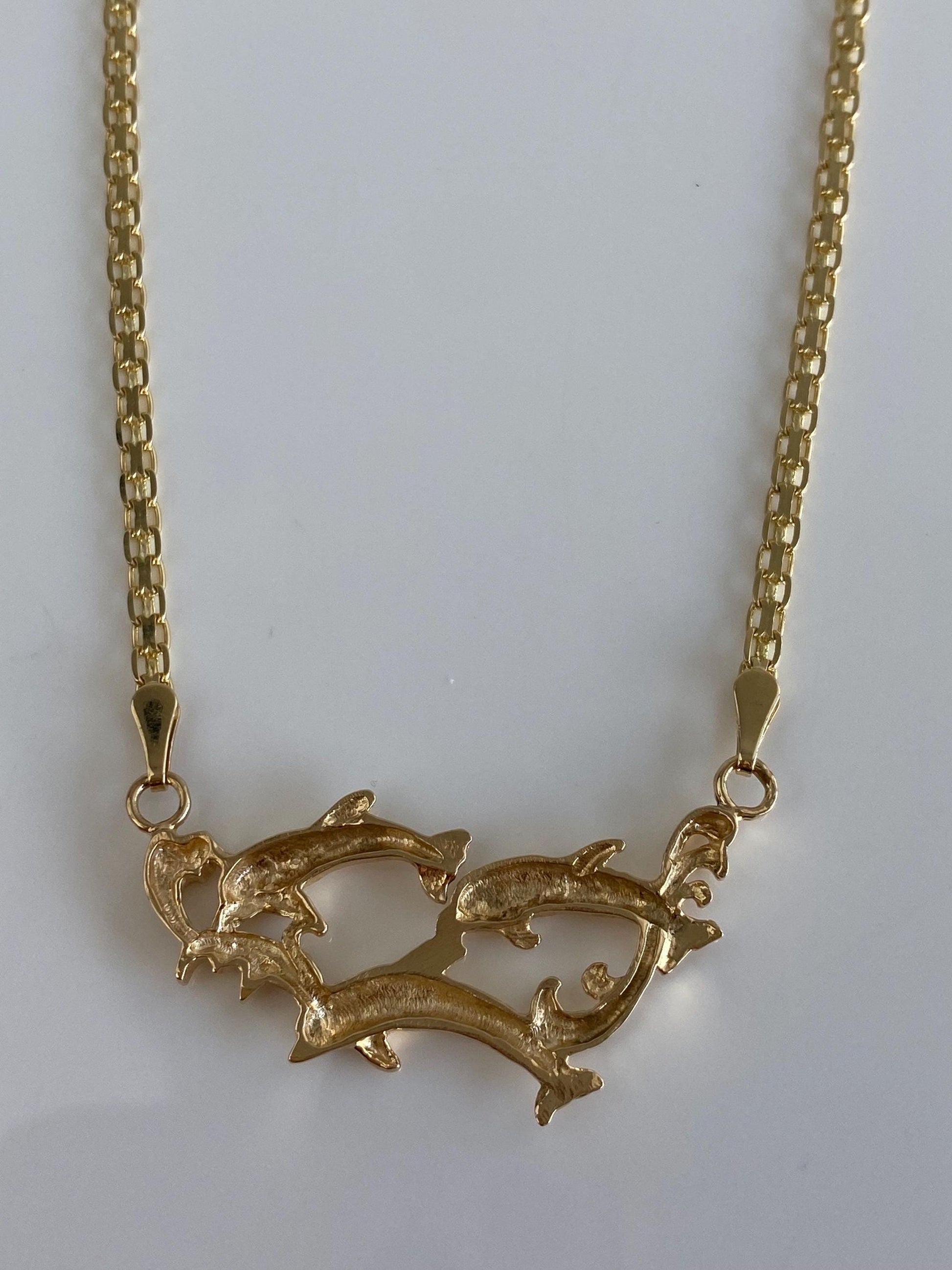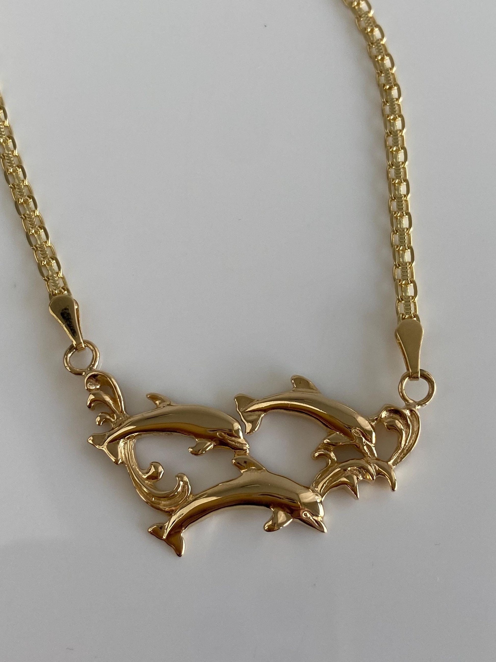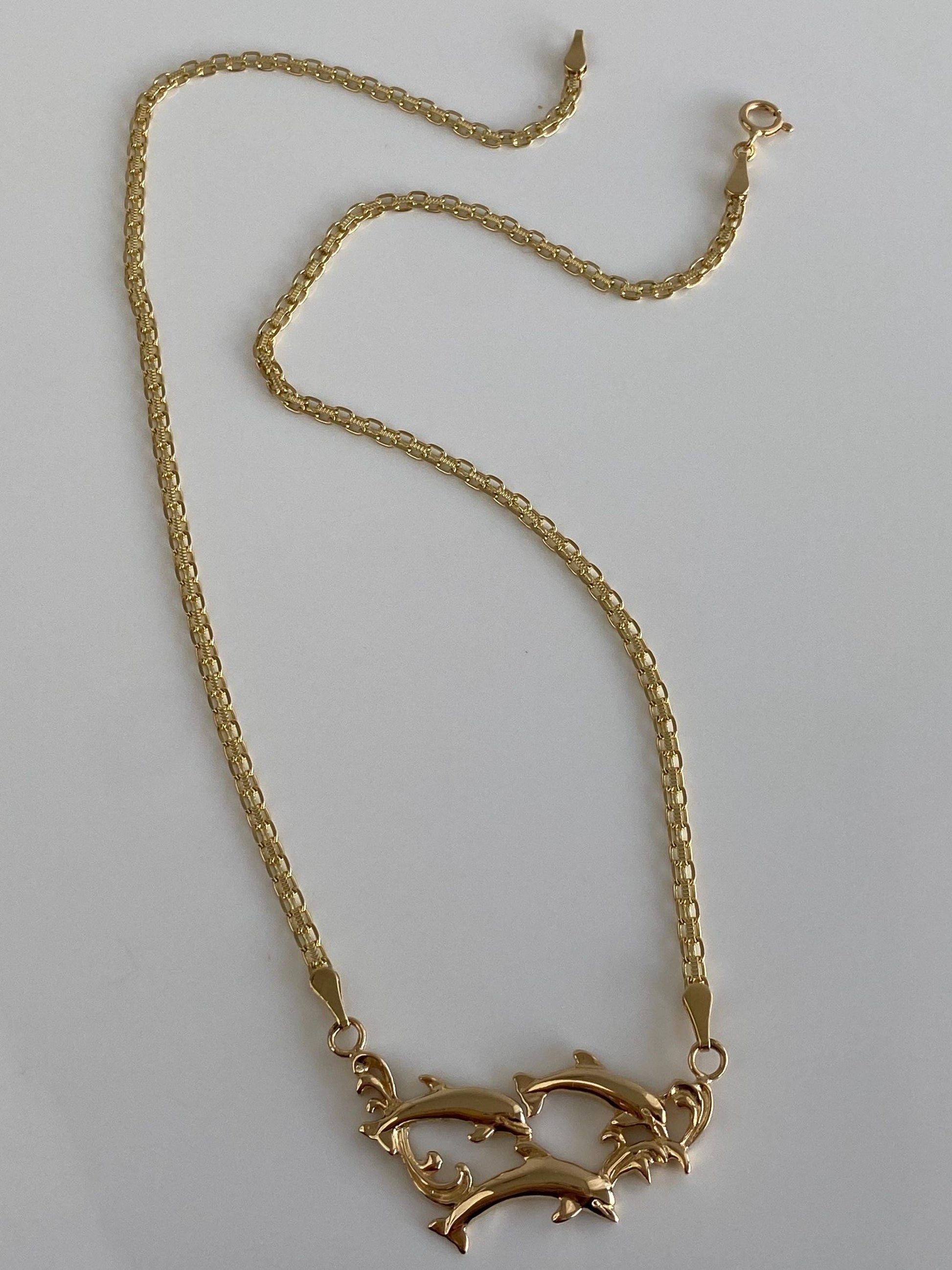 Vintage Solid 14k Yellow Gold Dolphins Swimming Bismark Chain Necklace - 18 inches