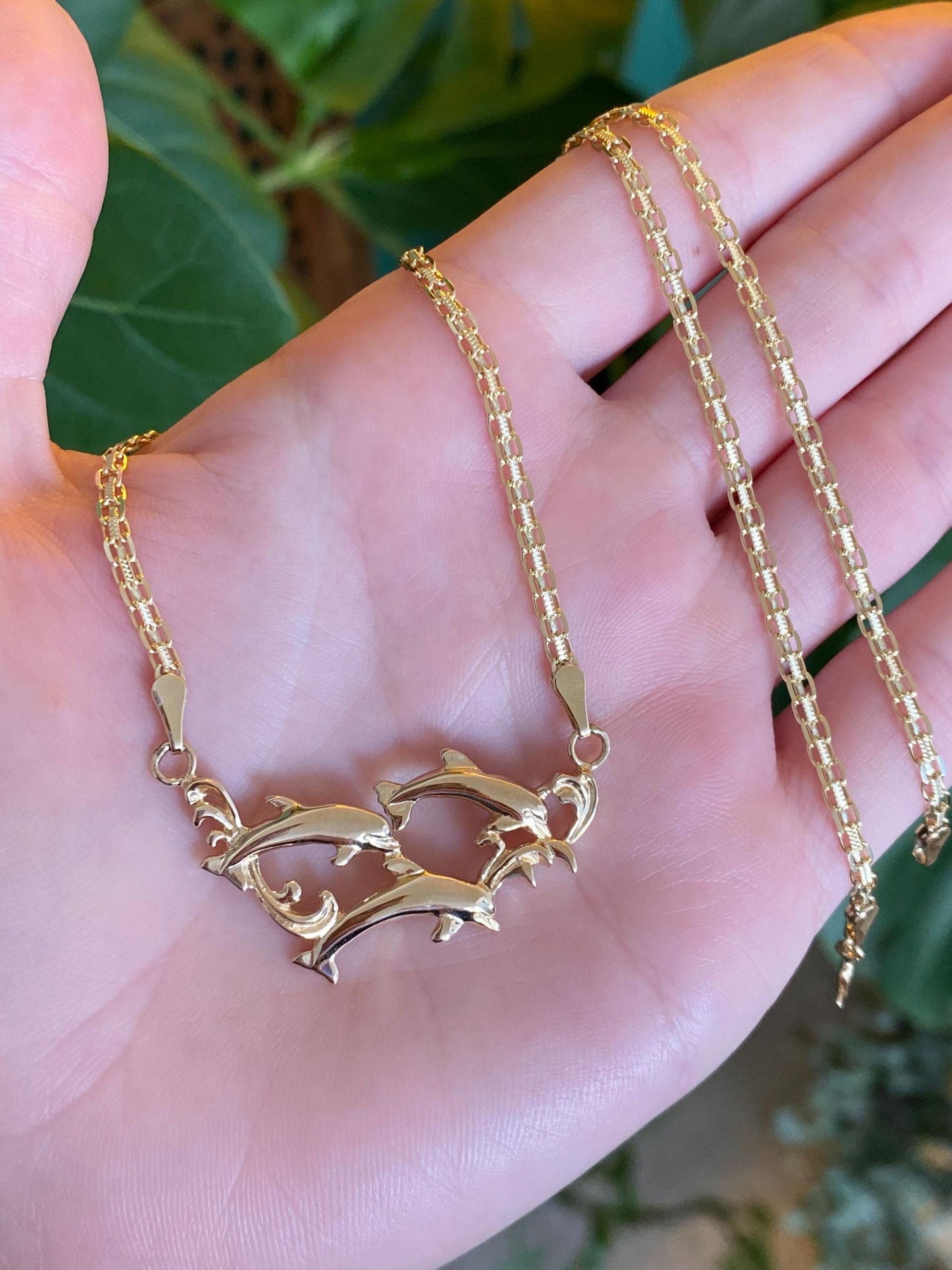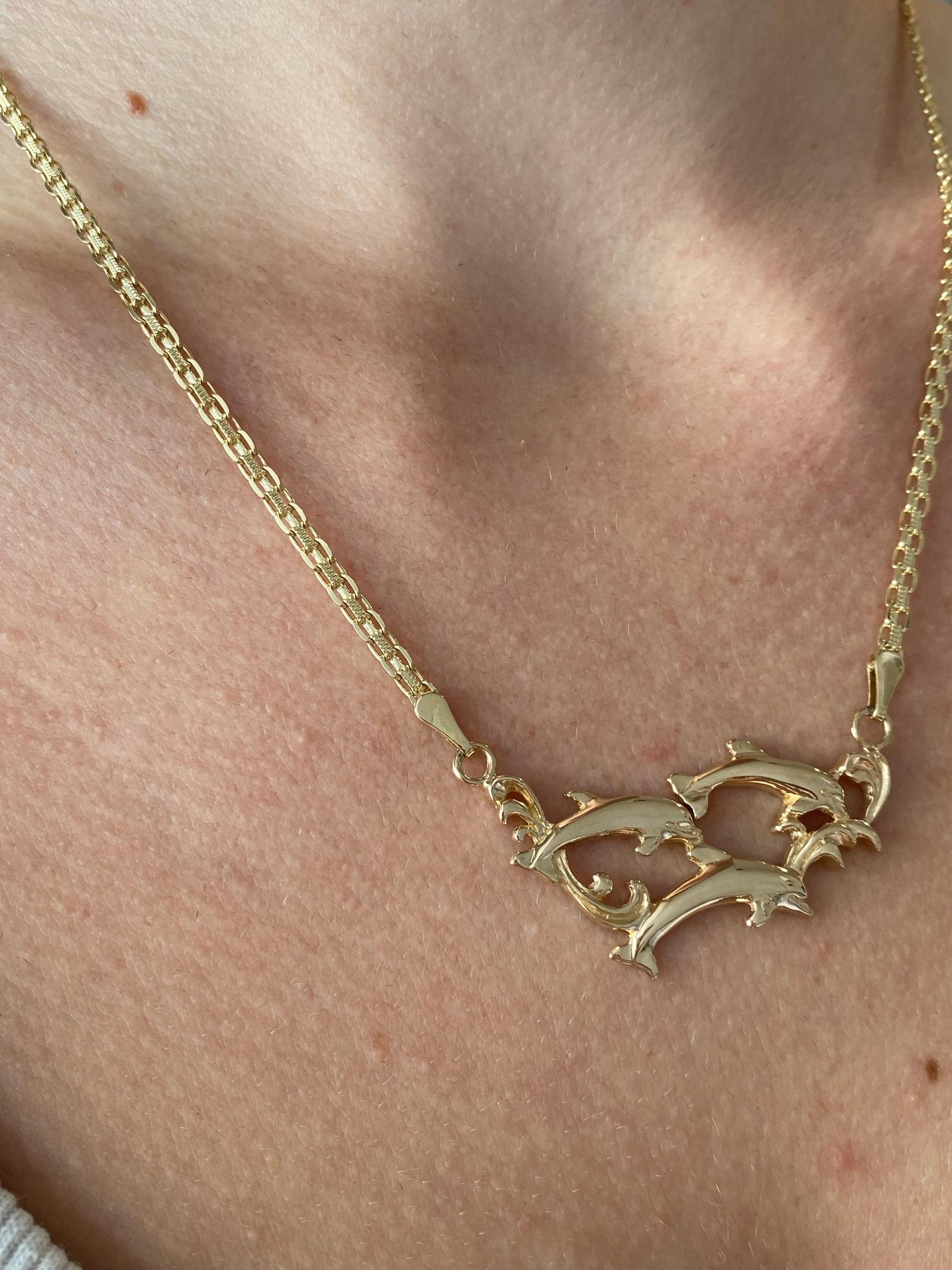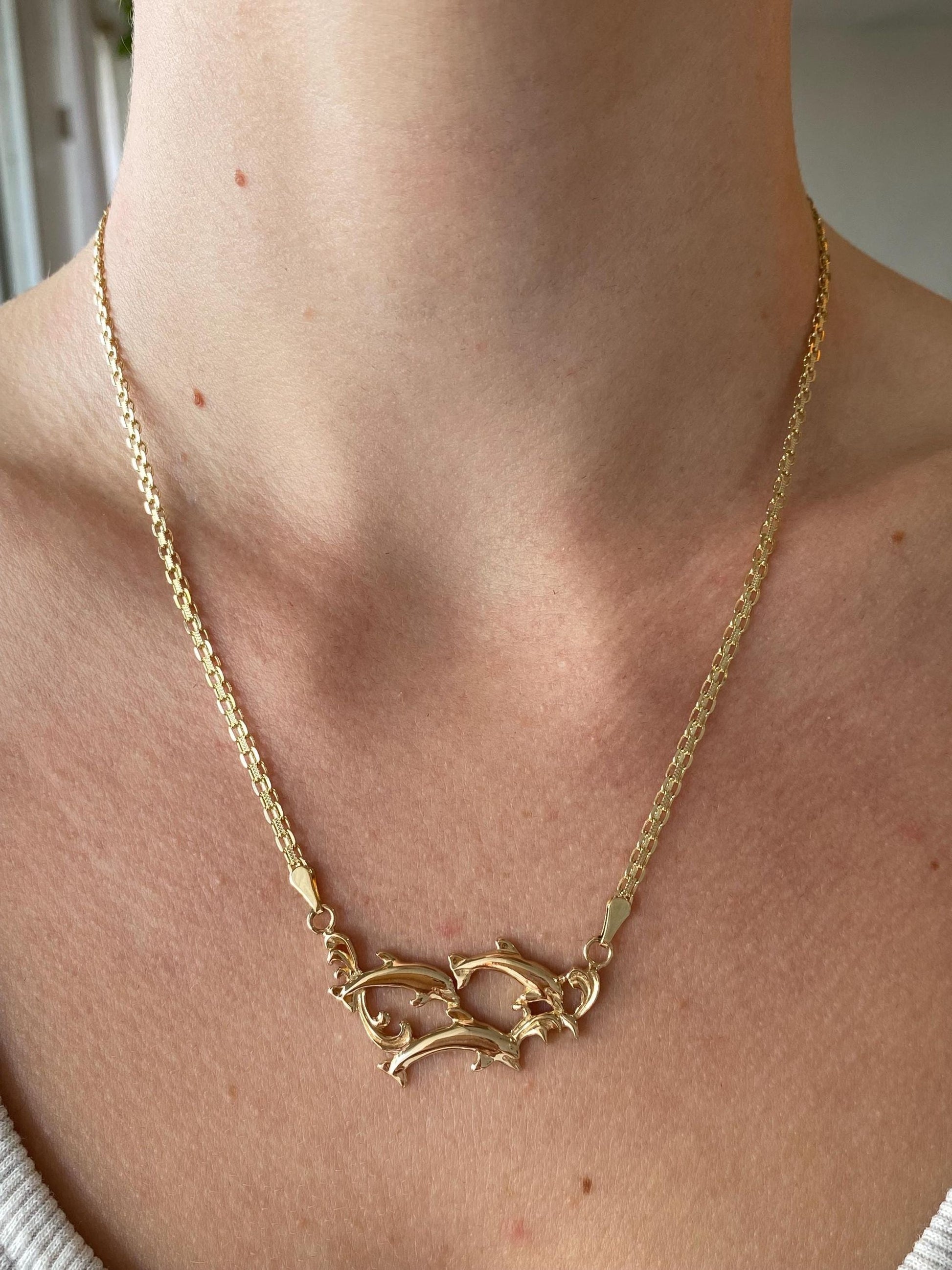 Vintage Solid 14k Yellow Gold Dolphins Swimming Bismark Chain Necklace - 18 inches