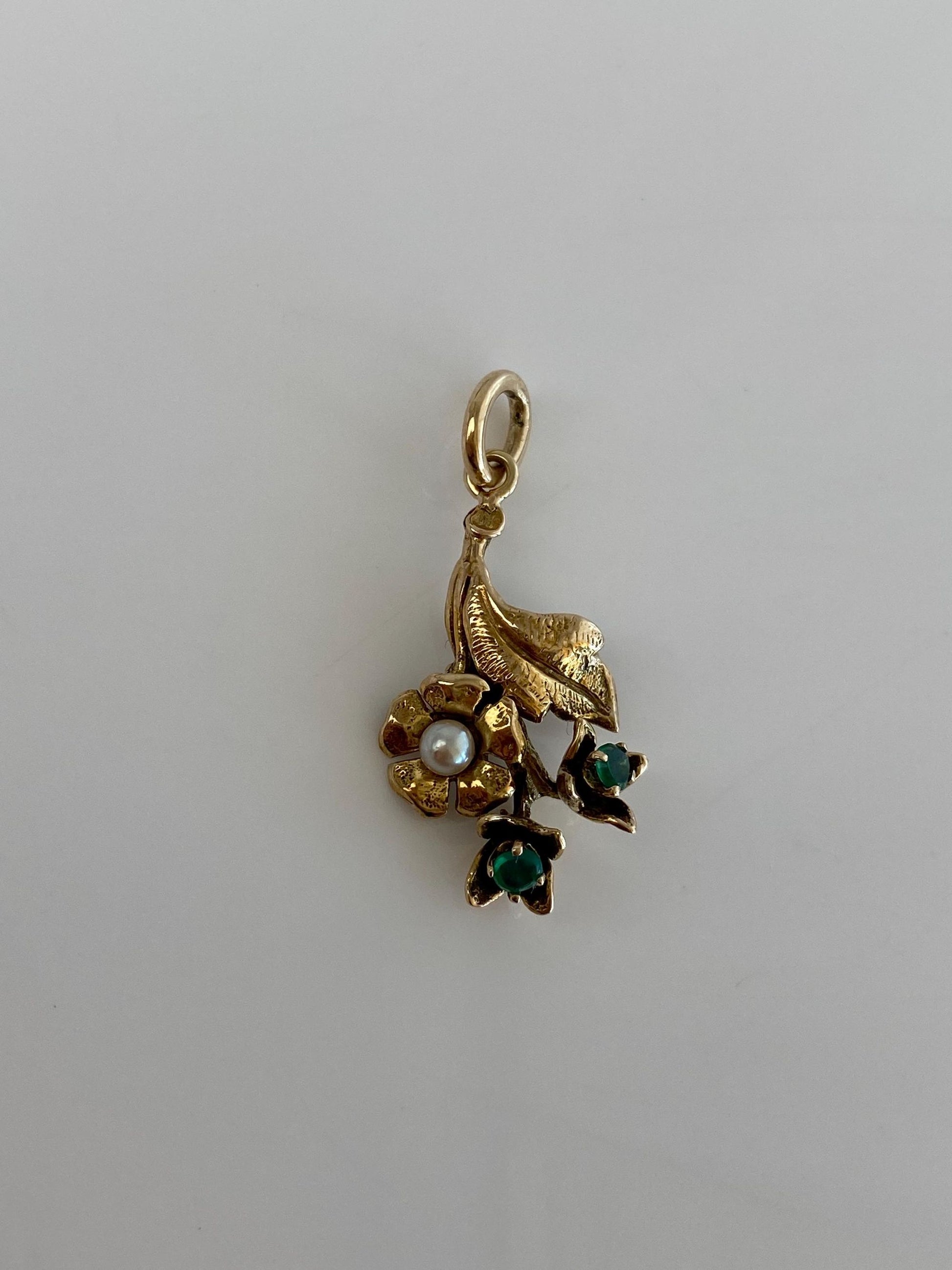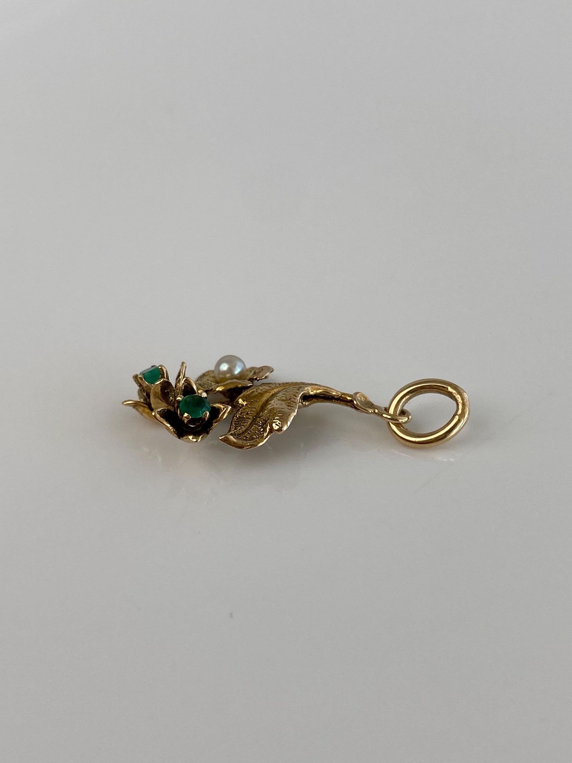 Vintage Solid 14k Yellow Gold Emerald Pearl Flower Leaf Charm