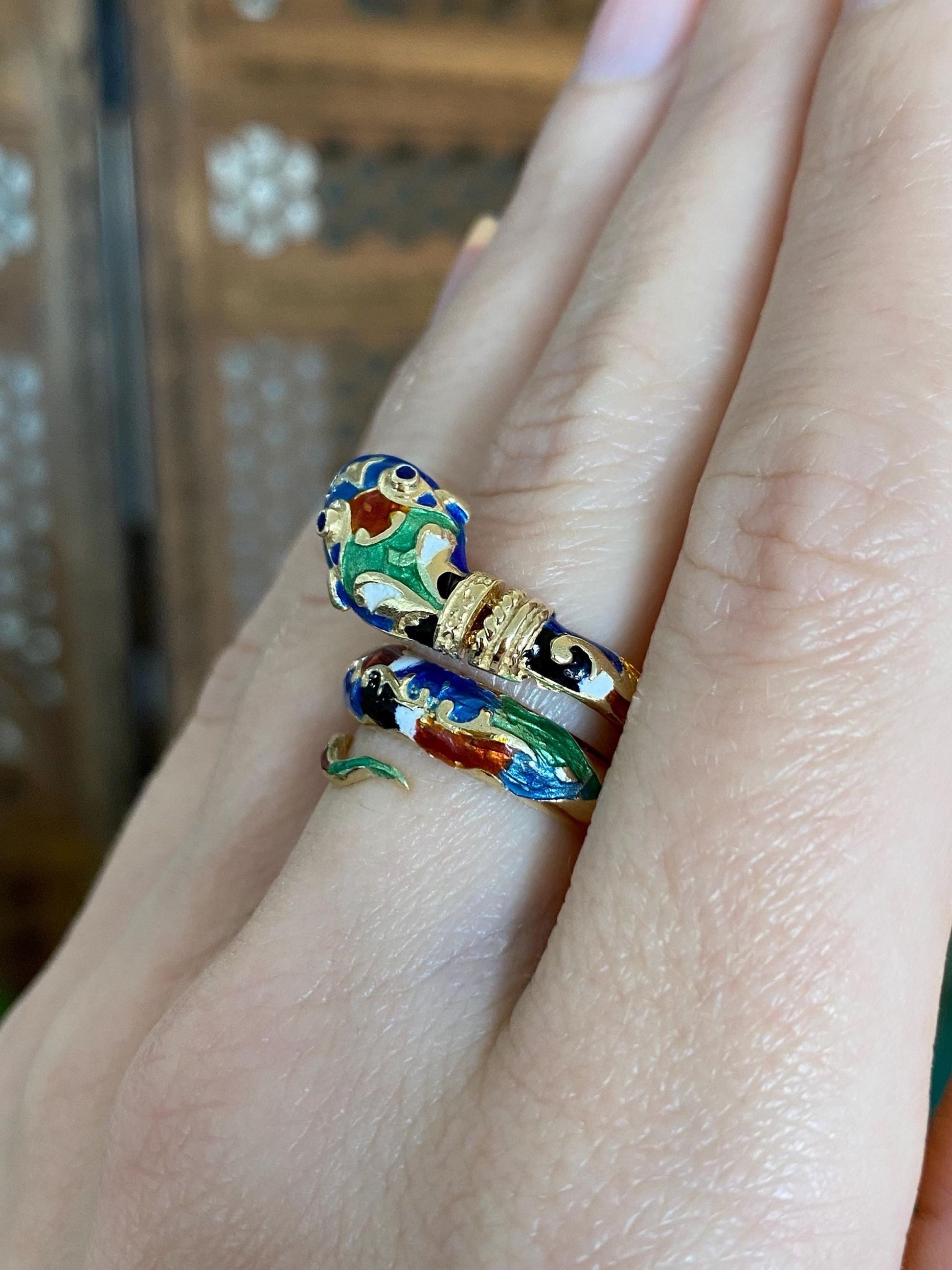 Vintage Solid 14k Yellow Gold Enamel Snake Wrap Ring - Size 6