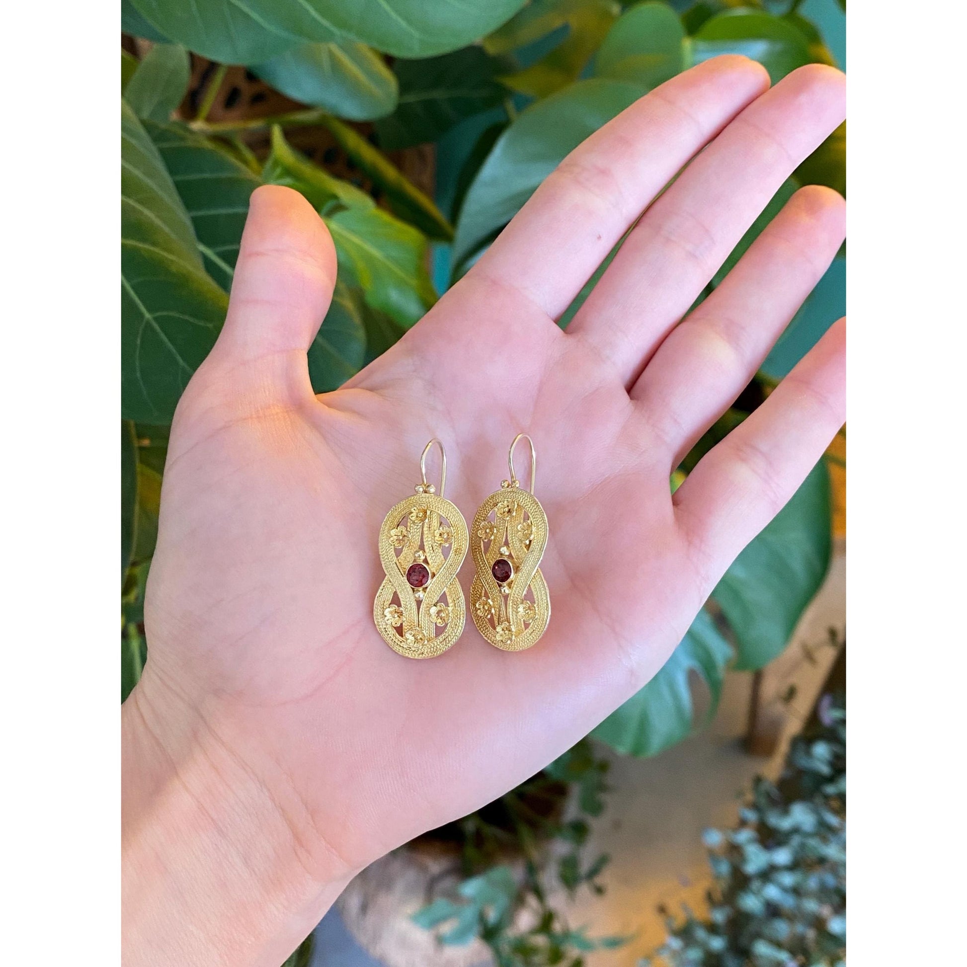 Vintage Solid 14k Yellow Gold Garnet Floral Dangle Earrings
