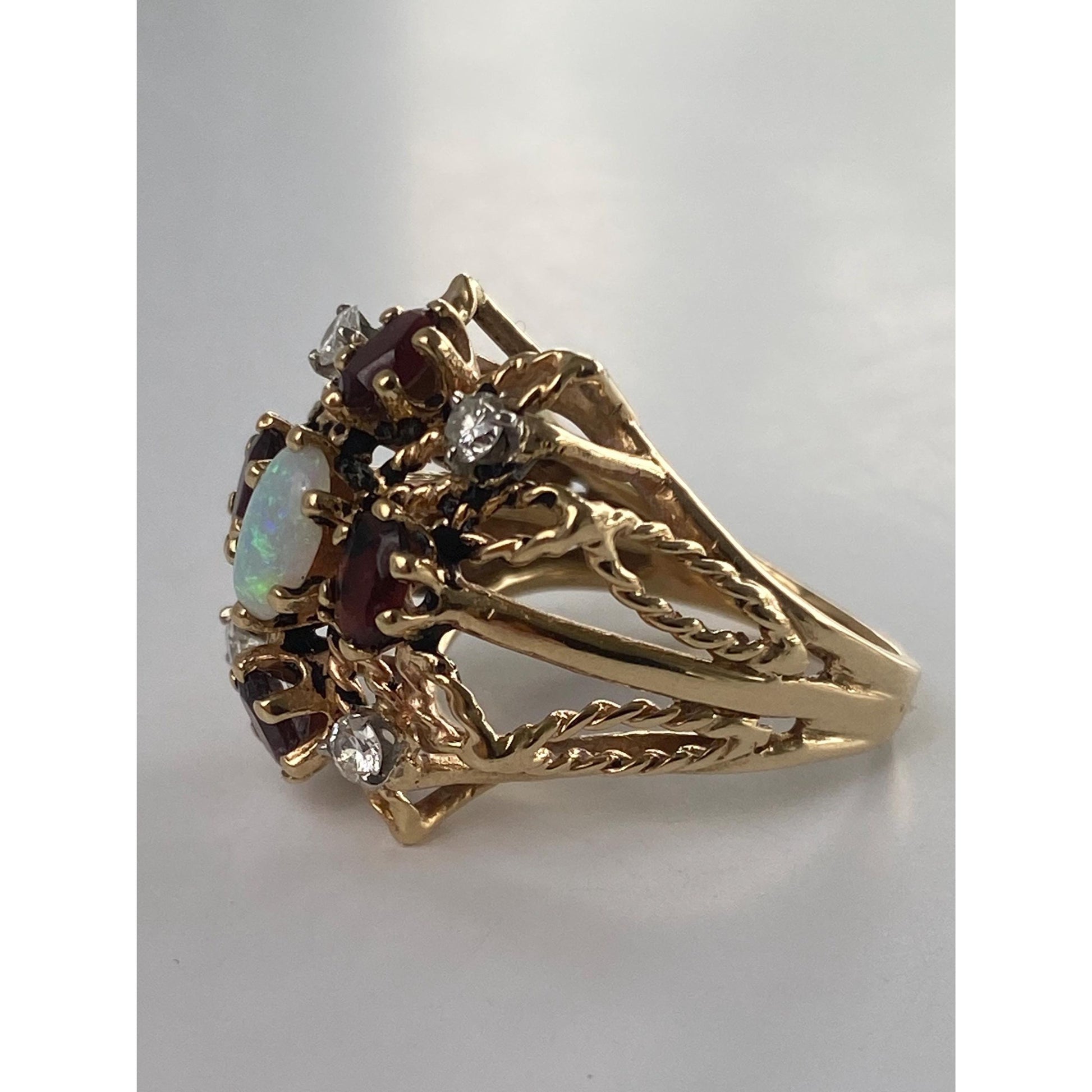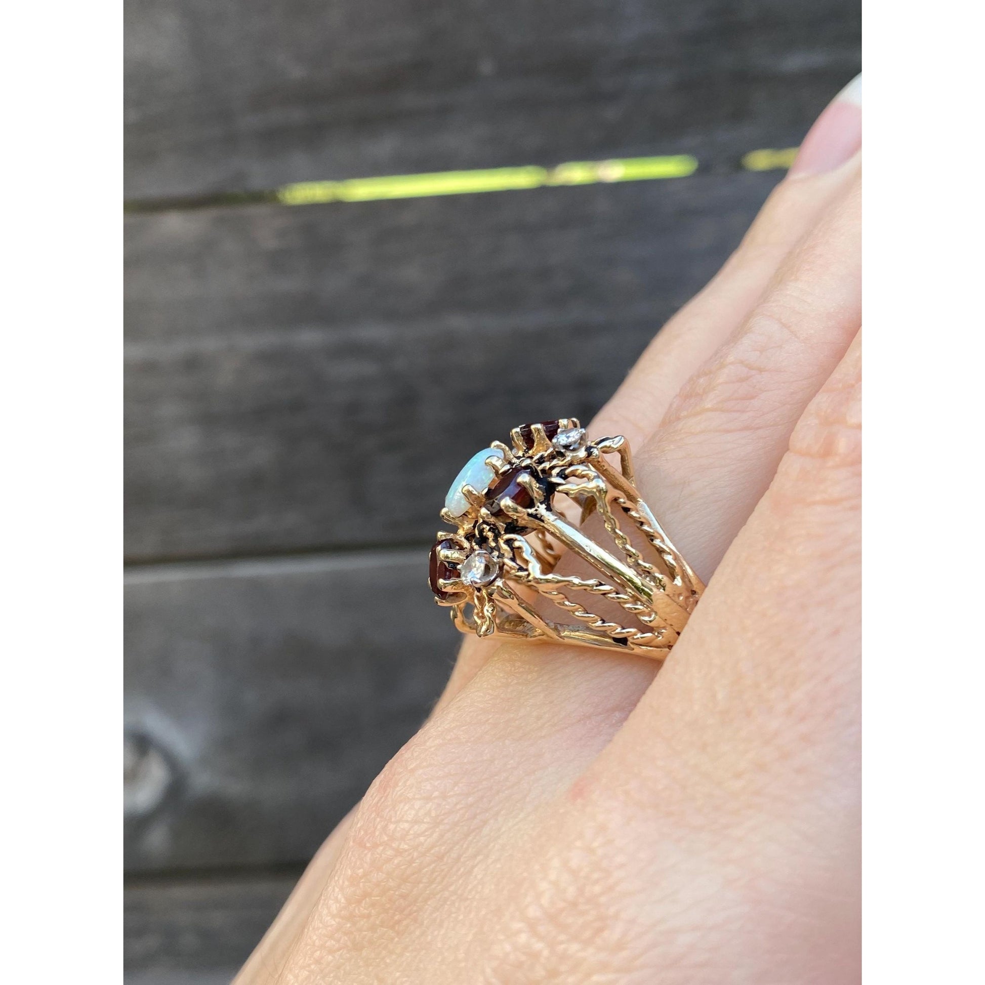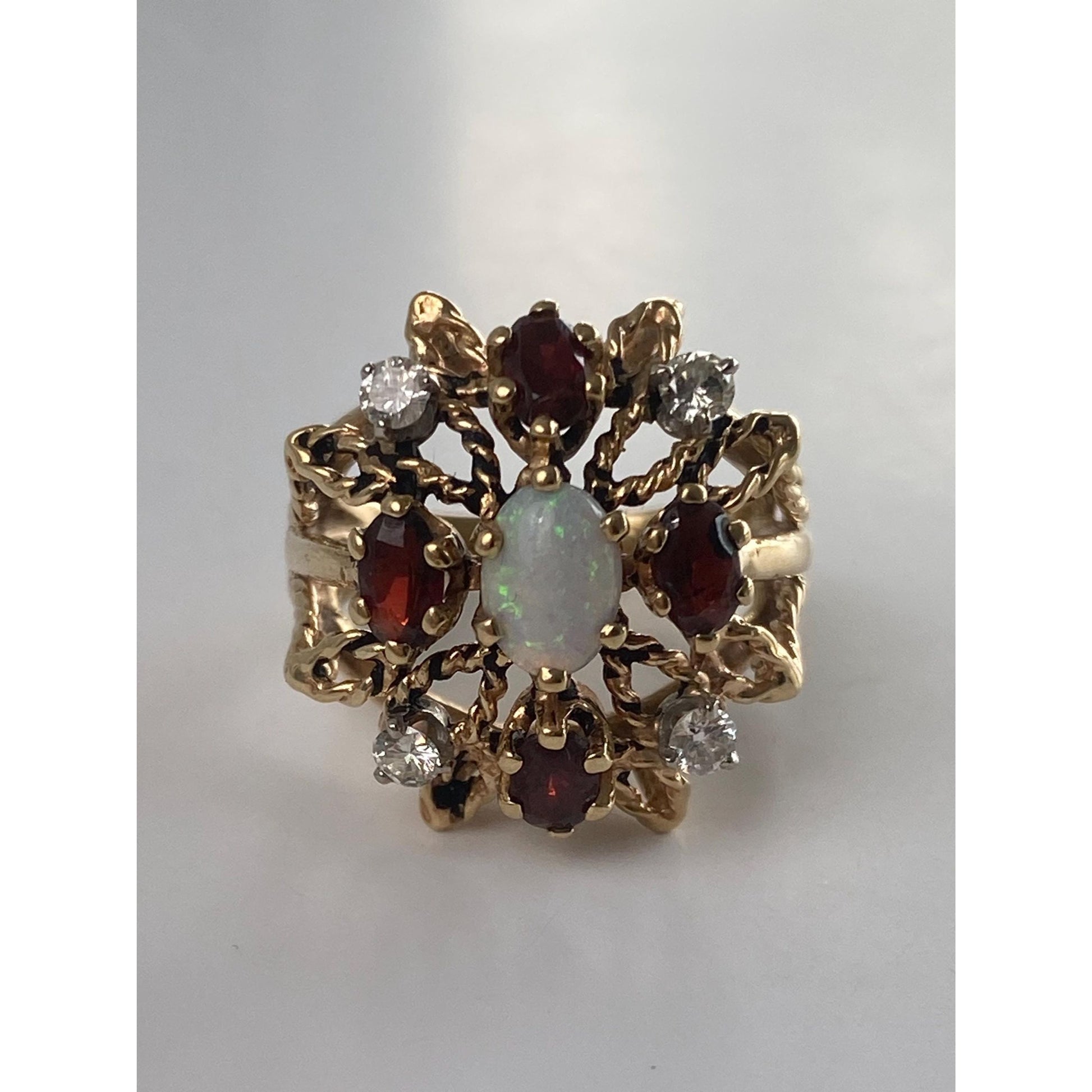 Vintage Solid 14k Yellow Gold Garnet Opal Diamond Cocktail Ring - Size 6.75