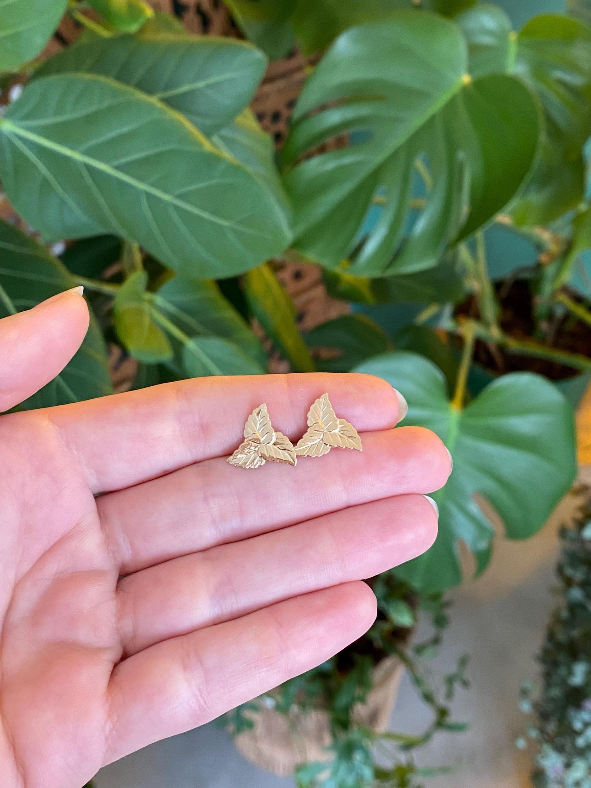 Vintage Solid 14k Yellow Gold Leaves Stud Earrings