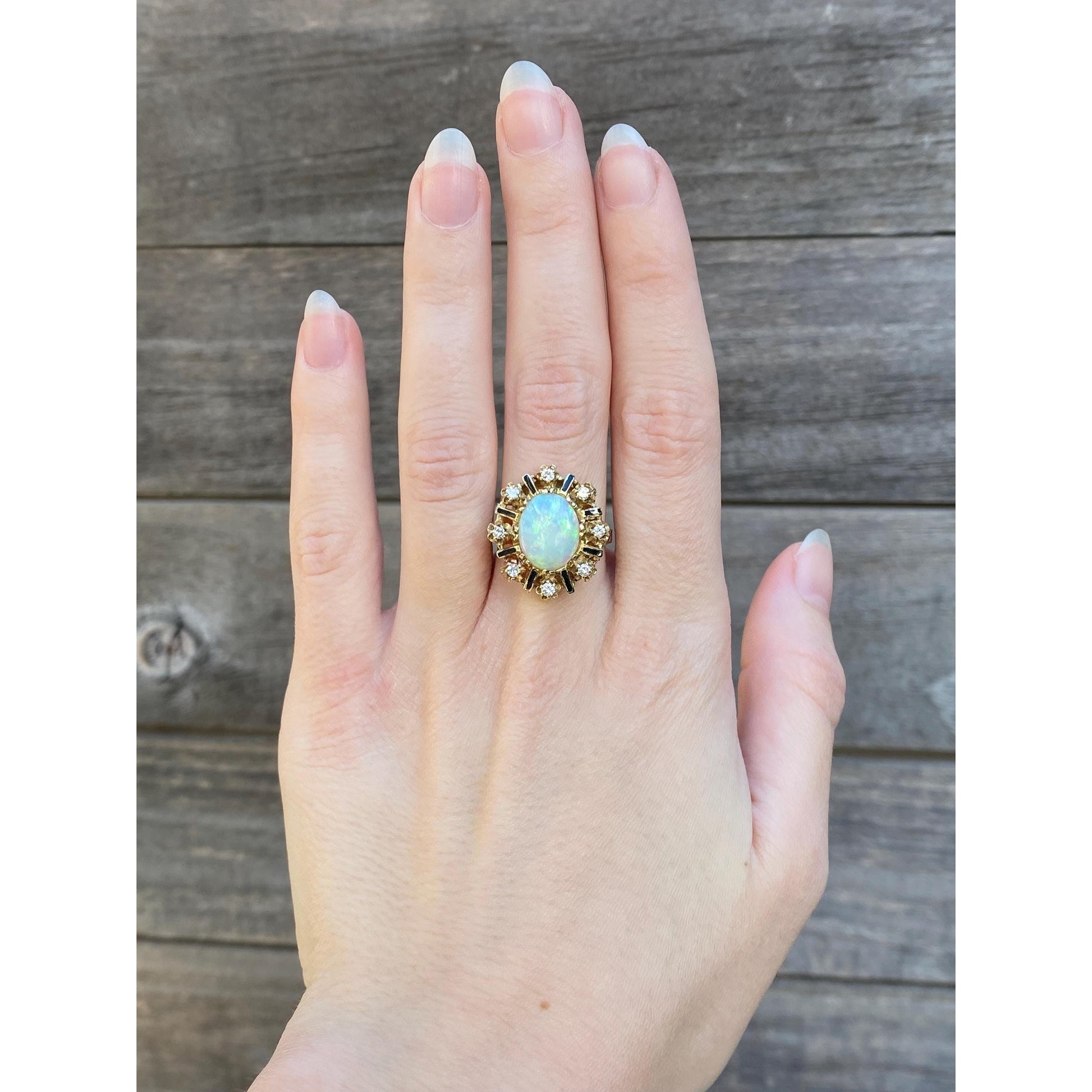 Vintage Solid 14k Yellow Gold Opal Diamond Halo Black Enamel Cocktail Ring - Size 7