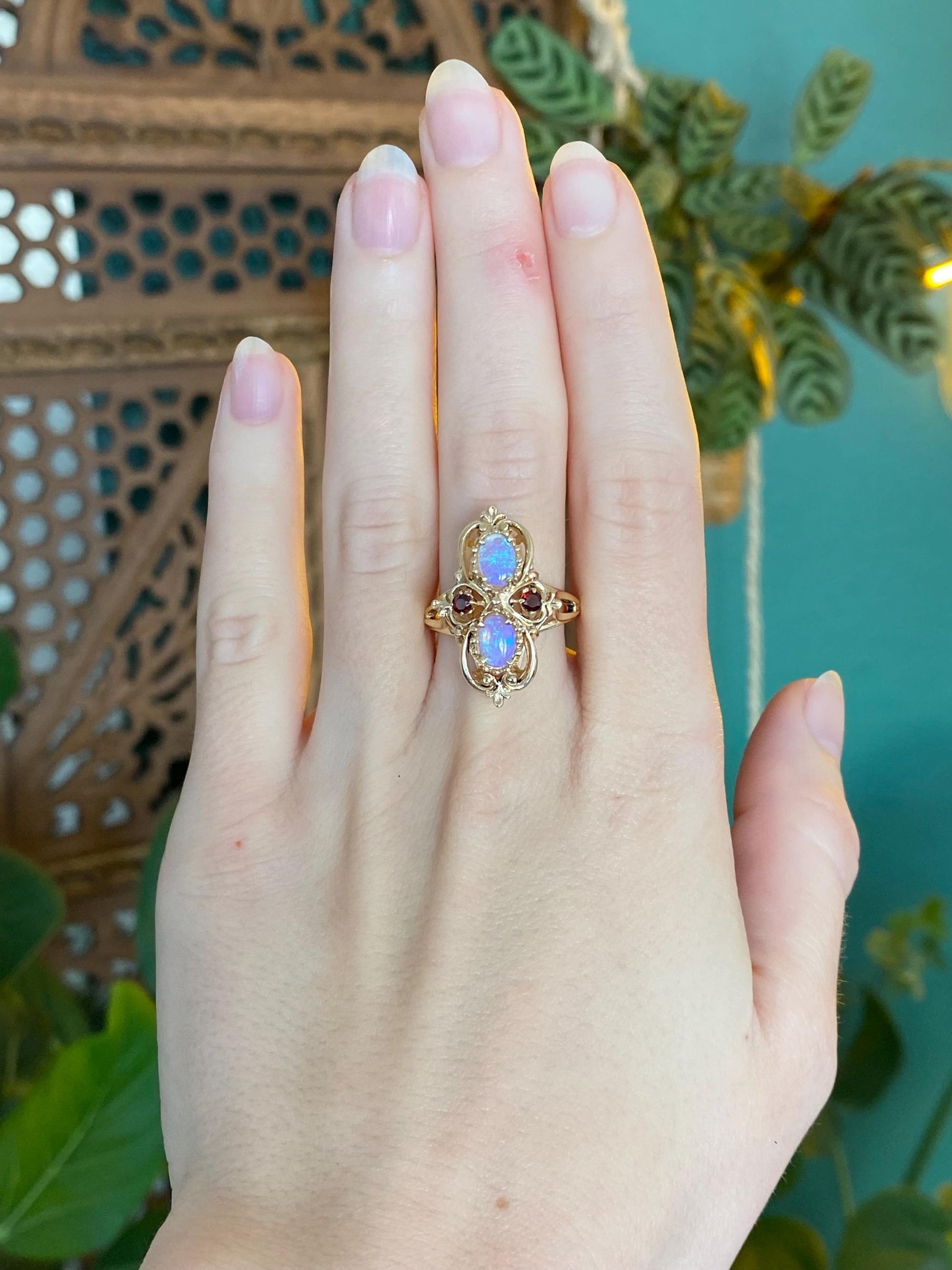 Vintage Solid 14k Yellow Gold Opal Garnet Ring - Size 7.5