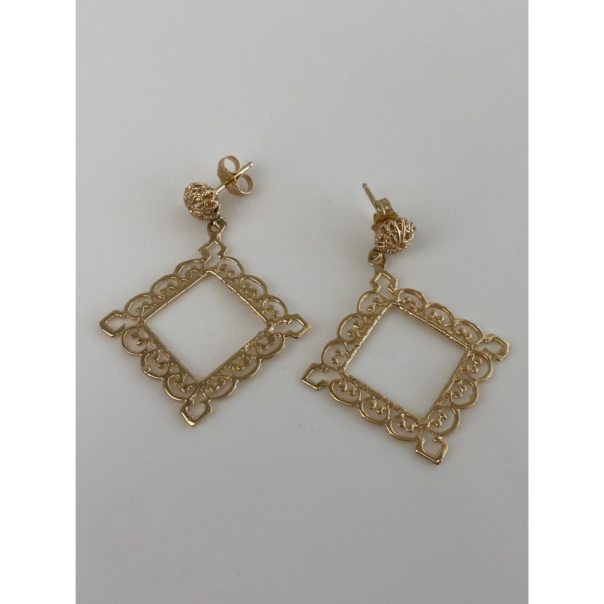Vintage Solid 14k Yellow Gold Open Work Picture Frame Dangle Stud Earrings