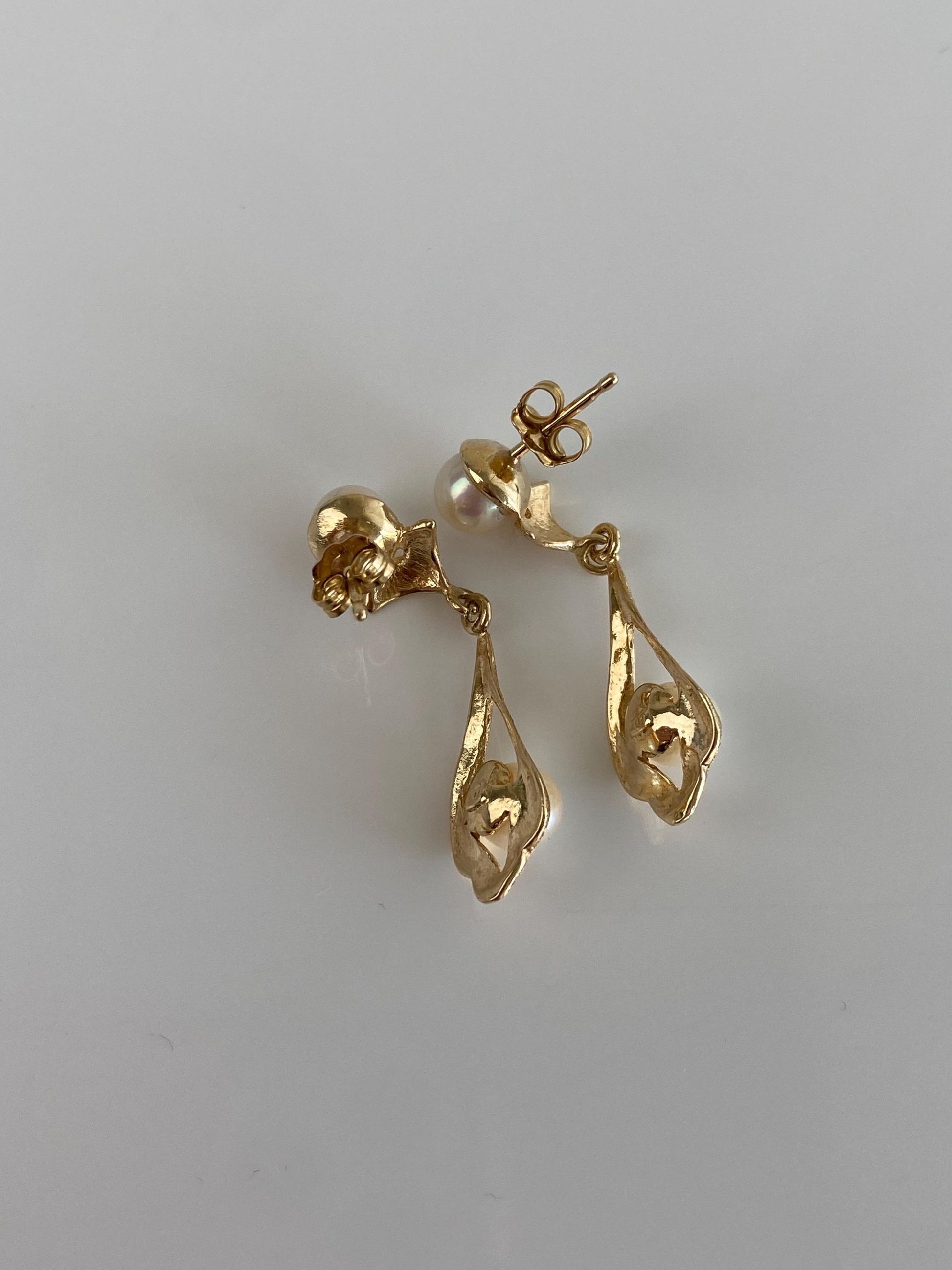 Vintage Solid 14k Yellow Gold Pearl Dangle Stud Earrings