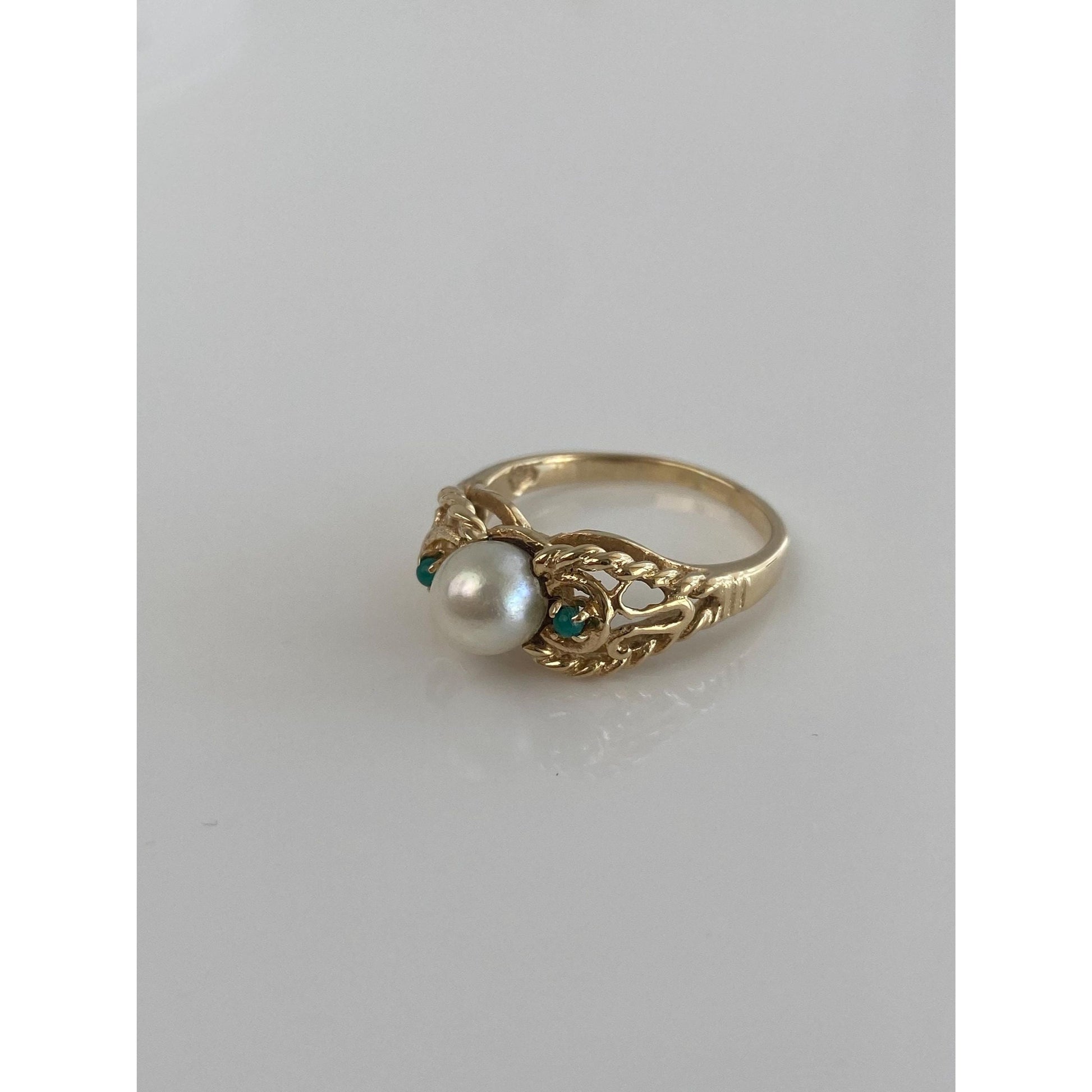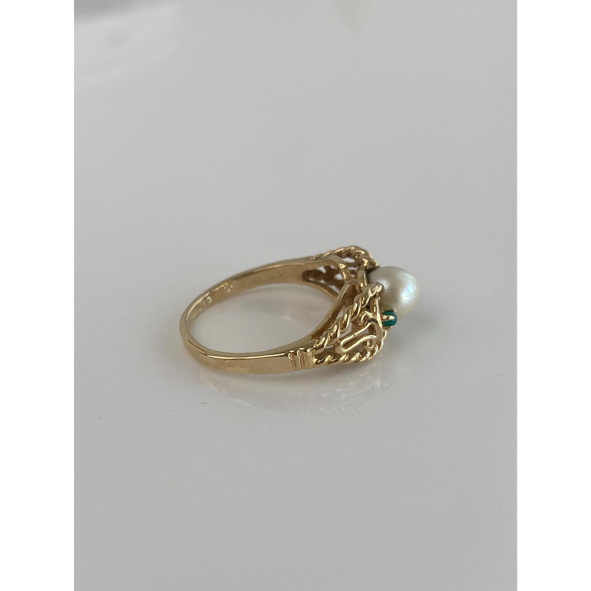 Vintage Solid 14k Yellow Gold Pearl Green Stone Rope Ring Band - Size 7.25