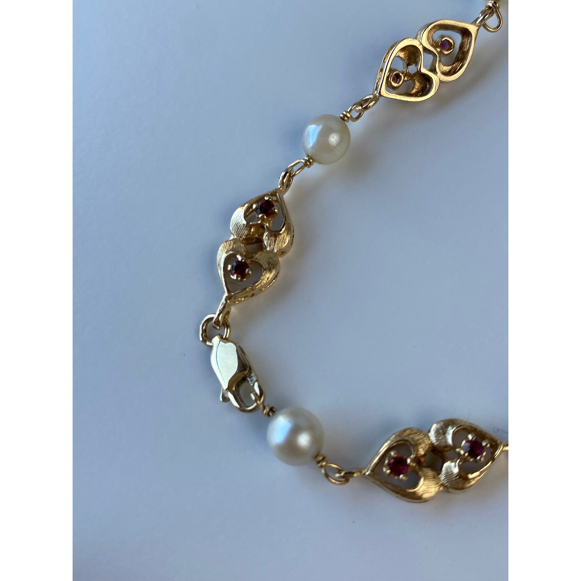 Vintage Solid 14k Yellow Gold Pearl & Red Cubic Zirconia Heart Link Bracelet - 8.25 inches