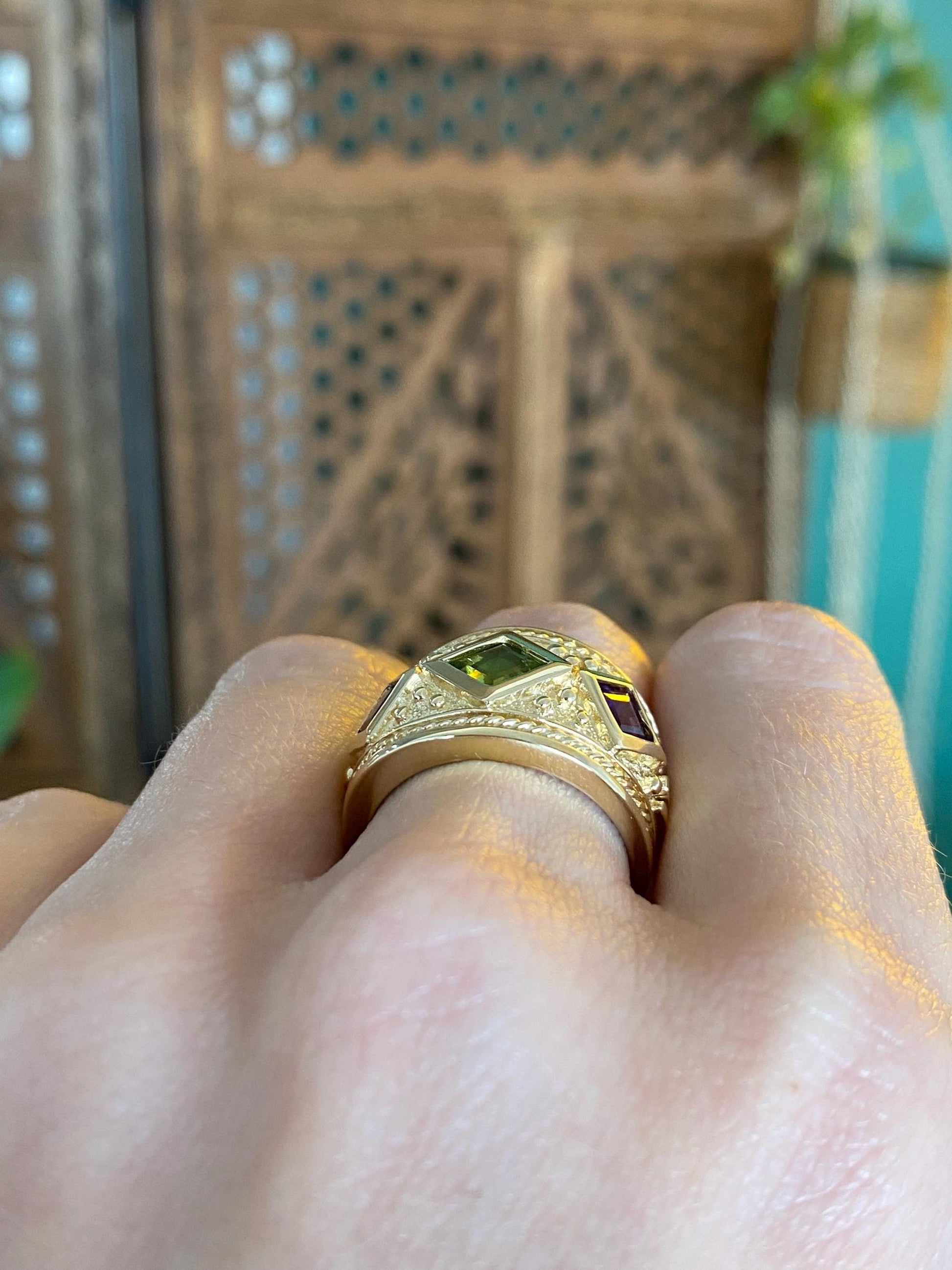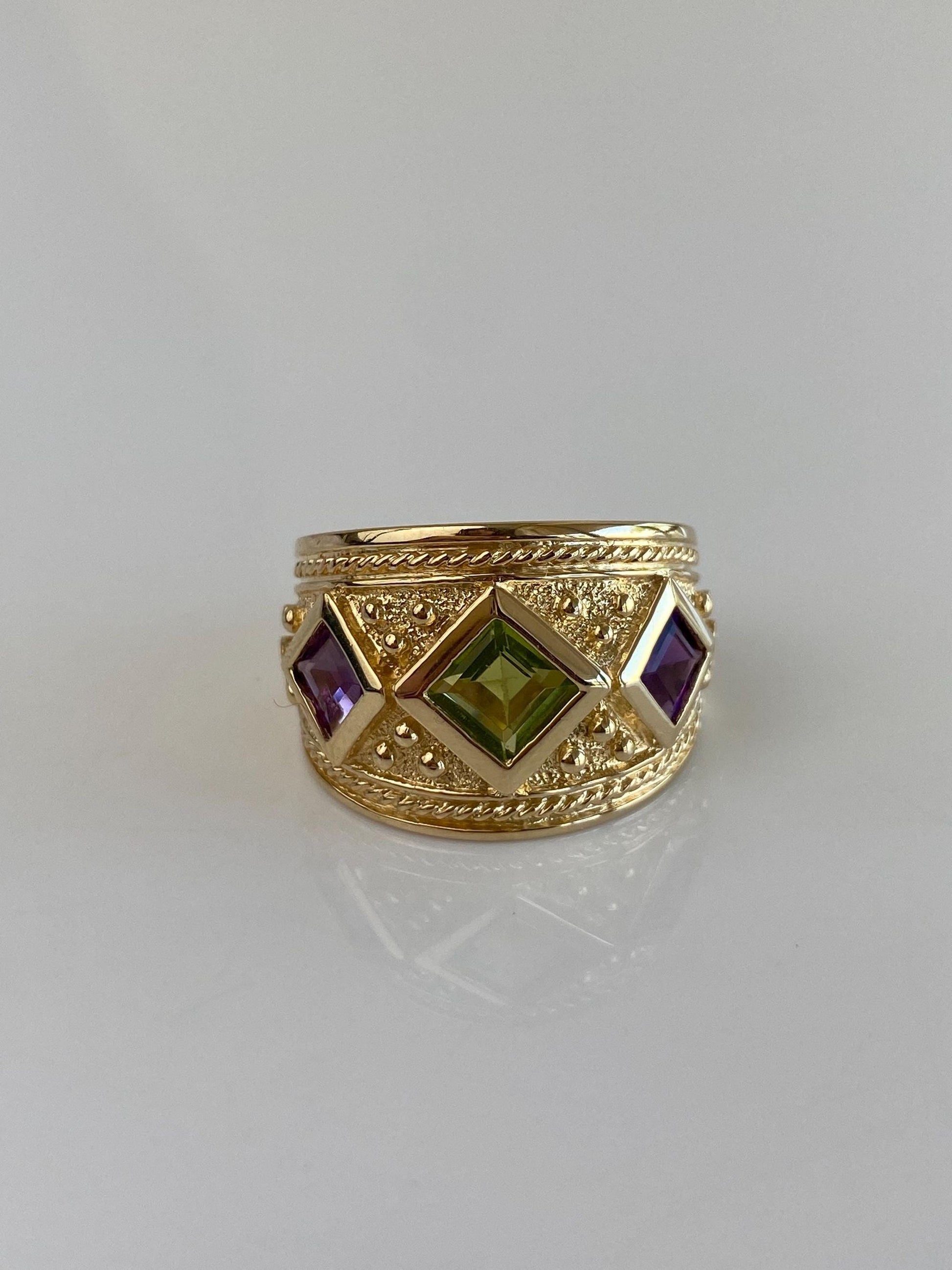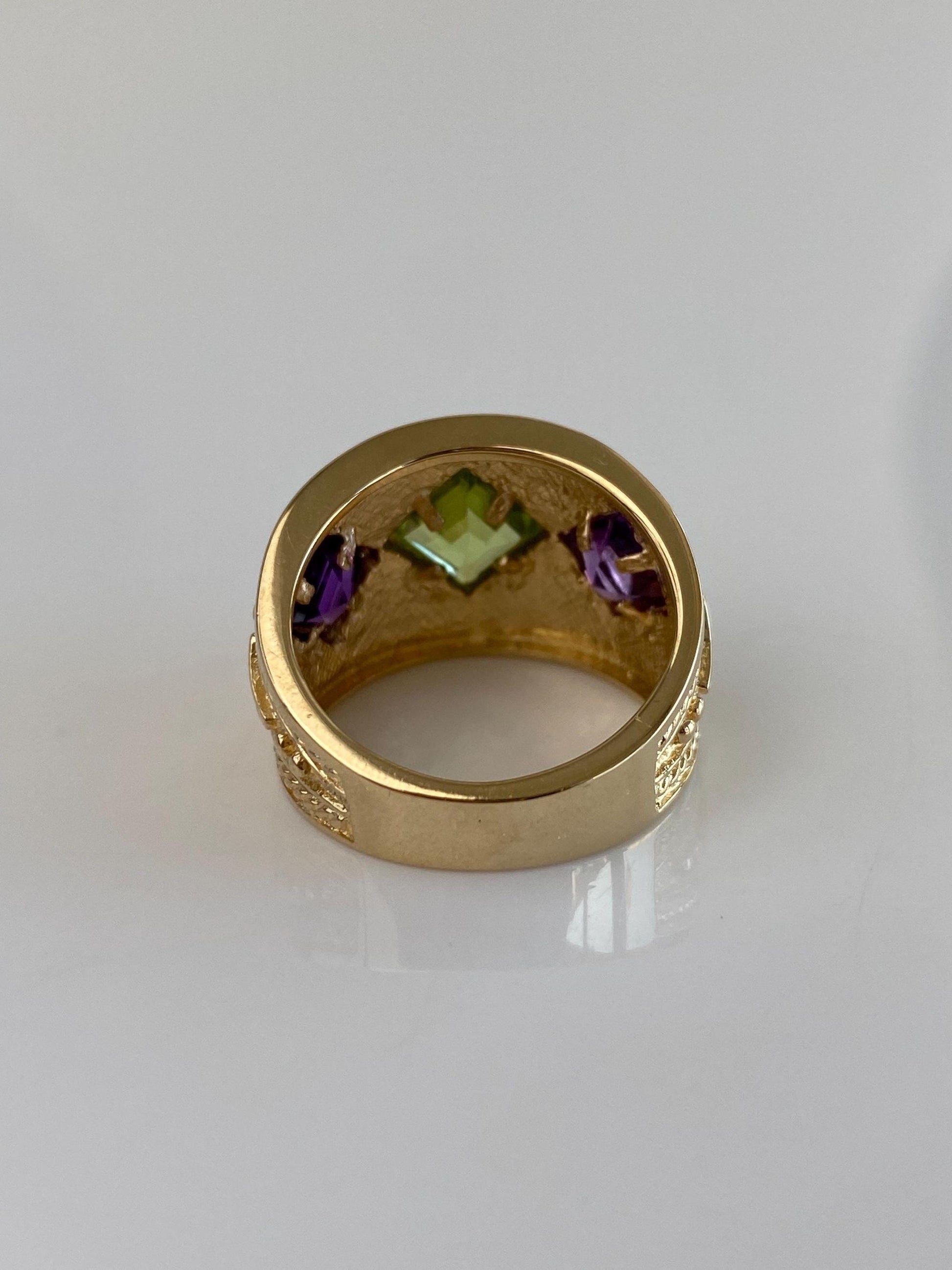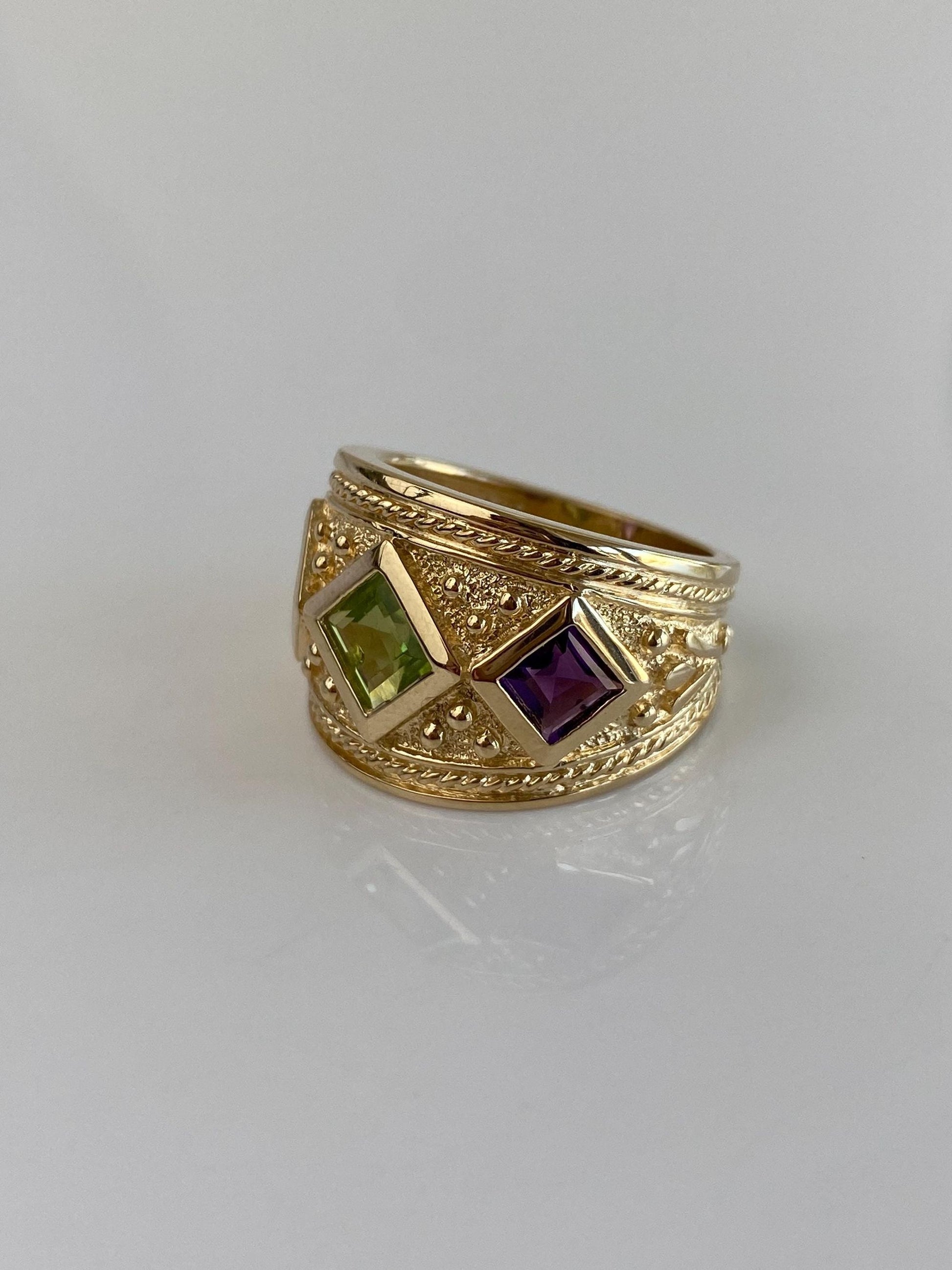 Vintage Solid 14k Yellow Gold Peridot Amethyst Designed Tapered Wide Ring Band - Size 6.75
