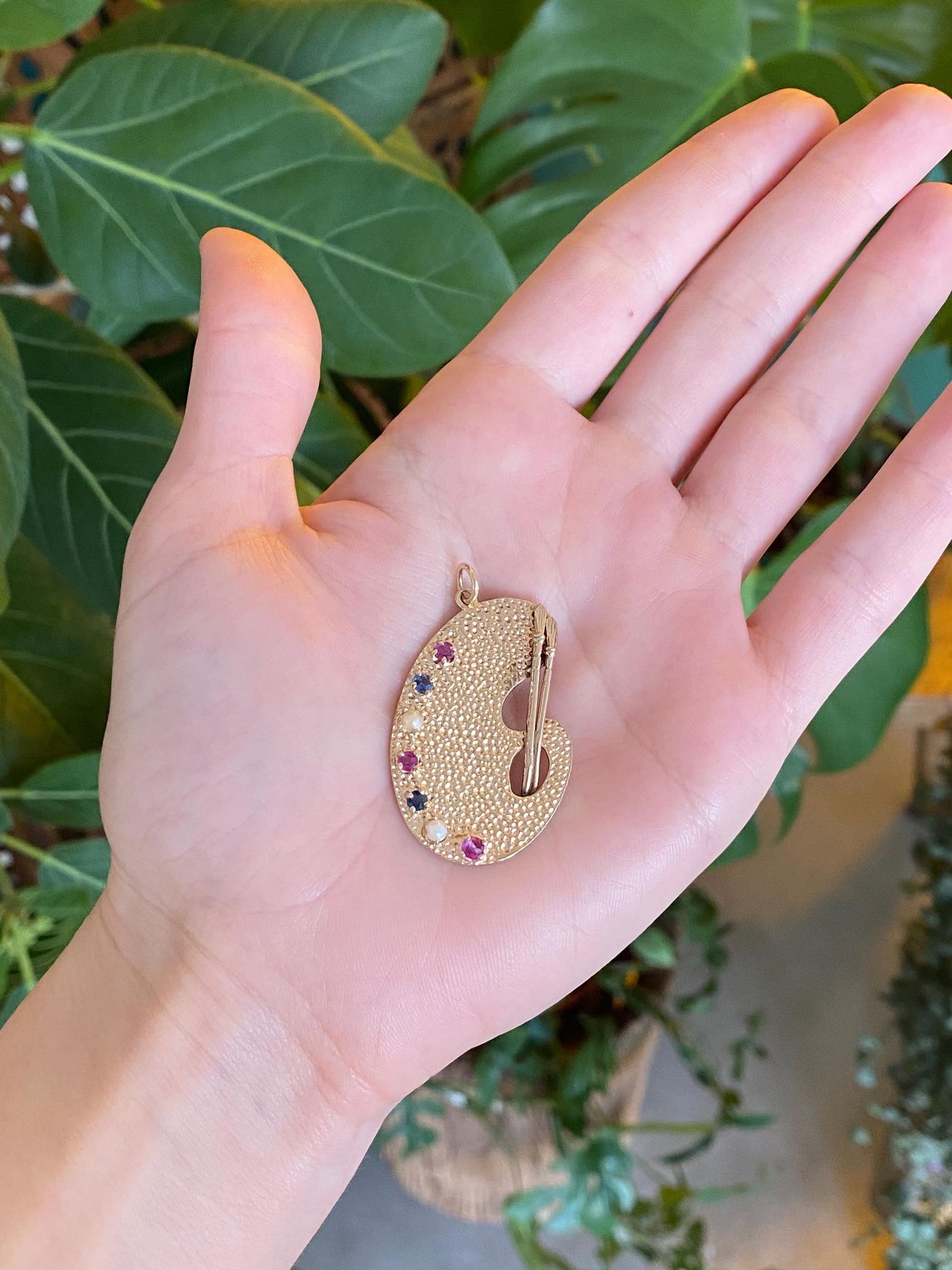 Vintage Solid 14k Yellow Gold Pink & Blue Sapphire Pearls Artist Pallet Charm