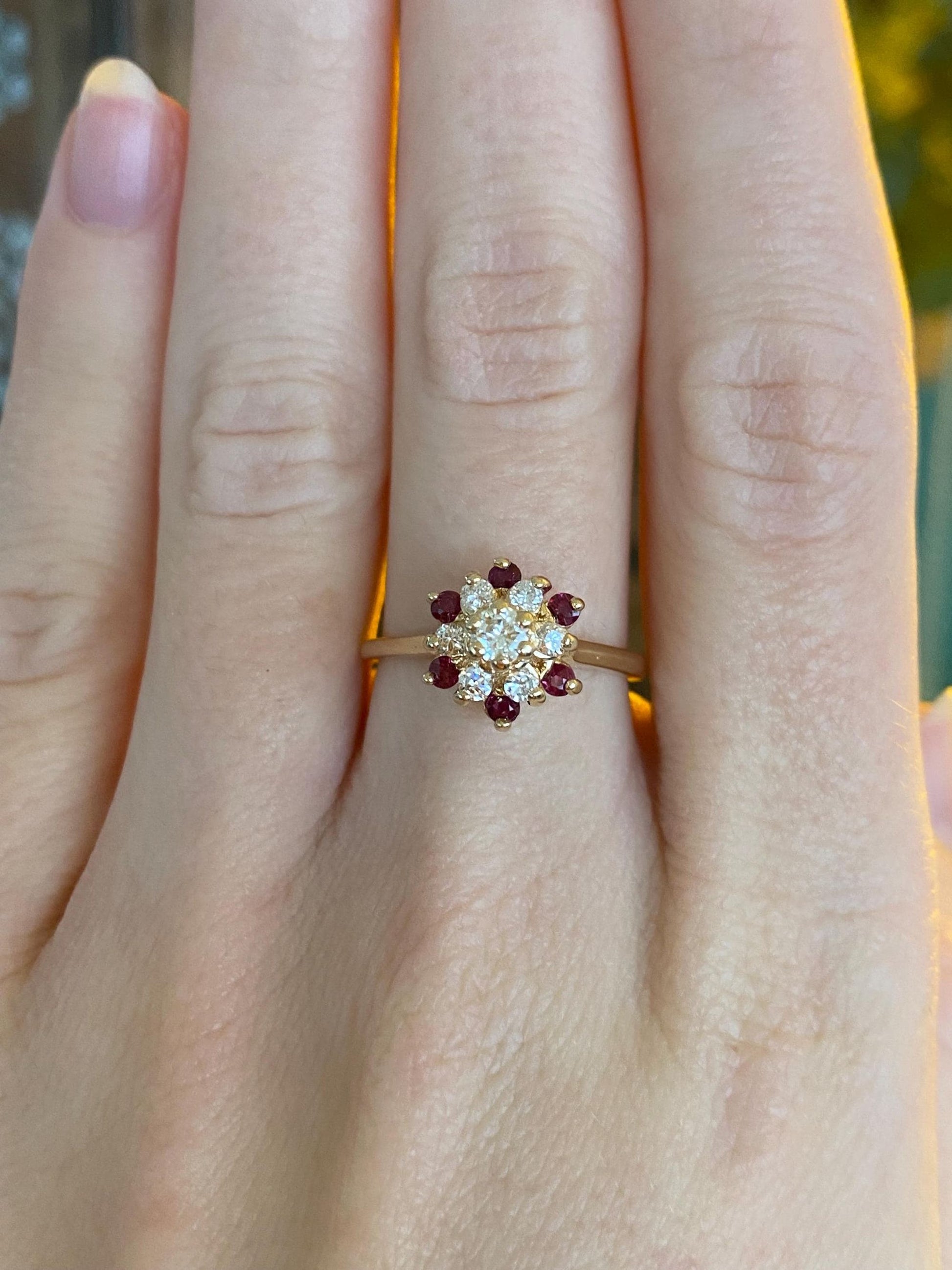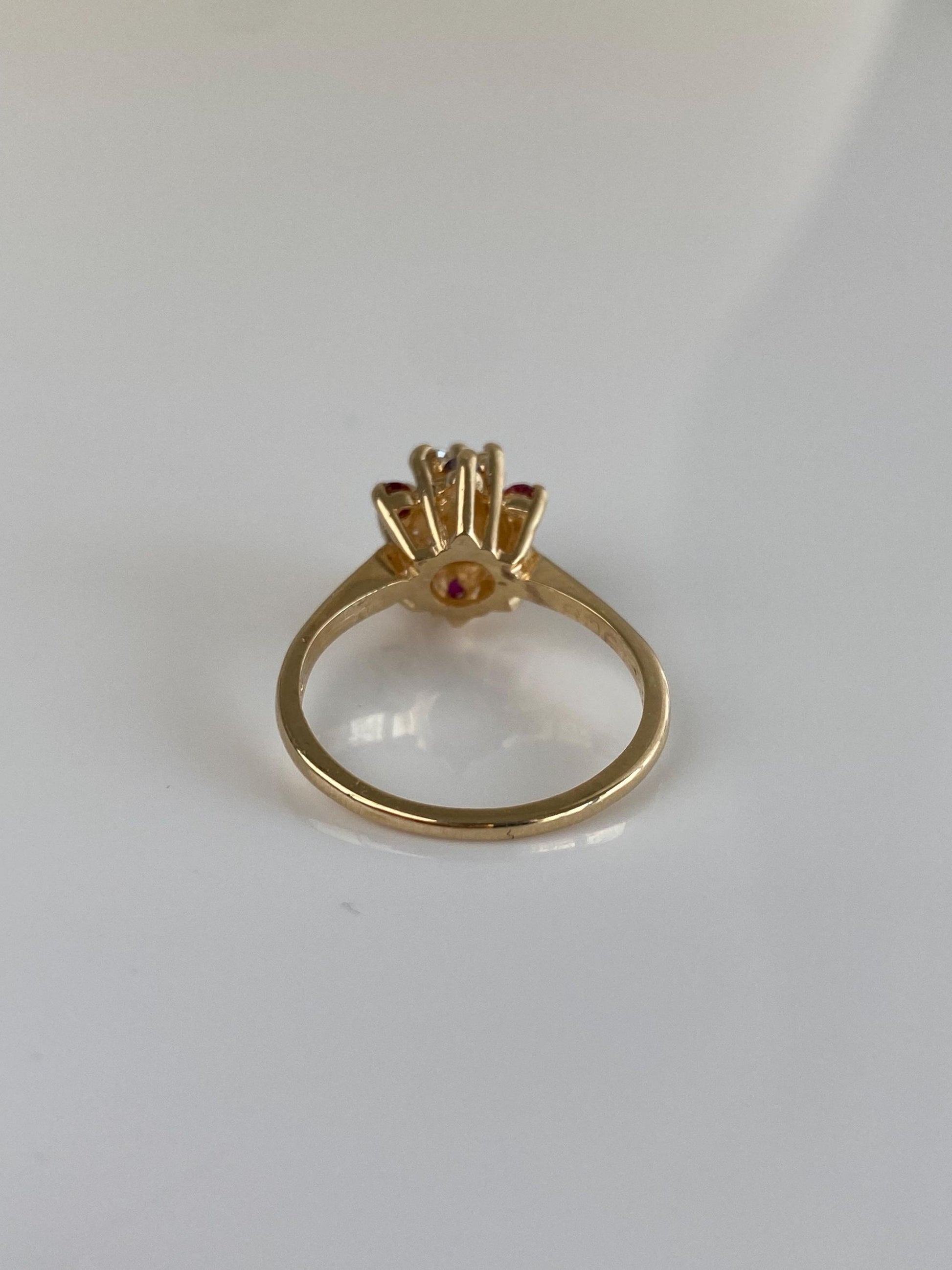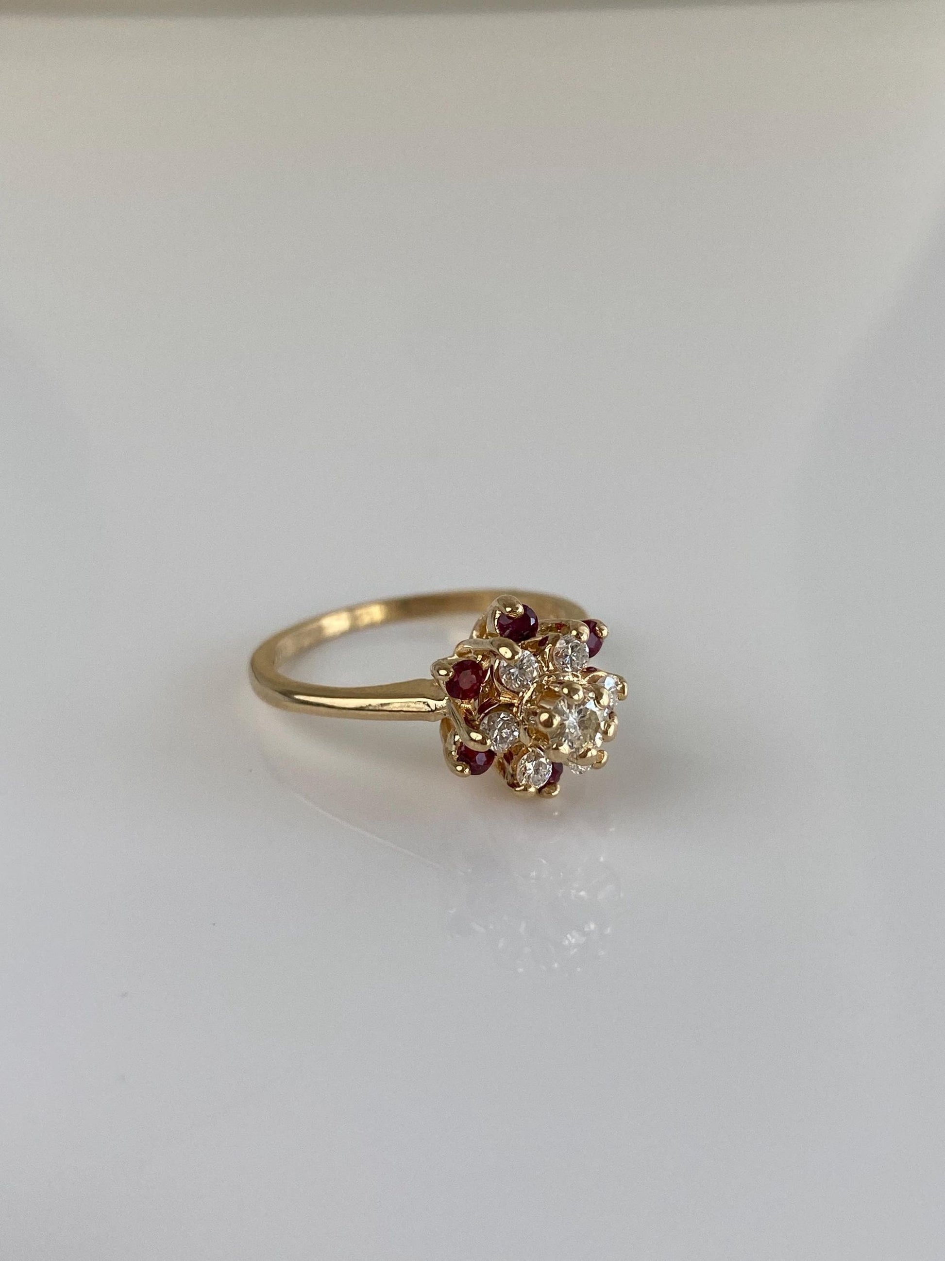 Vintage Solid 14k Yellow Gold Pink Spinel Diamond Flower Ring - Size 6.75