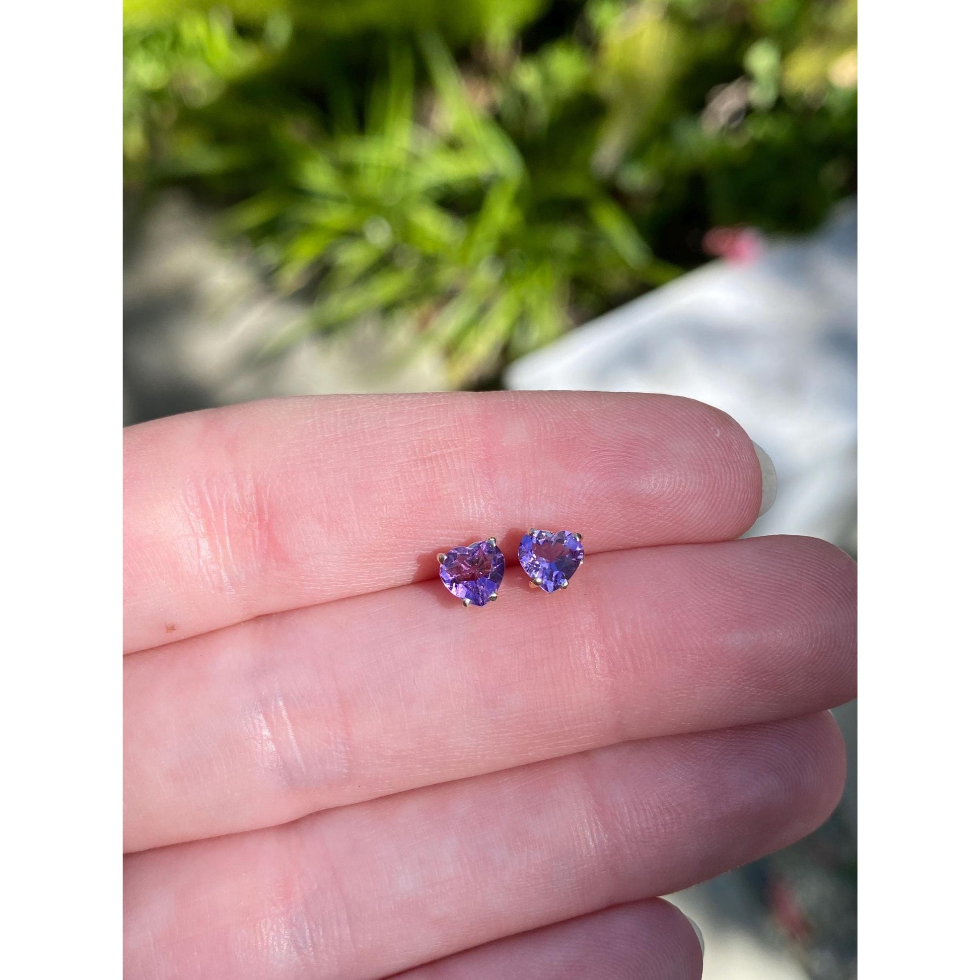 Vintage Solid 14k Yellow Gold Purple Cubic Zirconia Heart Stud Earrings