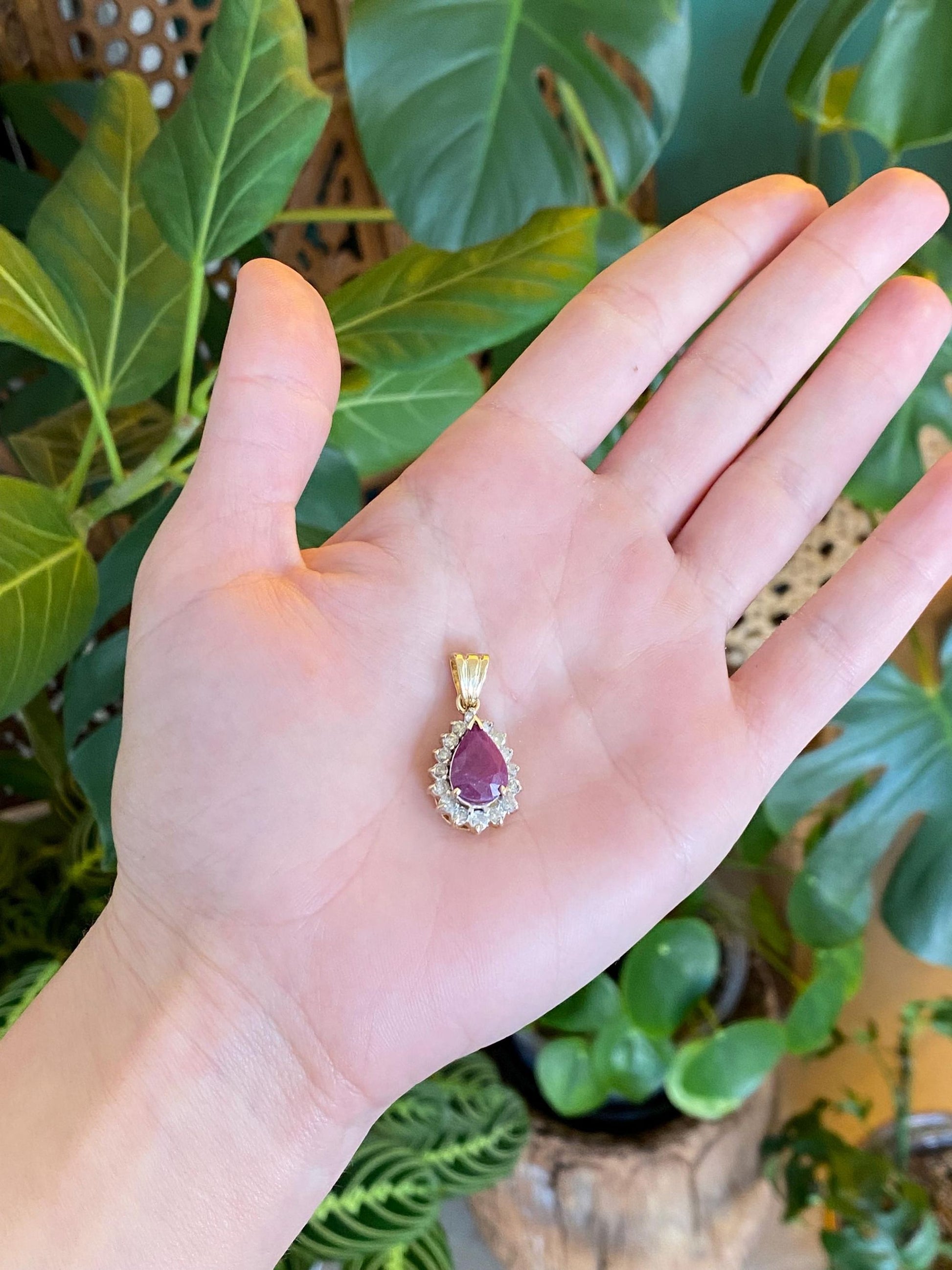 Vintage Solid 14k Yellow Gold Rose Cut Ruby Diamond Halo Teardrop Charm