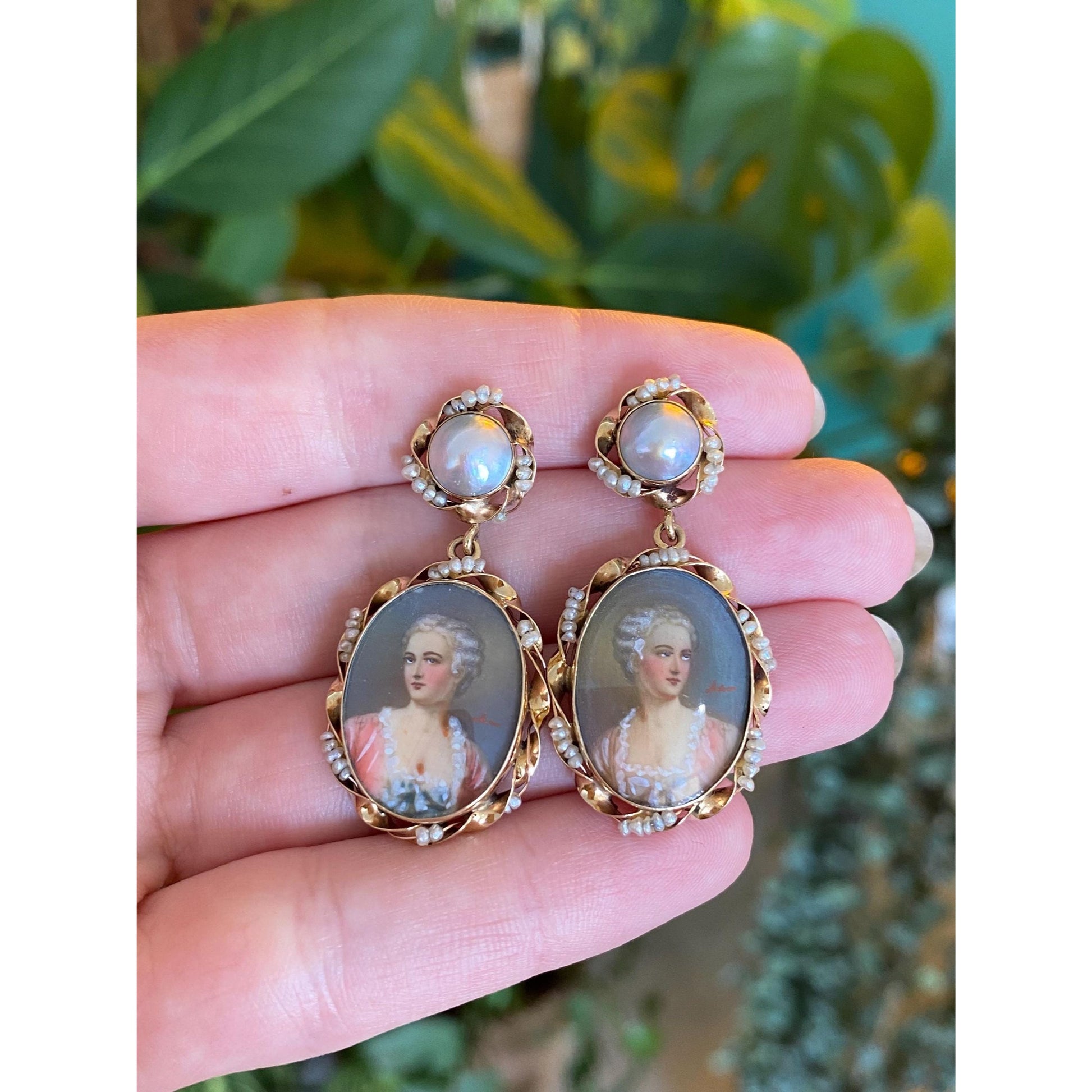 Vintage Solid 14k Yellow Gold Seed Pearl Cameo Dangle Stud Earrings