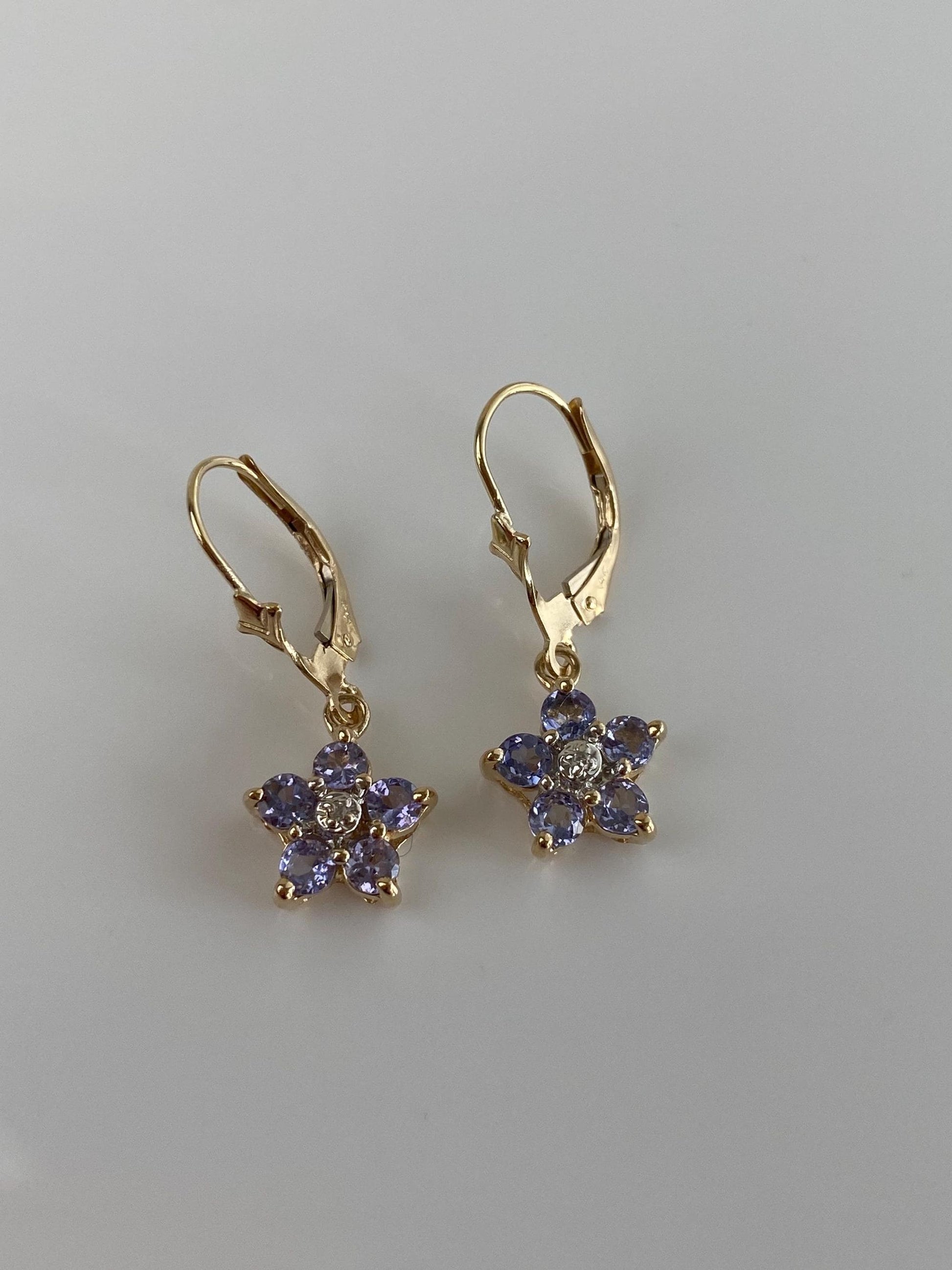 Vintage Solid 14k Yellow Gold Tanzanite Flower Dangle Earrings