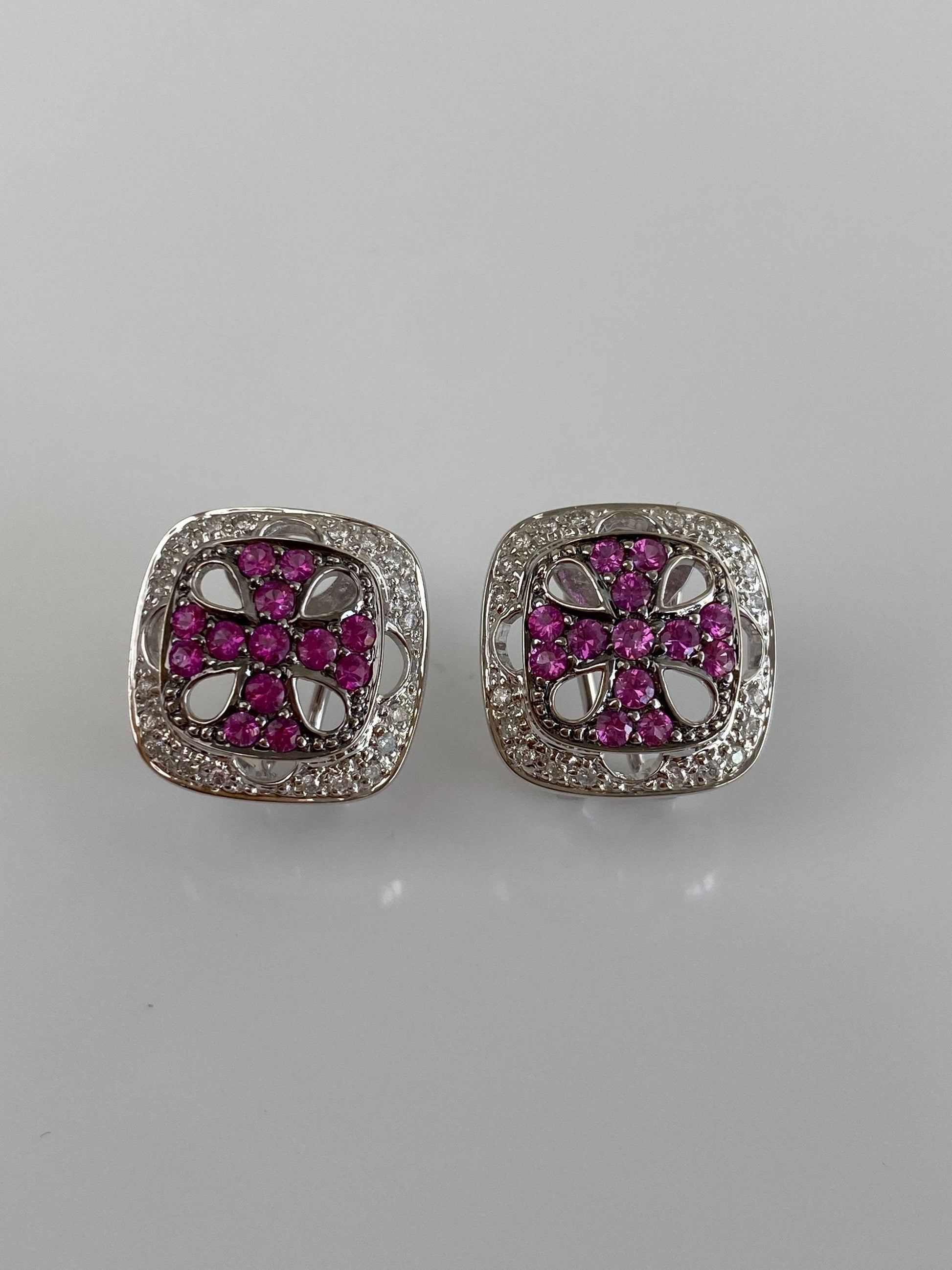 Vintage Solid 18k White Gold Diamond Halo Pink Sapphire Stud Earrings