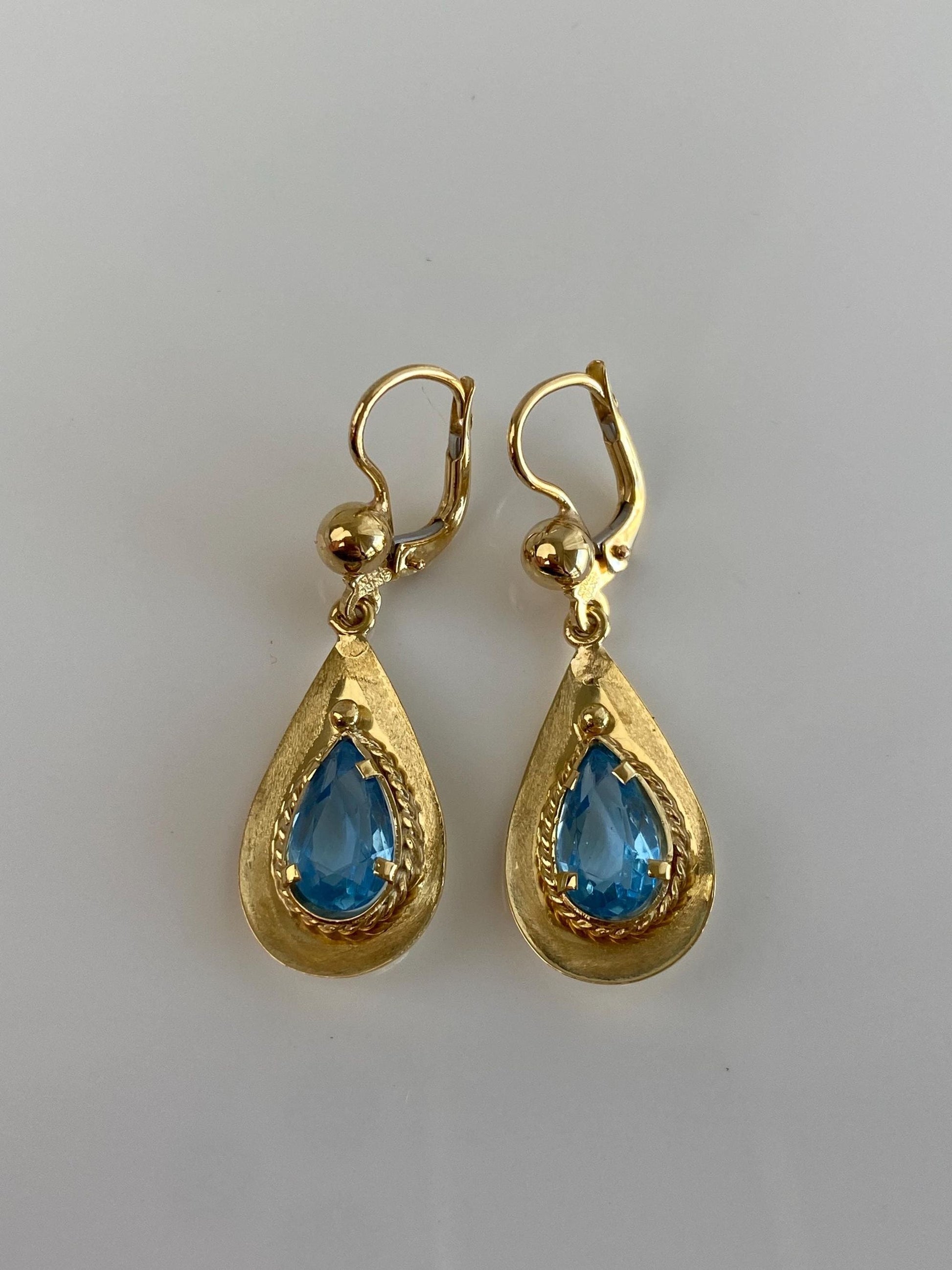 Vintage Solid 18k Yellow Gold Blue Cubic Zirconia Teardrop Dangle Earrings