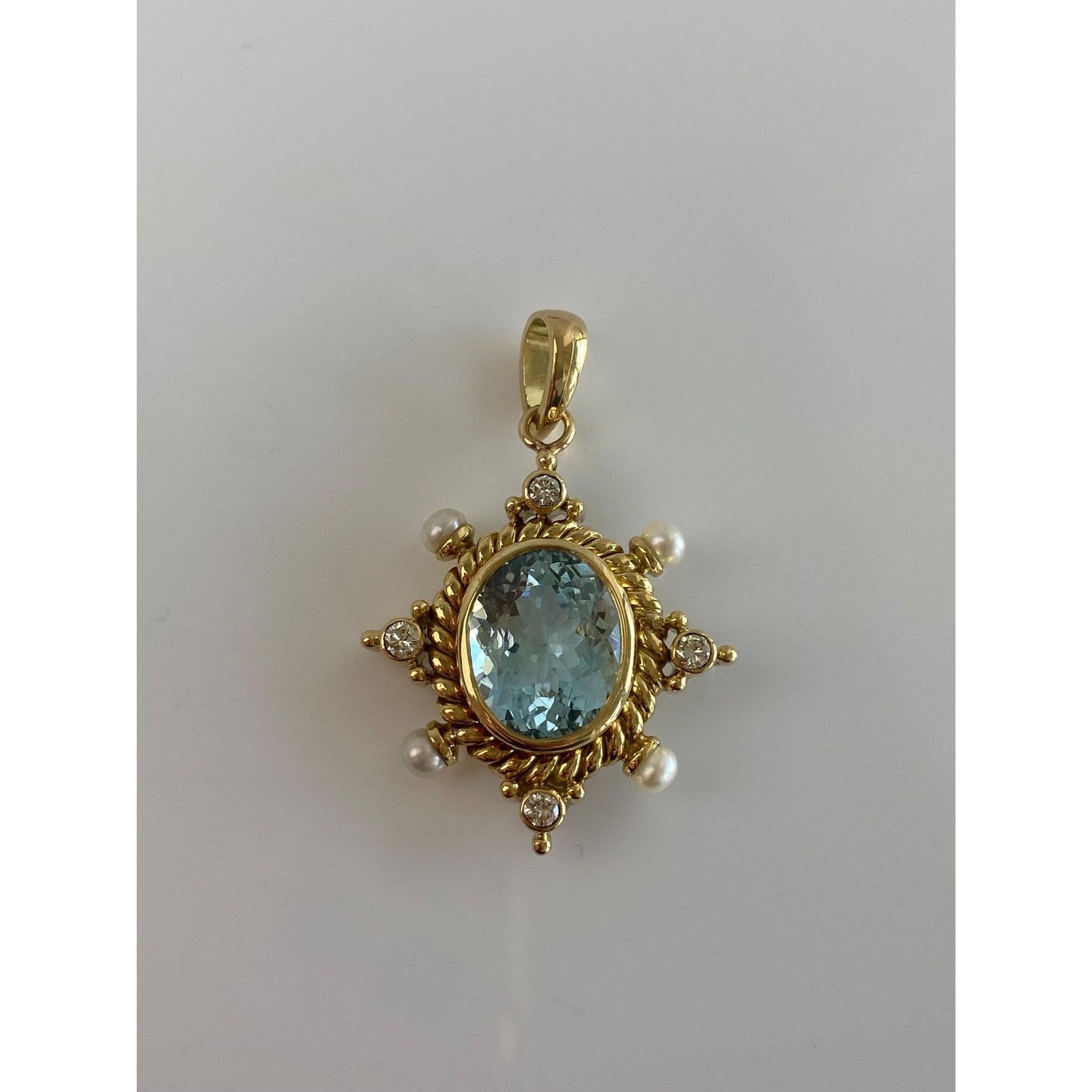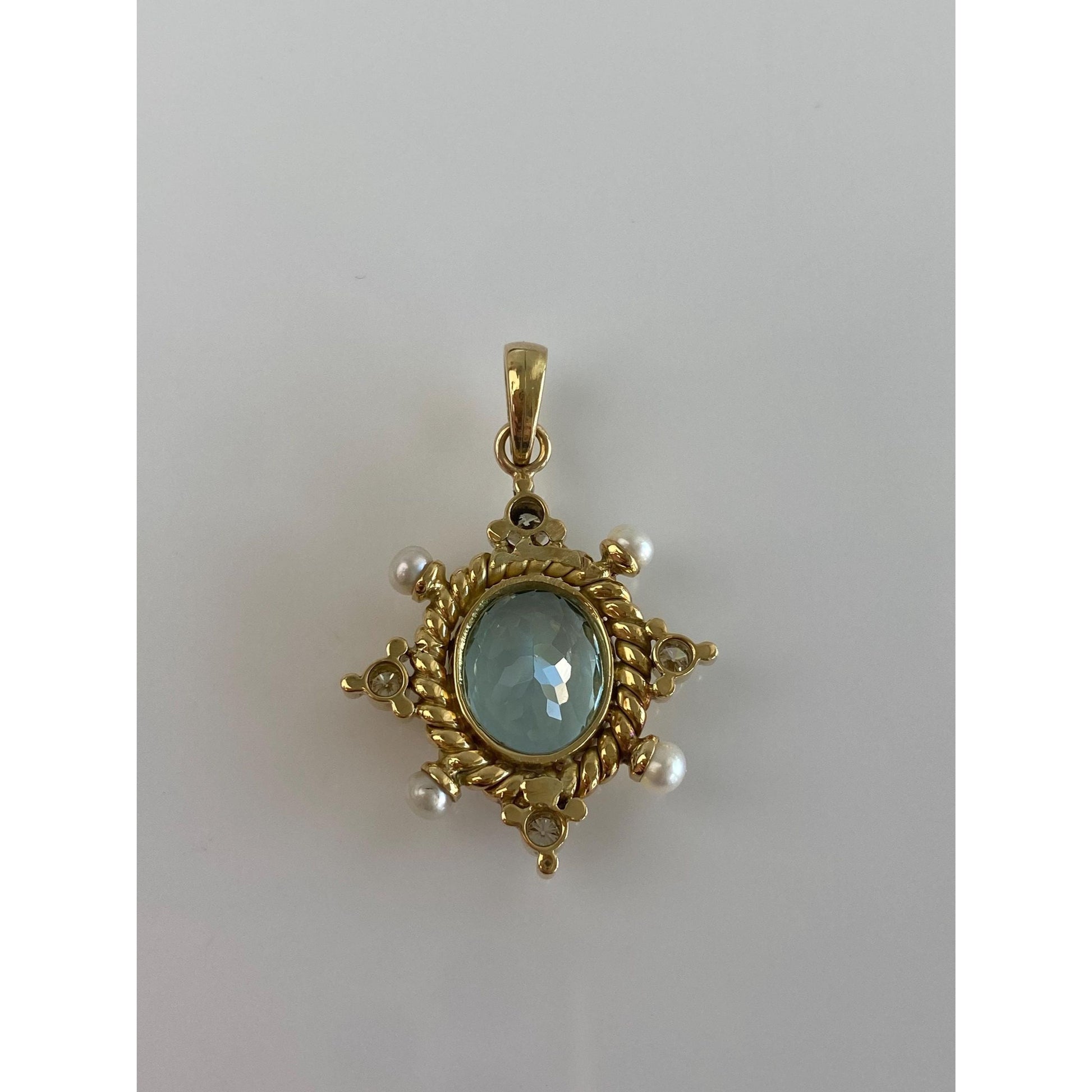 Vintage Solid 18k Yellow Gold Diamond Aquamarine Pearls Charm