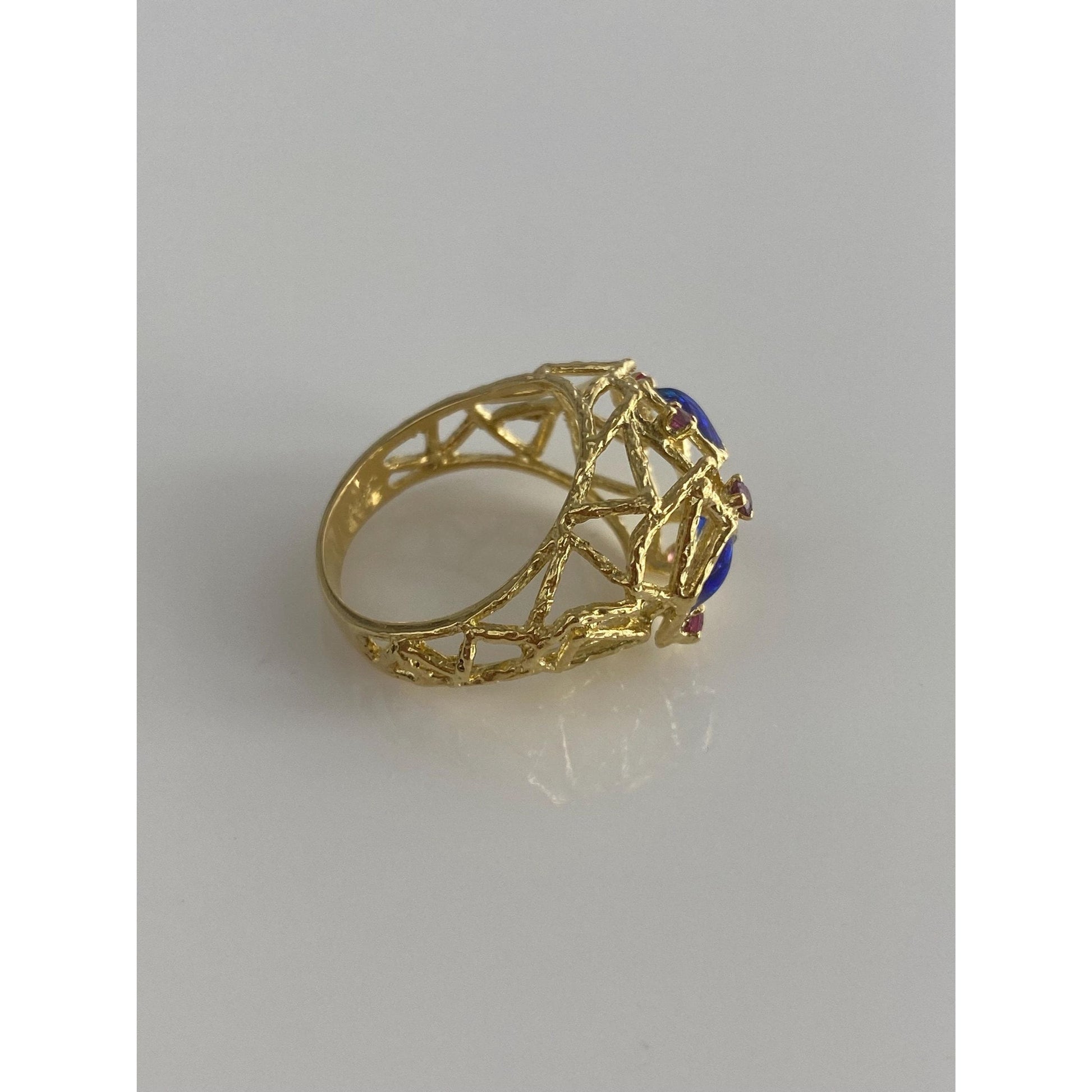 Vintage Solid 18k Yellow Gold Pink Sapphire Blue Enamel Ring - Size 6.75