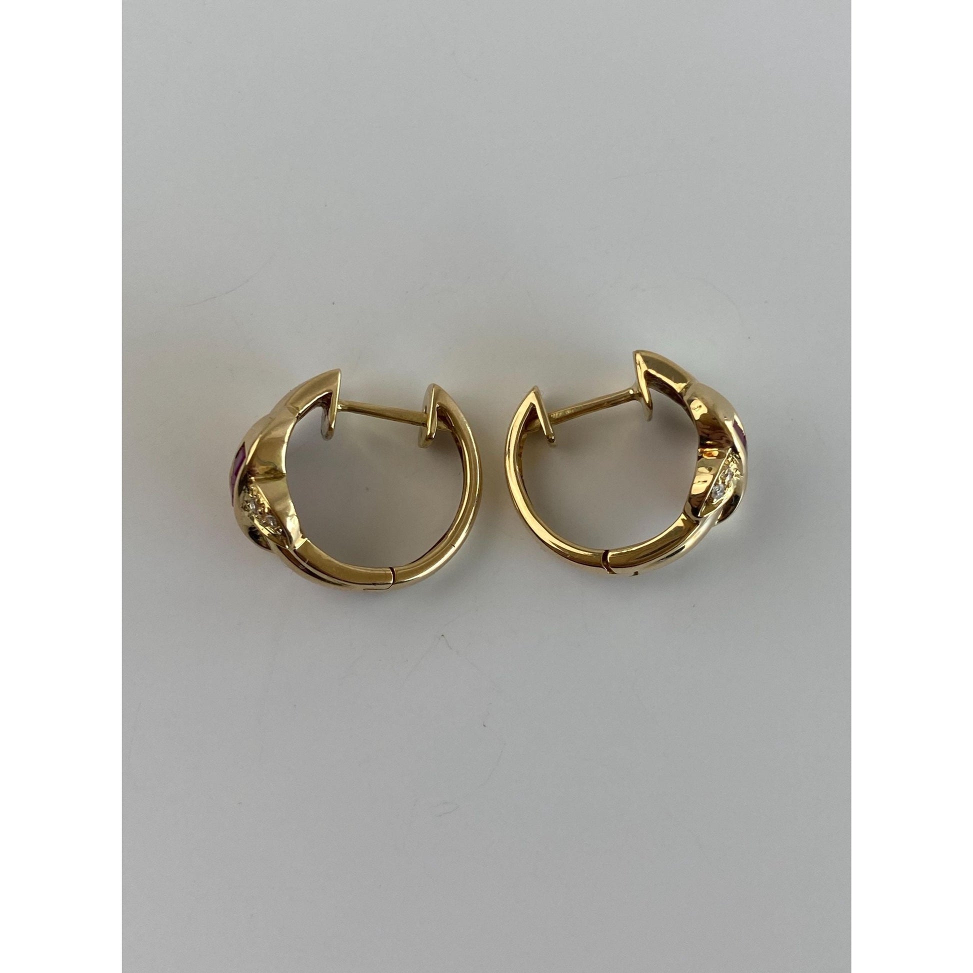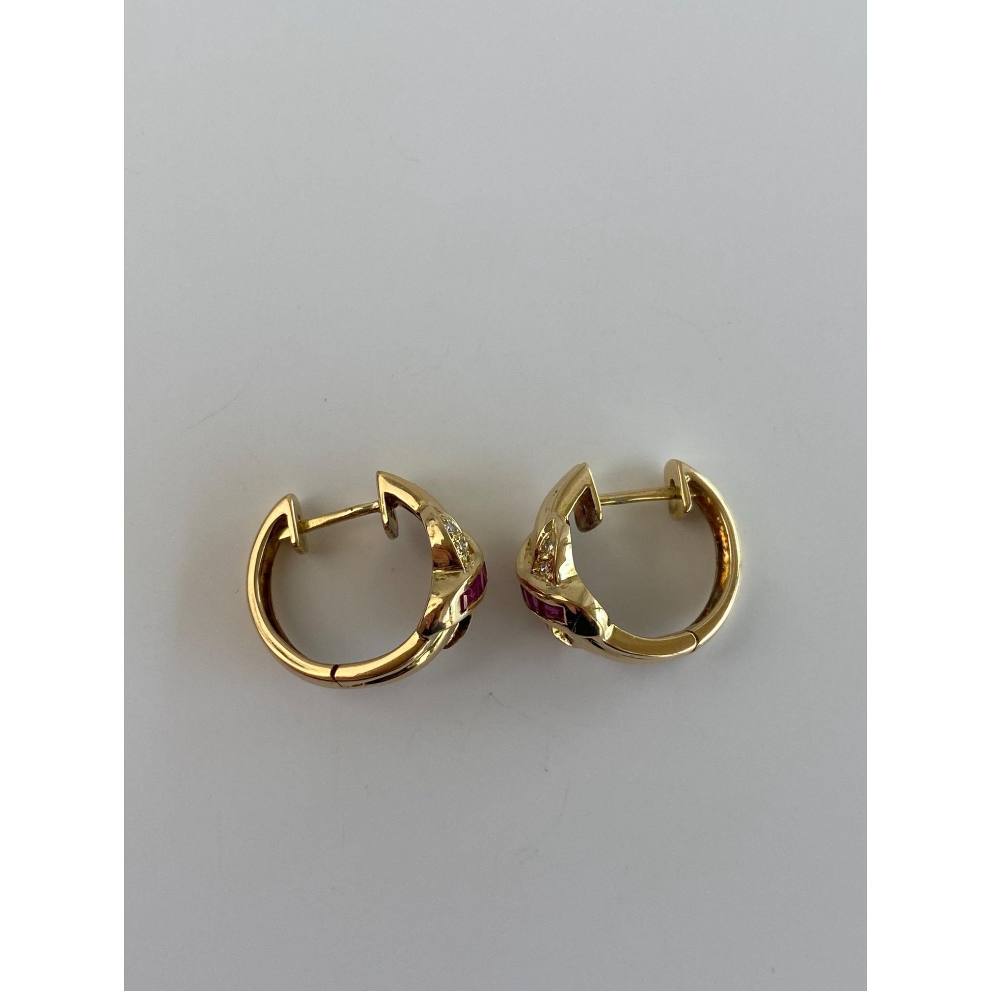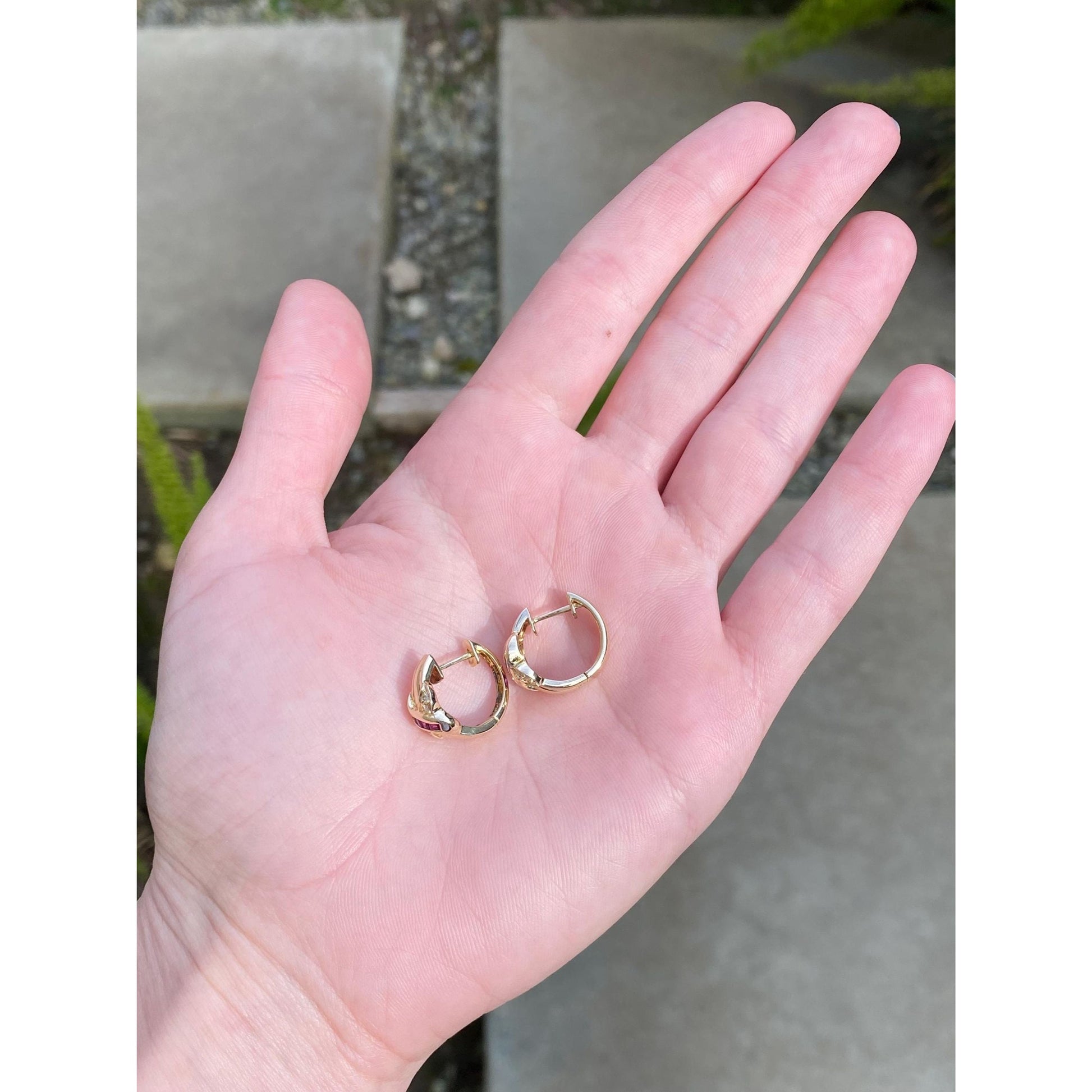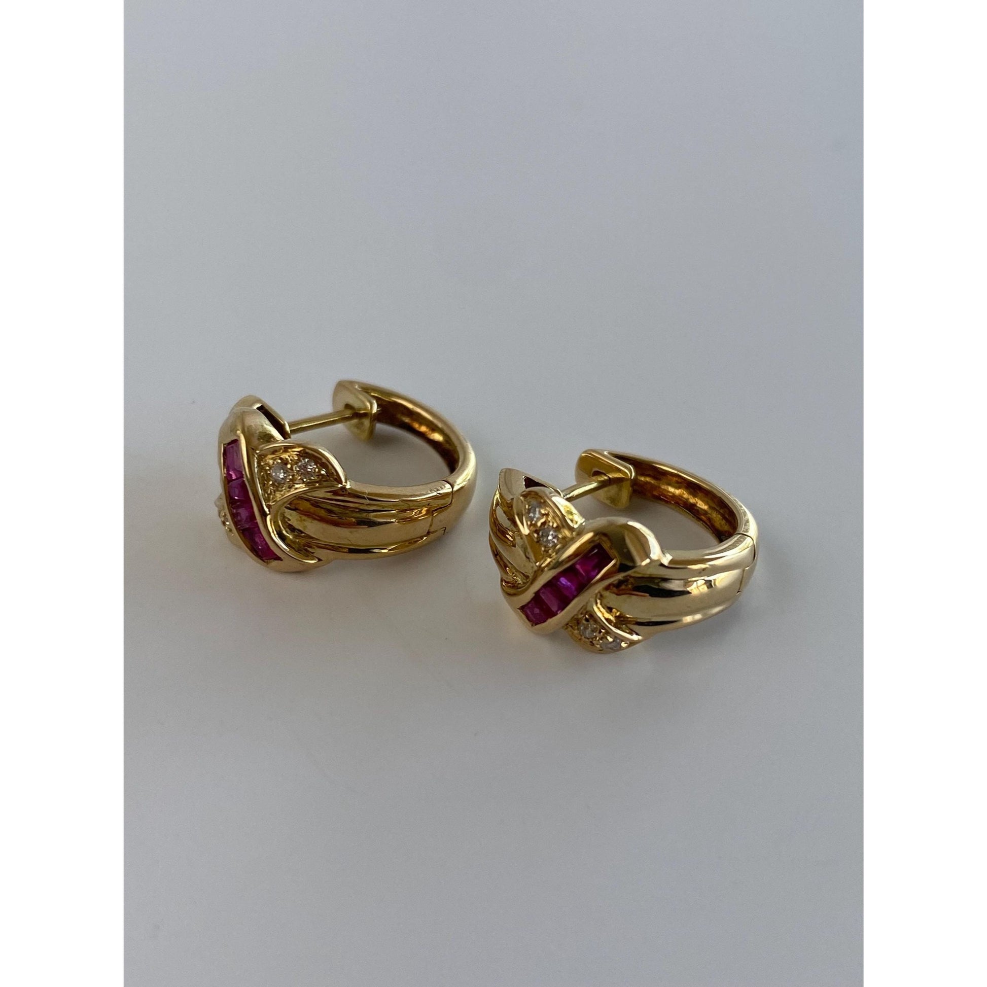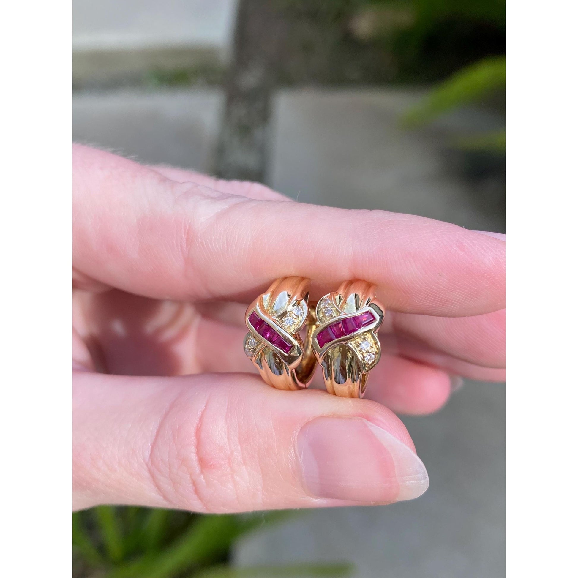Vintage Solid 18k Yellow Gold Ruby Diamond X Hoop Earrings